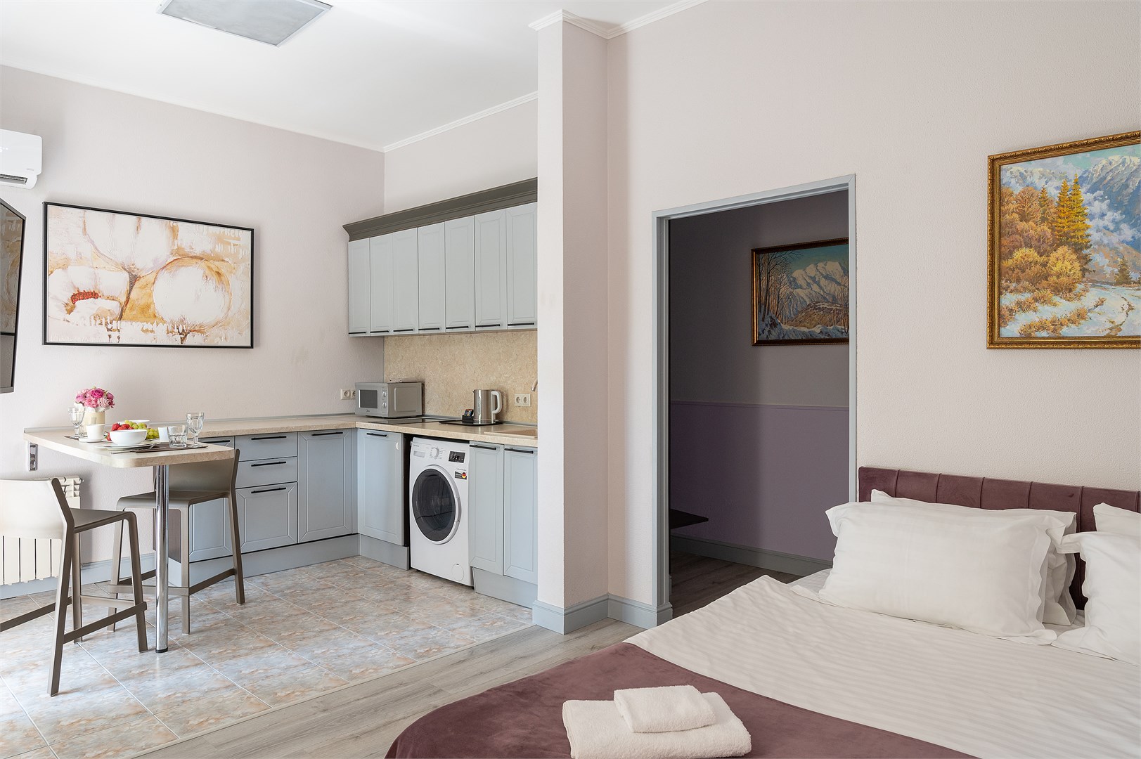 В номере: диван раскладной, зеркало, кровать двуспальная, стол, стулья, шкаф, гладильная доска, кондиционер, микроволновая печь, мини-холодильник, набор посуды, плита электрическая, стиральная машина, сушилка для белья, телевизор, утюг, чайник