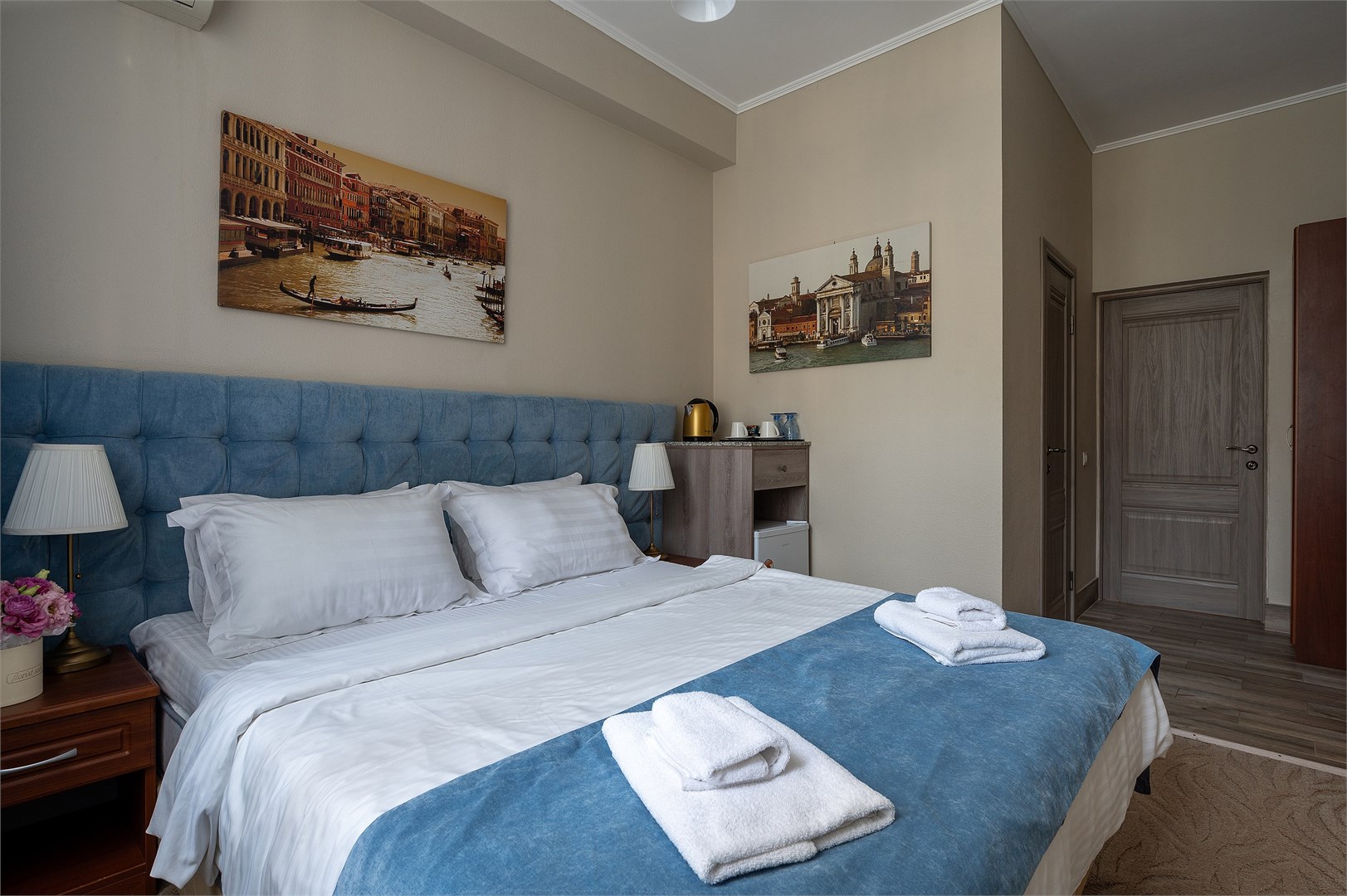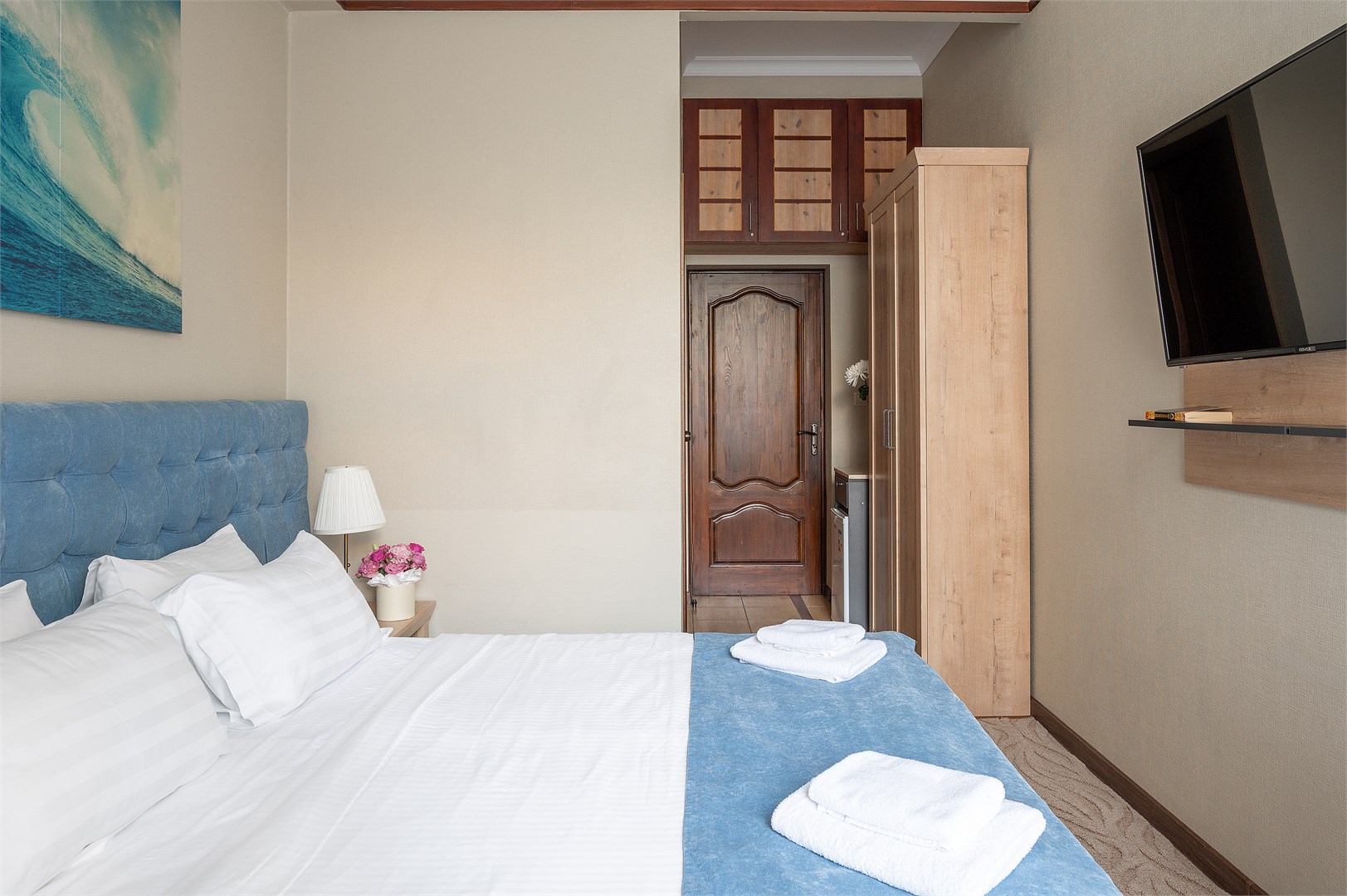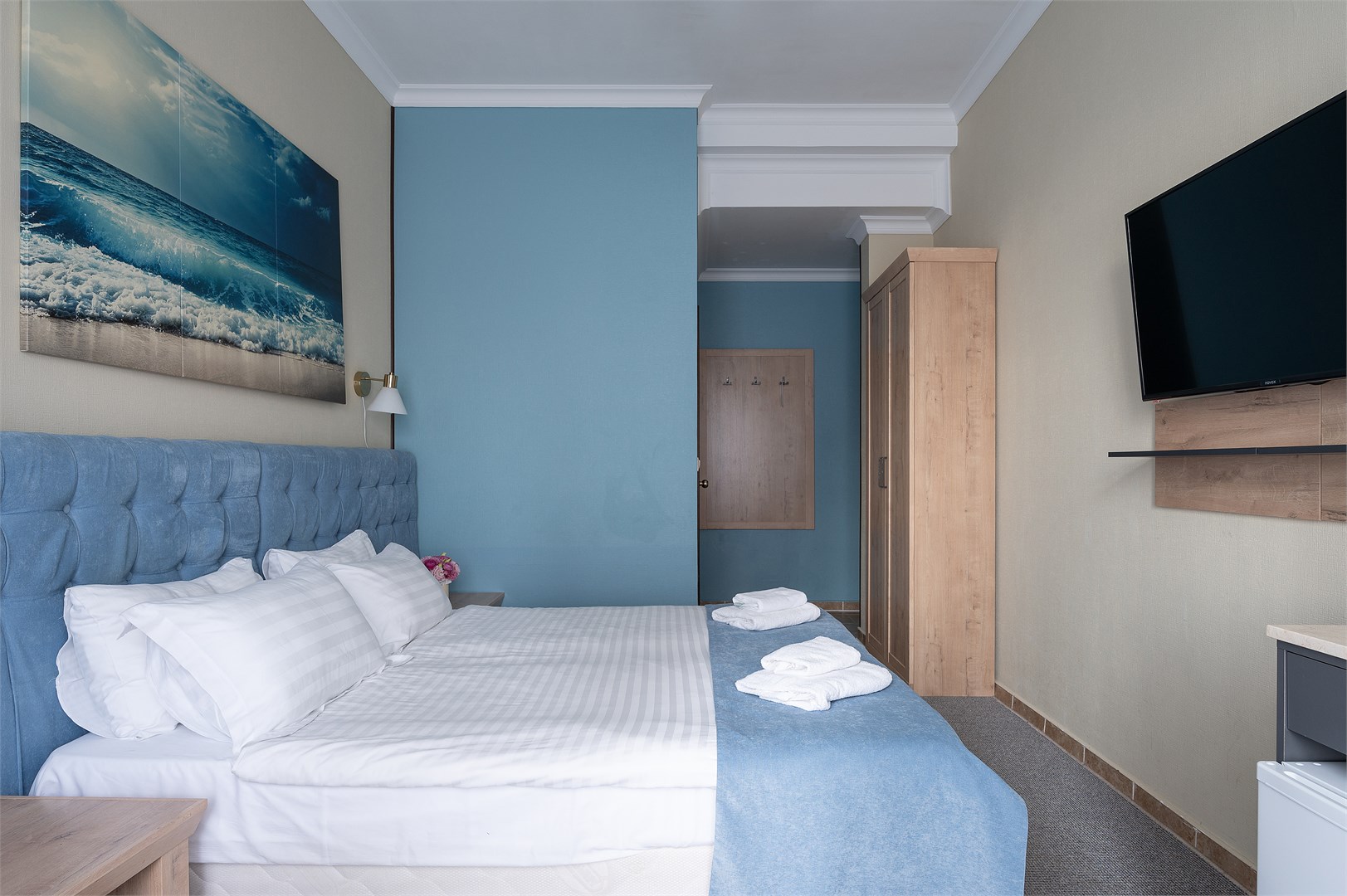 В номере: вешалка, зеркало, кровать двуспальная, тумба, шкаф, кондиционер, телевизор, холодильник, чайник, чайный набор посуды