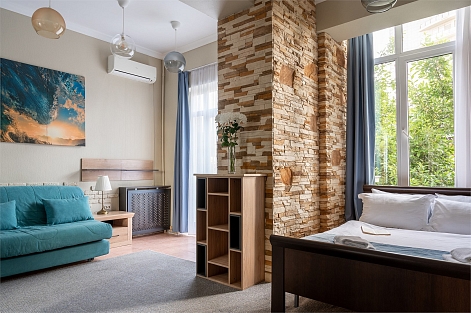 В номере: вешалка, диван раскладной, зеркало, кровать двуспальная, стол, стул, шкаф, кондиционер, телевизор, холодильник, чайник, чайный набор посуды
