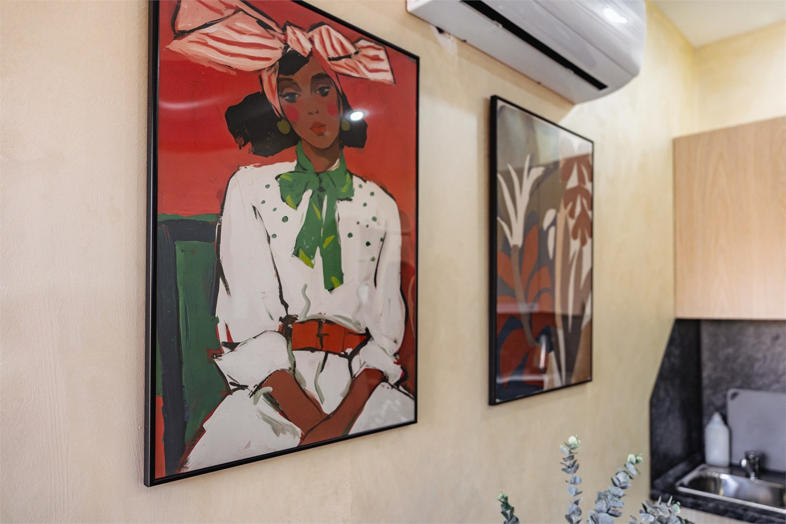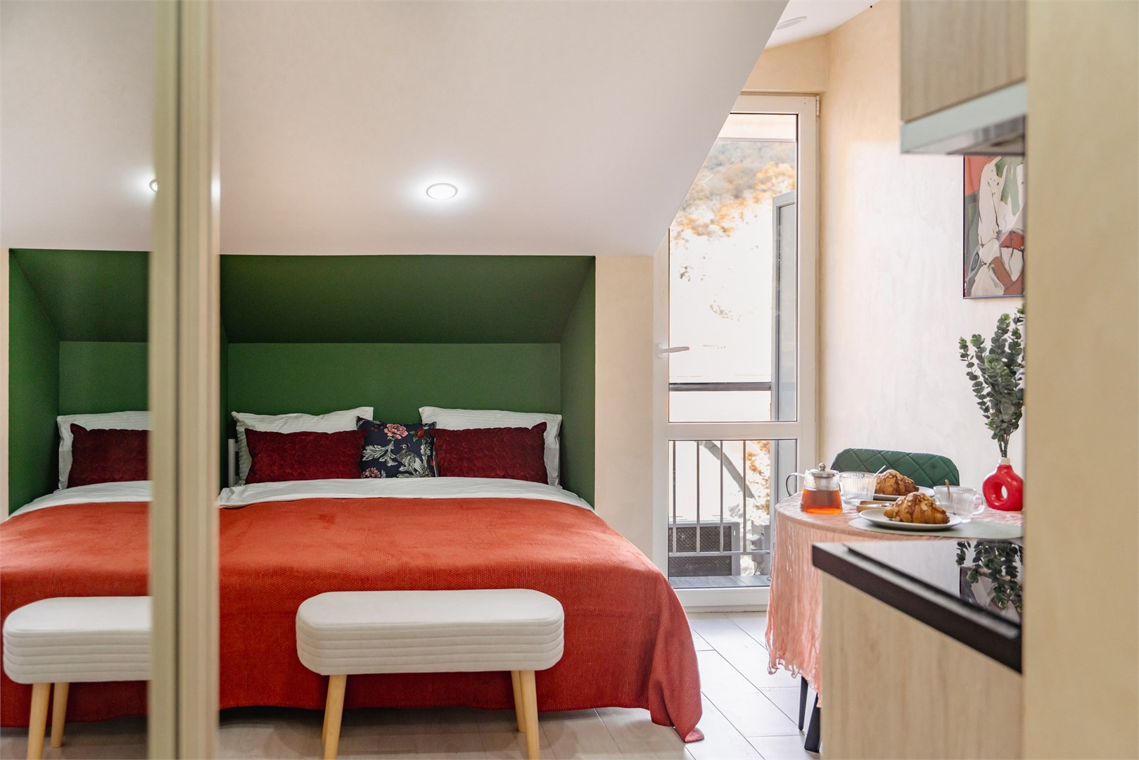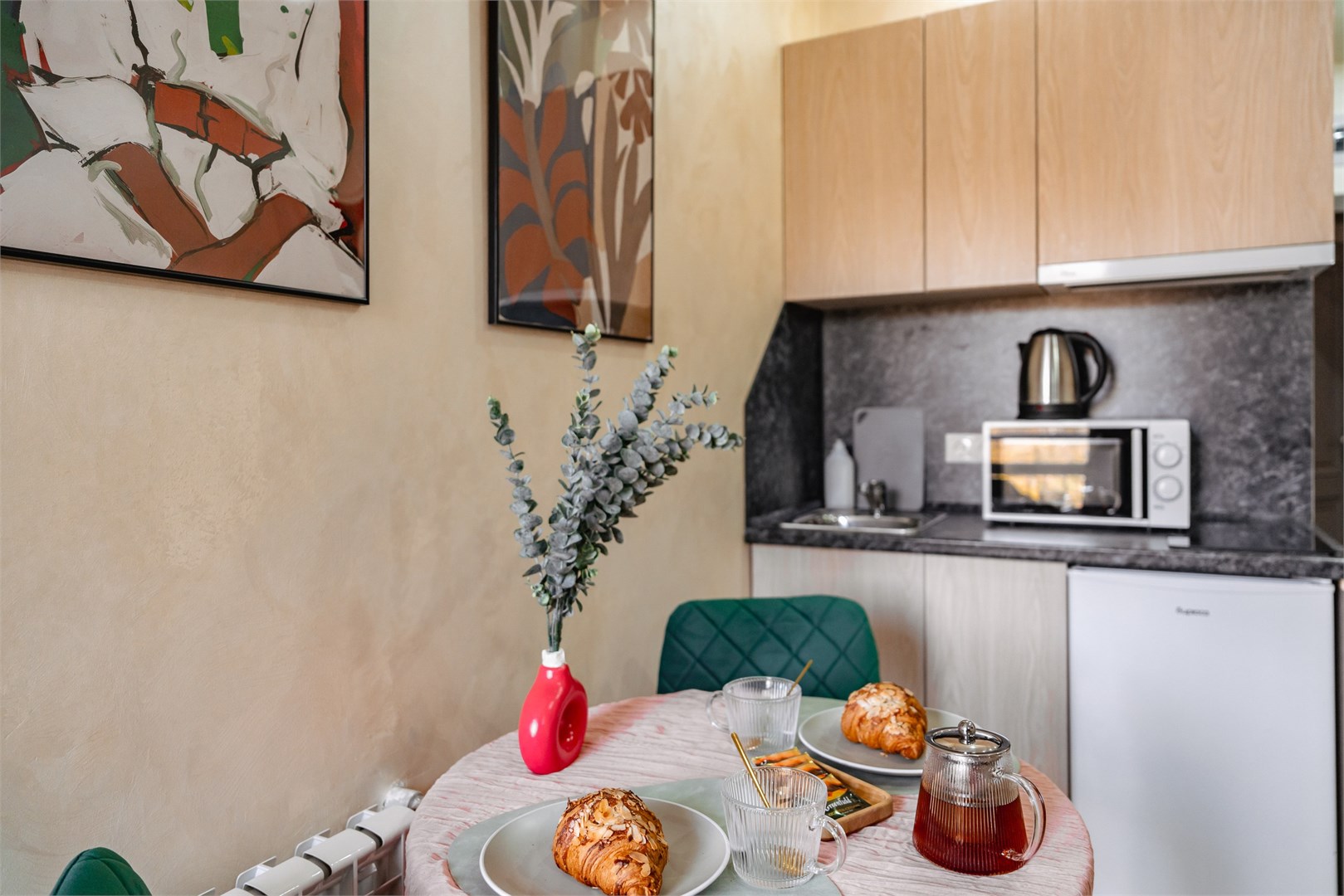 В номере: вешалка, зеркало, кровать двуспальная, стол, стулья, шкаф, гладильная доска, микроволновая печь, плита индукционная, сплит-система, стиральная машина, сушилка для белья, телевизор, утюг, холодильник, чайный набор посуды, электрочайник
