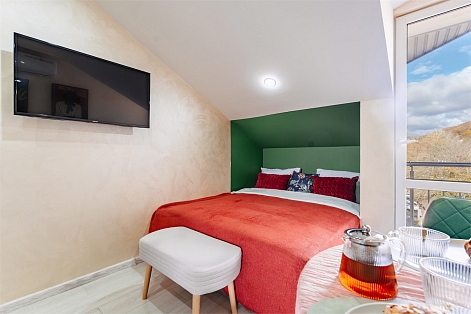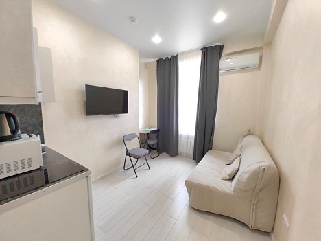 В номере: вешалка, диван раскладной, зеркало, стол, стулья, шкаф, гладильная доска, микроволновая печь, набор посуды, телевизор, утюг, холодильник, чайный набор посуды, электрочайник