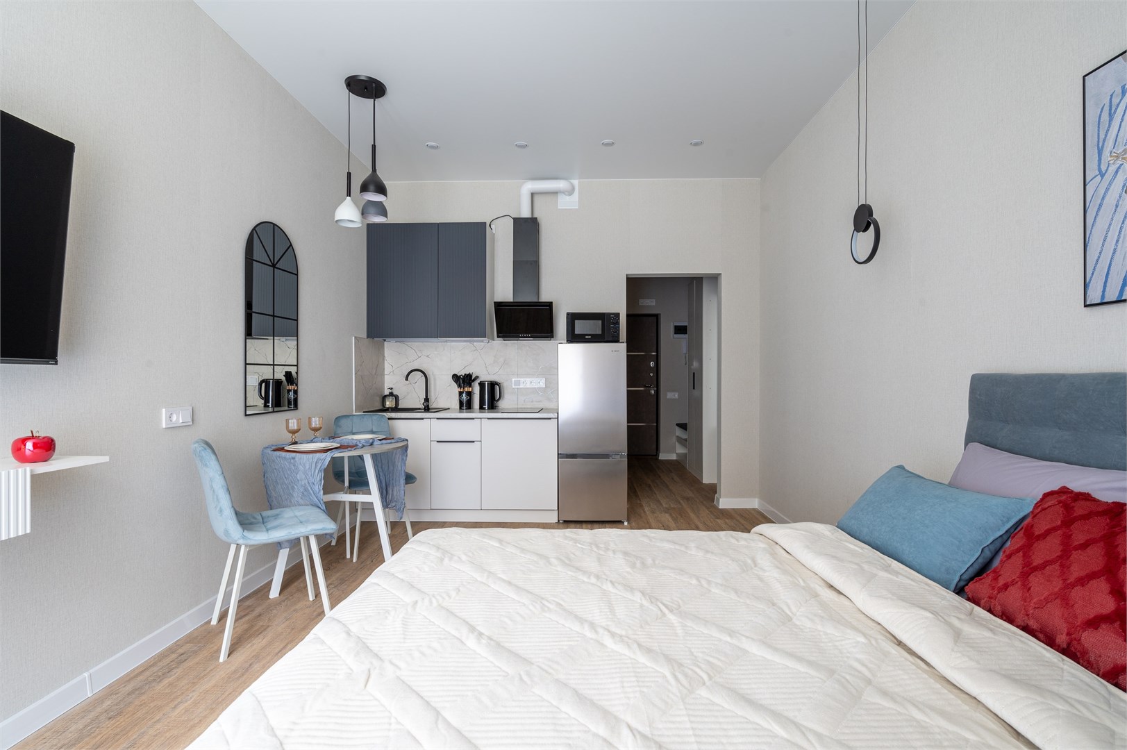 В номере: вешалка, зеркало, кровать двуспальная, стол, стулья, шкаф, кондиционер, микроволновая печь, набор посуды, плита электрическая, стиральная машина, телевизор, холодильник, чайник
