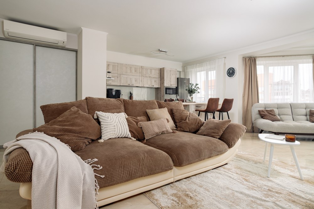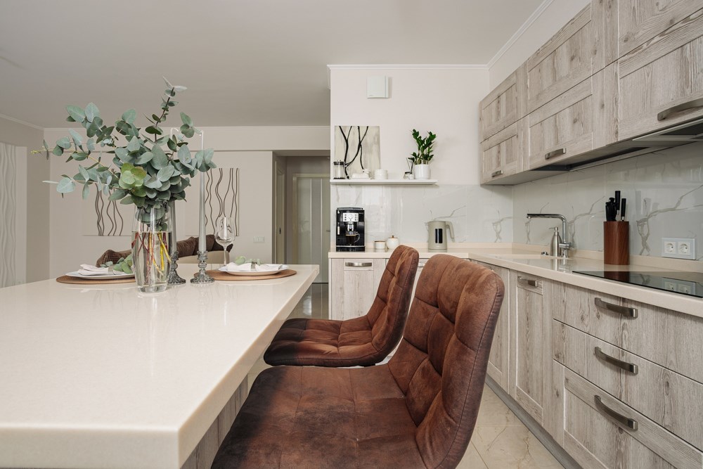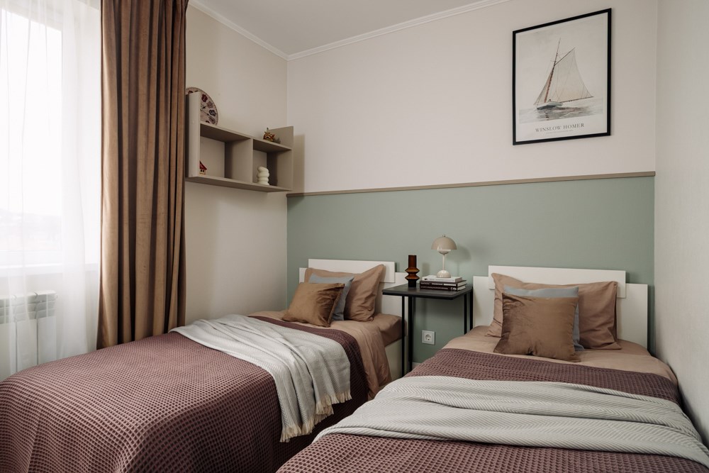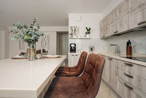 Дизайнерский интерьер, выполненный в современном стиле, создает атмосферу релаксации и гармонии. В апартаментах современный комфорт сочетается с домашним уютом. Апартаменты рассчитаны на размещение 6 гостей и полностью оборудованы всем необходимым для идеального отдыха: от современной бытовой техники до уютных мелочей, создающих атмосферу дома.