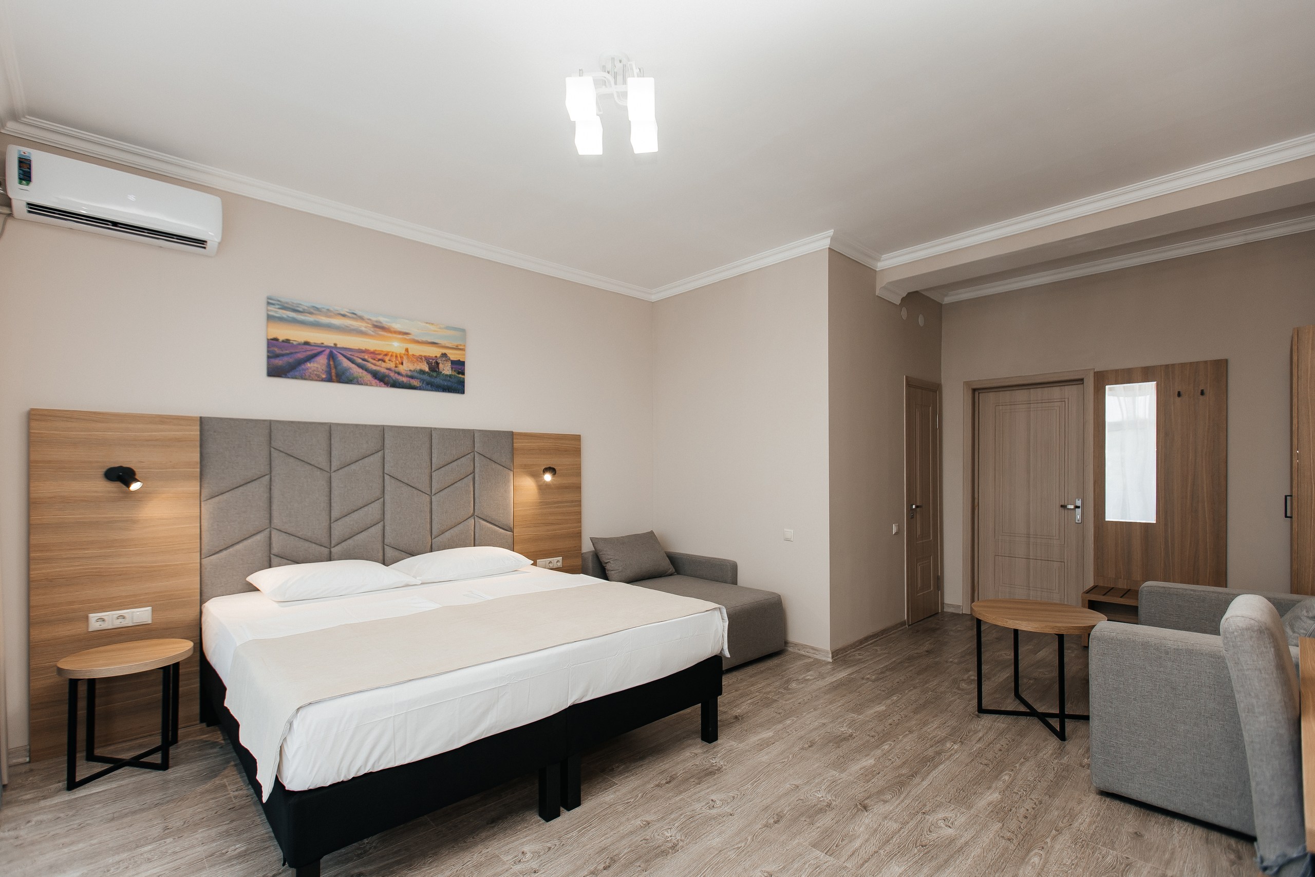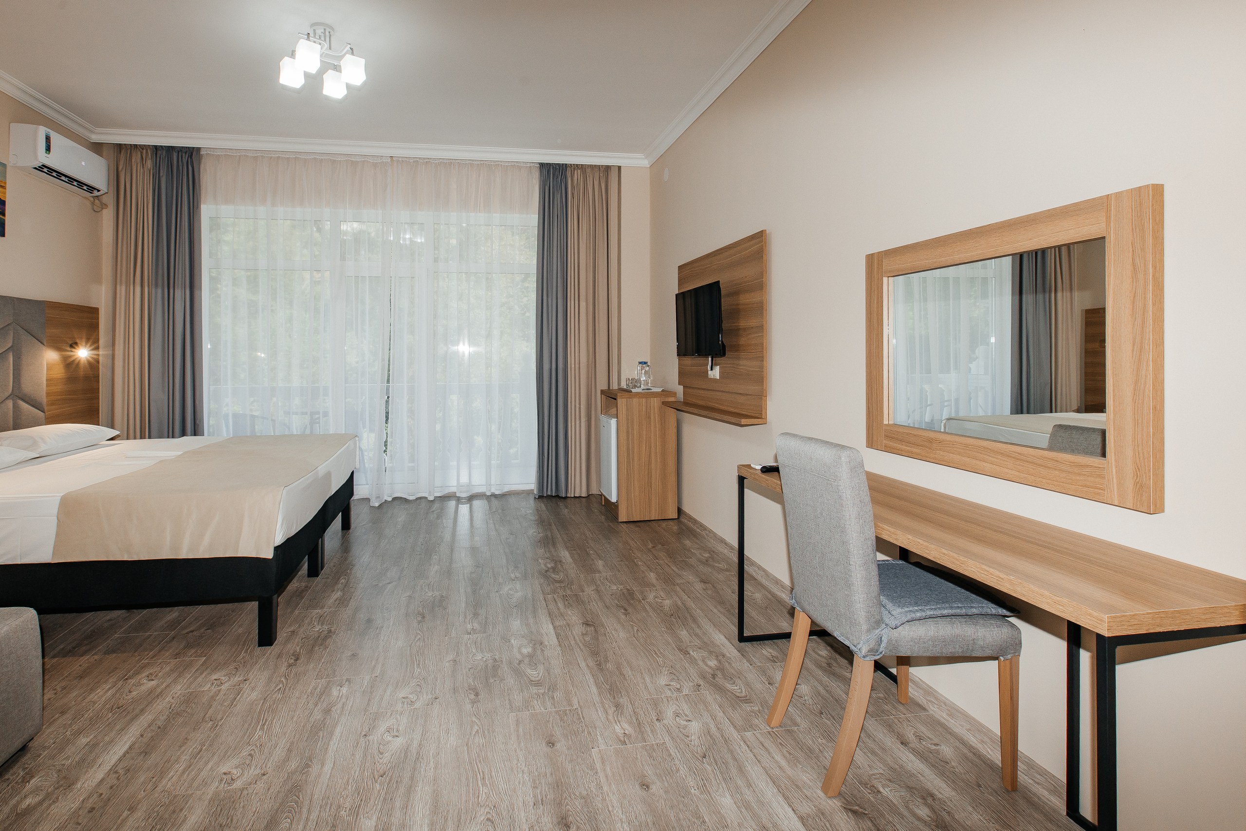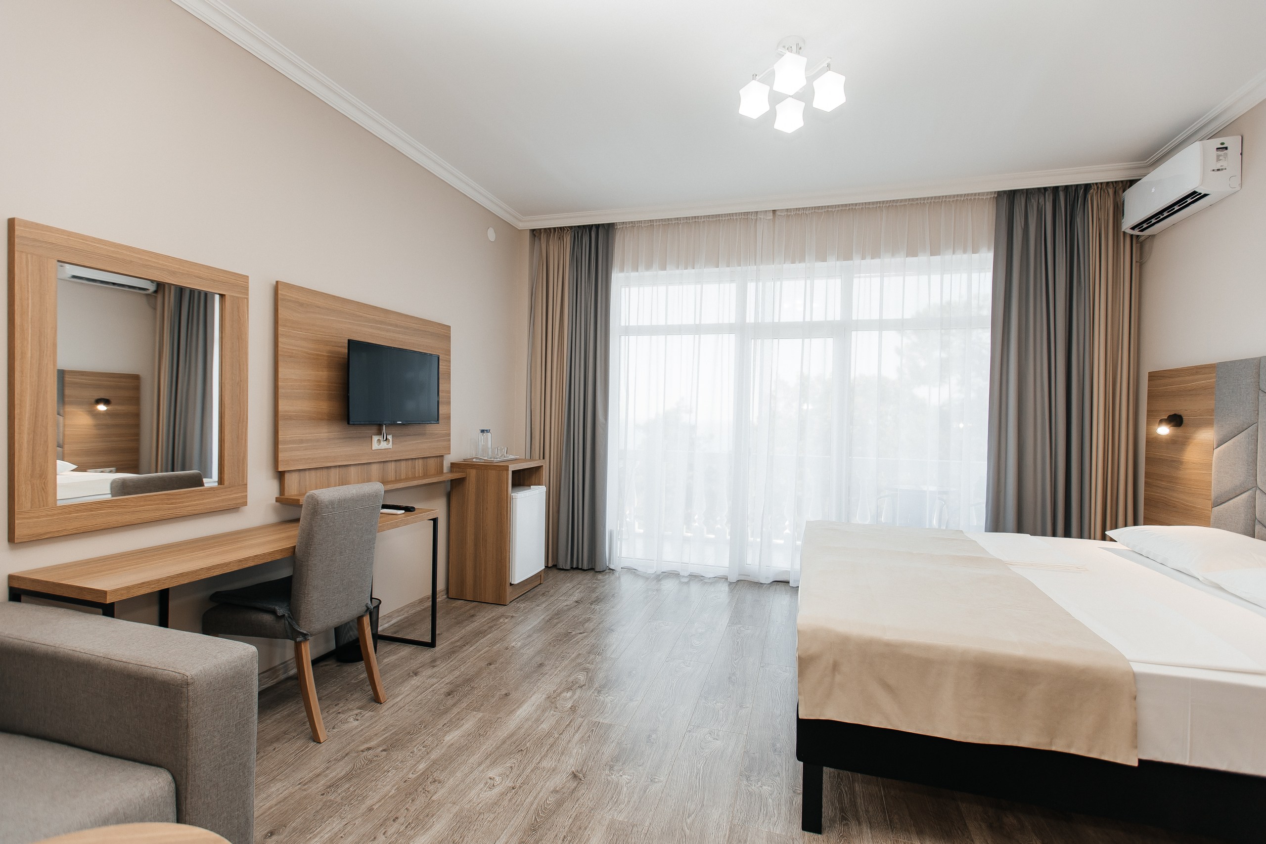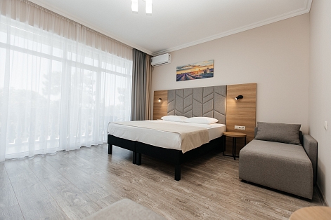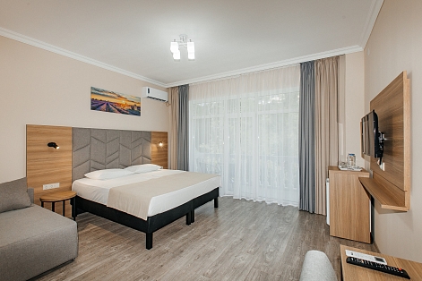 В номере: вешалка, диван раскладной, зеркало, кресло-кровать, кровать двуспальная, прикроватные тумбочки, шкаф, кондиционер, телевизор, холодильник, чайный набор посуды