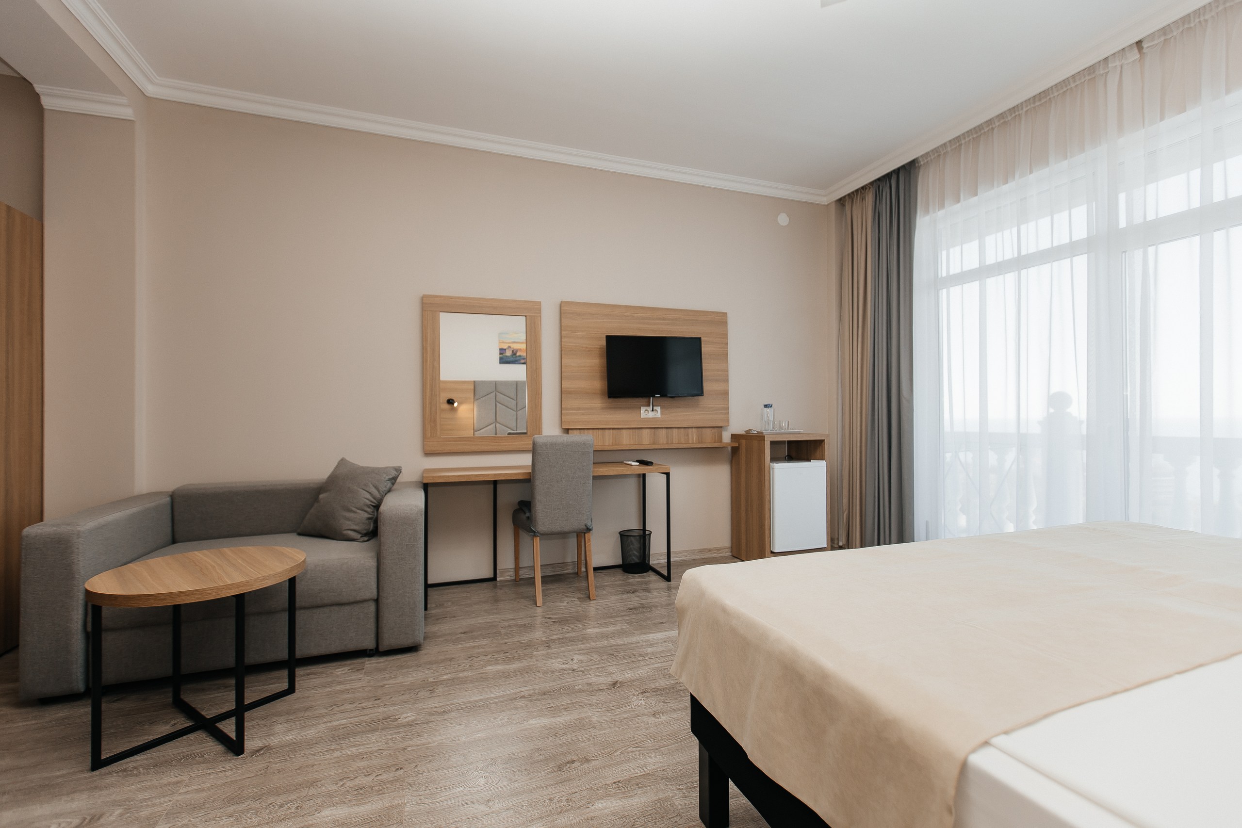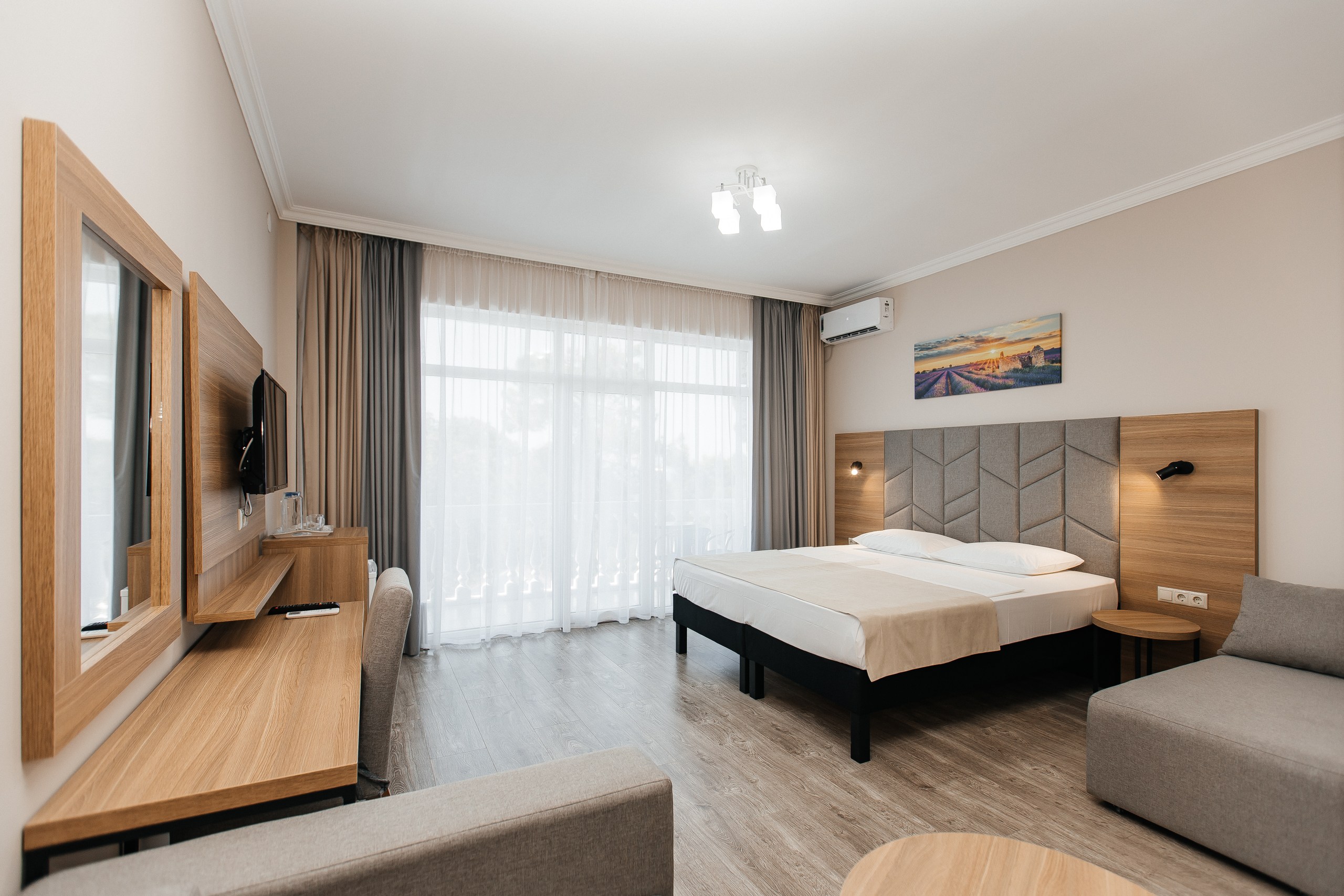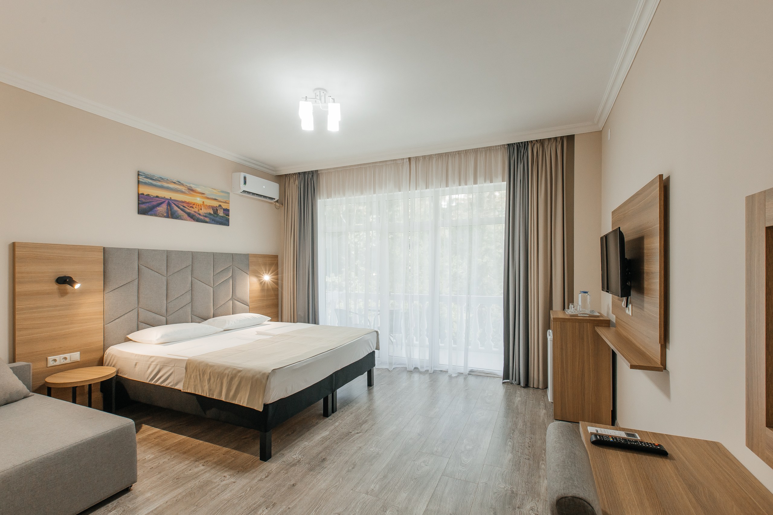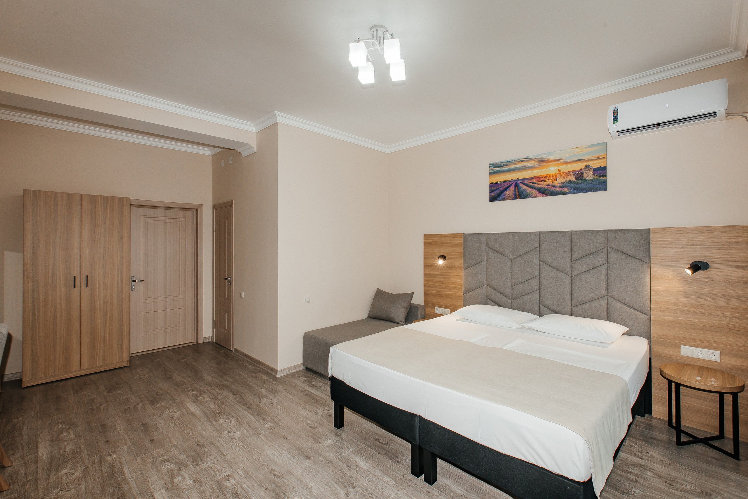 В номере: вешалка, диван раскладной, зеркало, кресло-кровать, кровать двуспальная, прикроватные тумбочки, шкаф, кондиционер, телевизор, холодильник, чайный набор посуды