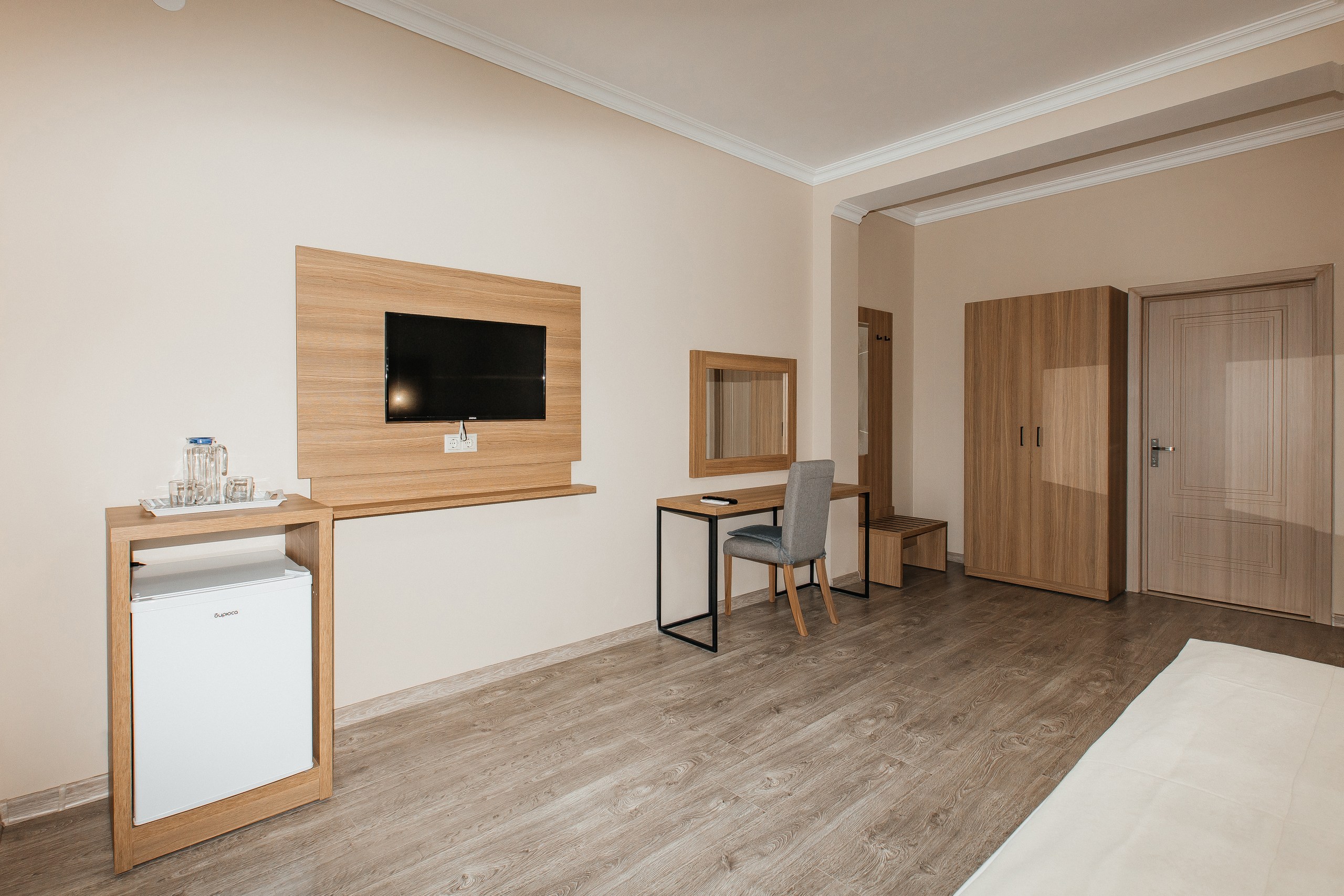 В номере: вешалка, зеркало, кресло-кровать, кровать двуспальная, прикроватные тумбочки, шкаф, кондиционер, телевизор, холодильник, чайный набор посуды