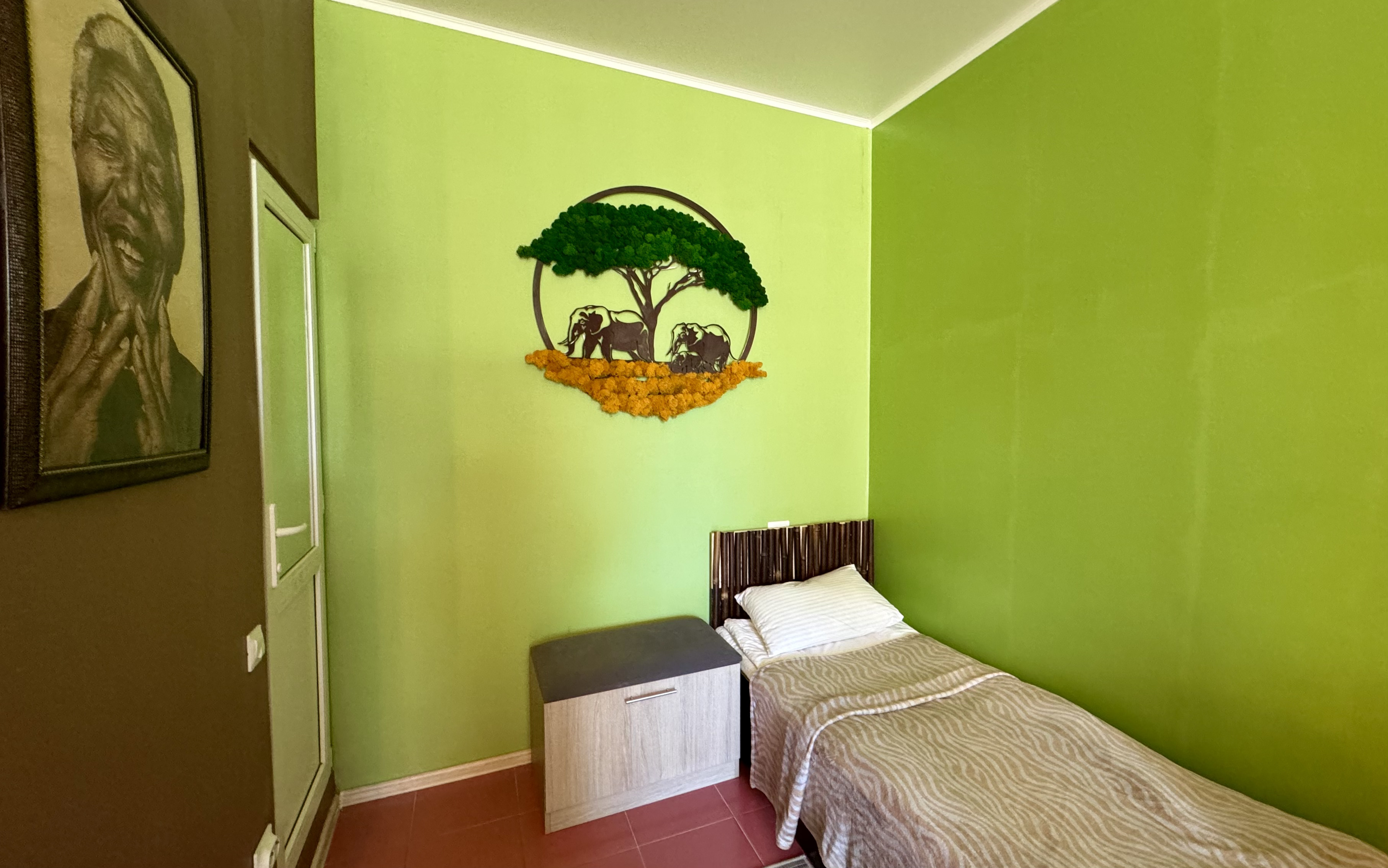 В номере: зеркало, комод, кровать односпальная, прикроватные тумбочки, шкаф, кондиционер