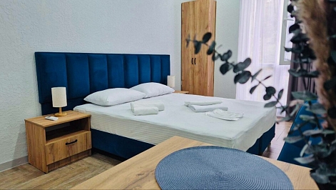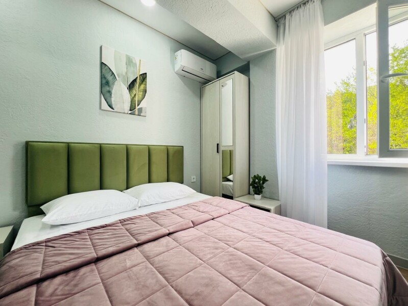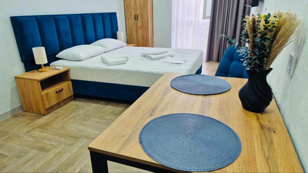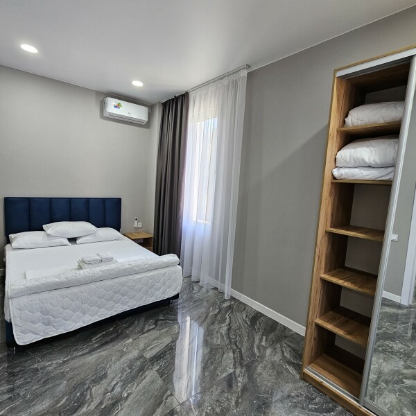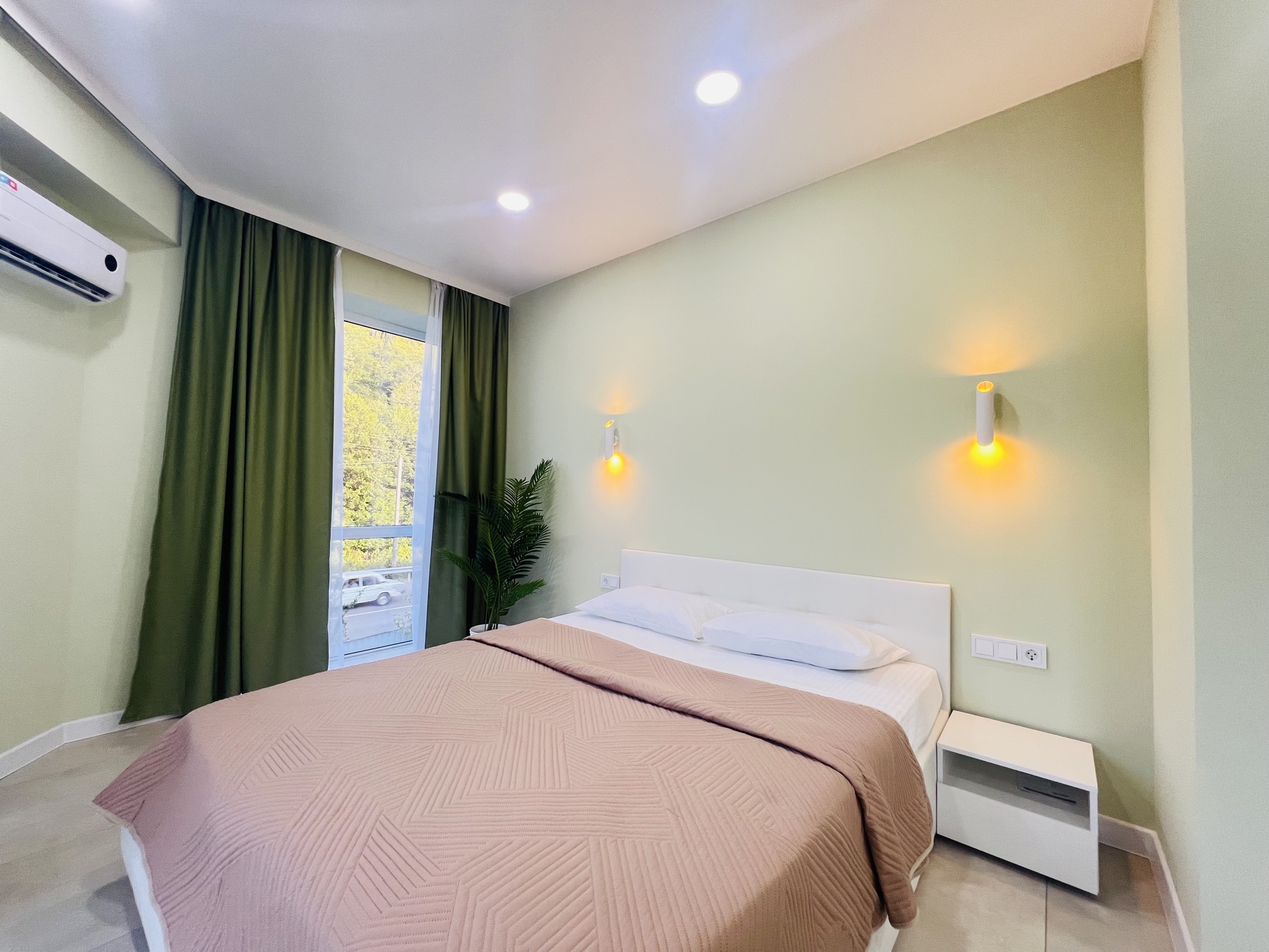 В номере: диван раскладной, зеркало, кровать двуспальная, прикроватные тумбочки, стол, стулья, шкаф, гладильная доска, набор посуды, плита электрическая, сплит-система, сушилка для белья, телевизор, утюг, холодильник
