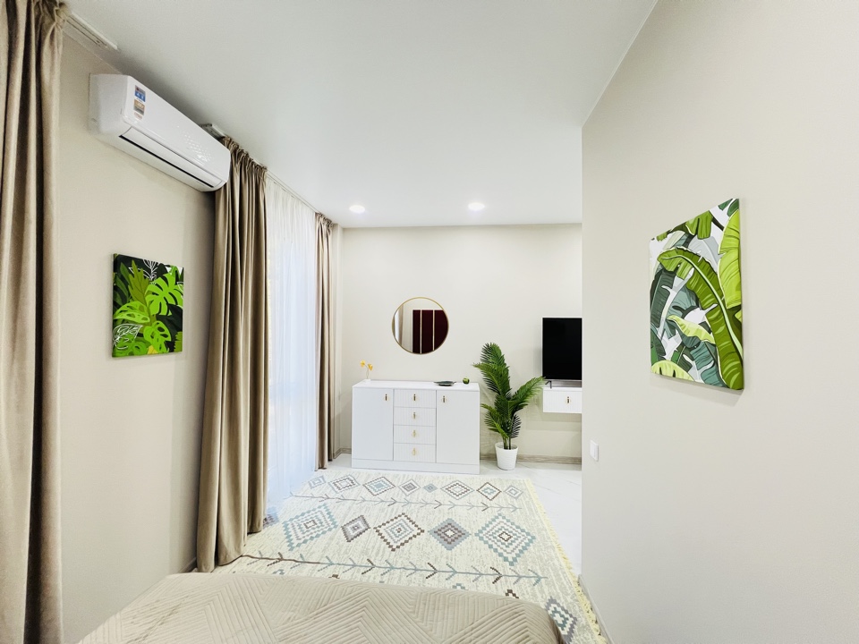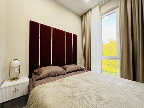 В номере: диван раскладной, зеркало, комод, кровать двуспальная, прикроватные тумбочки, стол, стулья, шкаф, гладильная доска, кофемашина, микроволновая печь, набор посуды, плита электрическая, посудомоечная машина, сплит-система, сушилка для белья, телевизор, утюг, холодильник