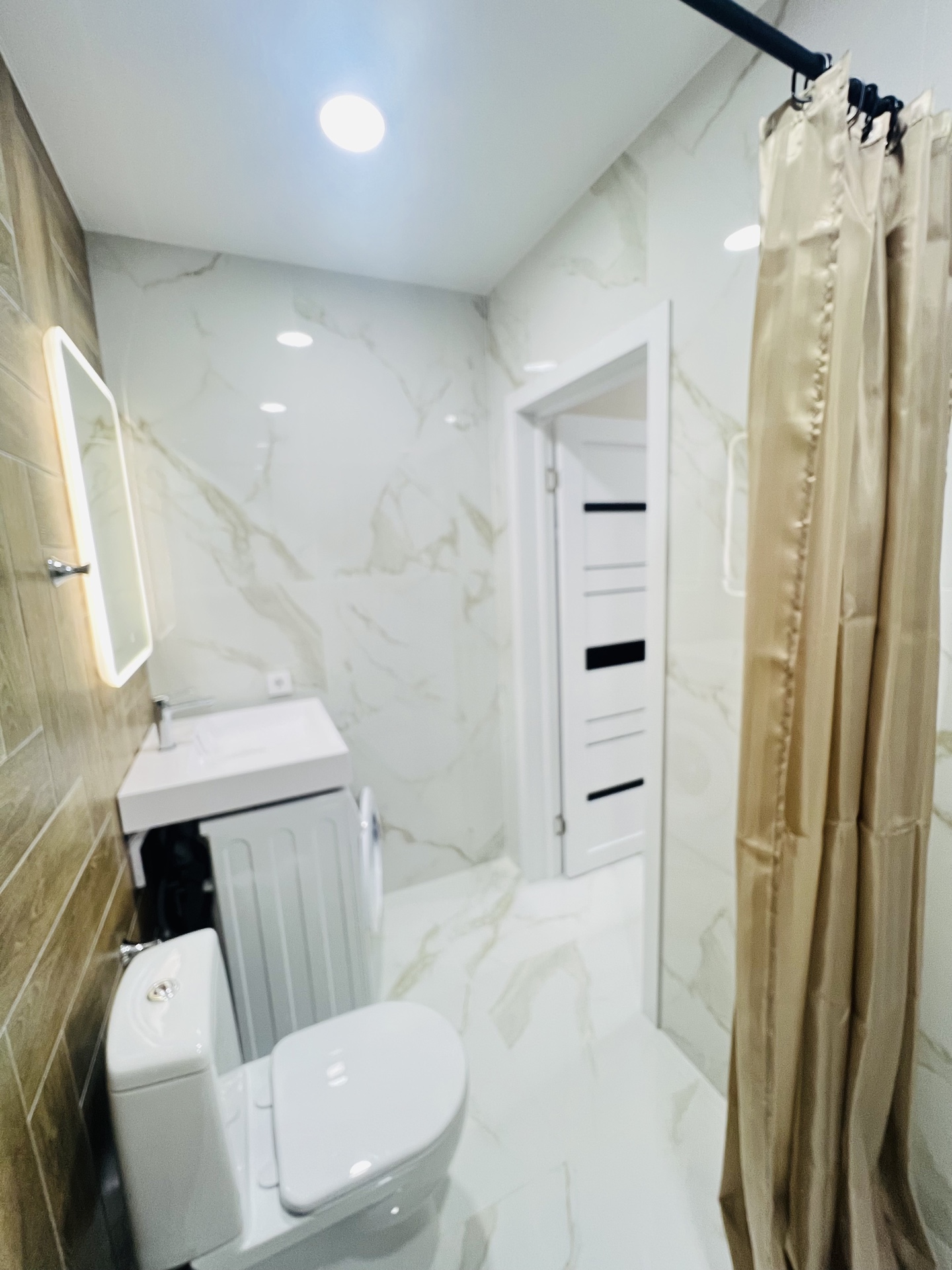 Санузел: с душем, тапочки, туалетные принадлежности, фен, халат