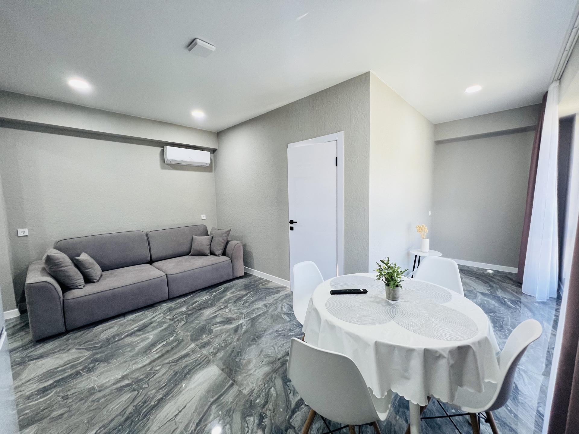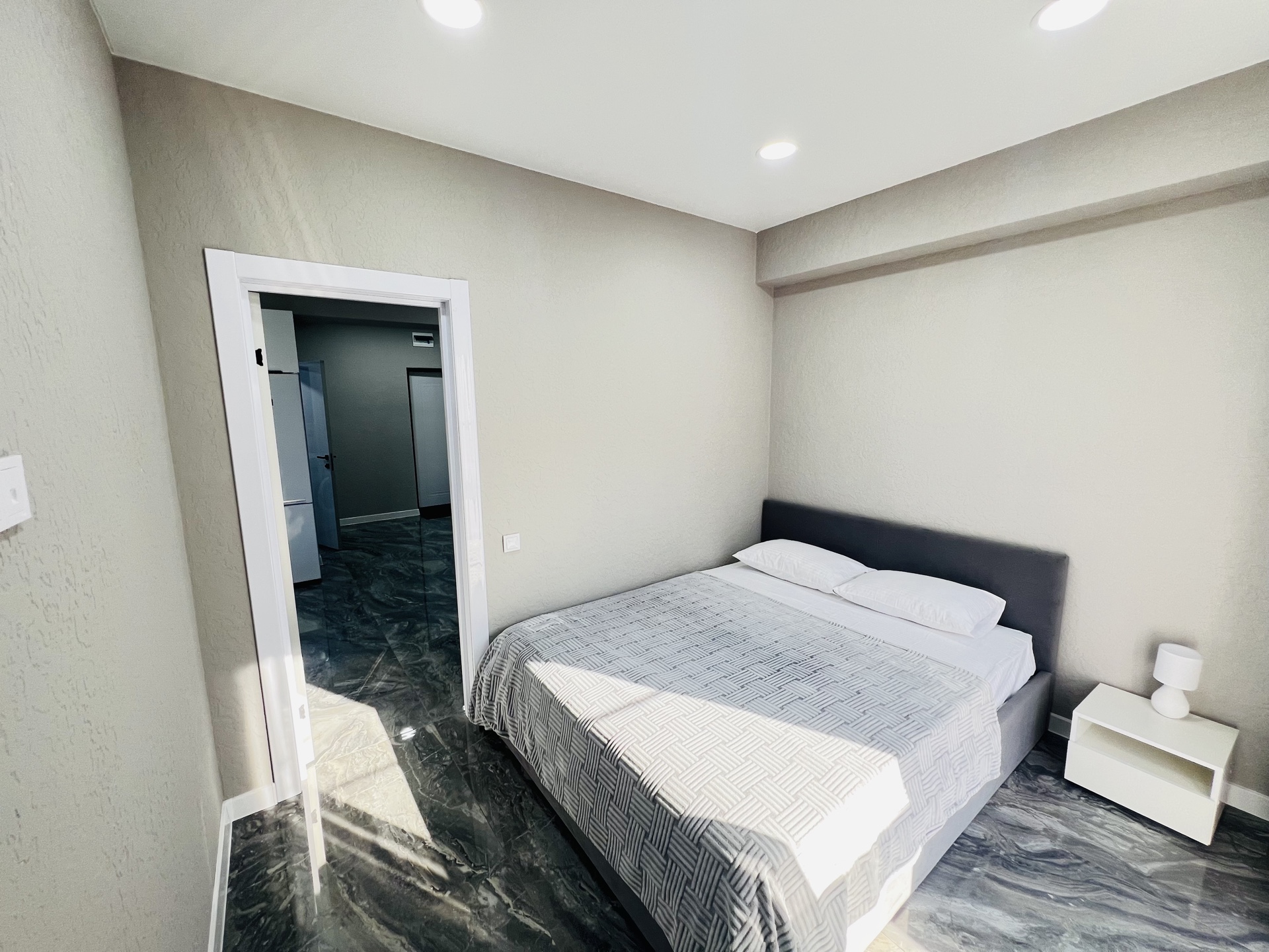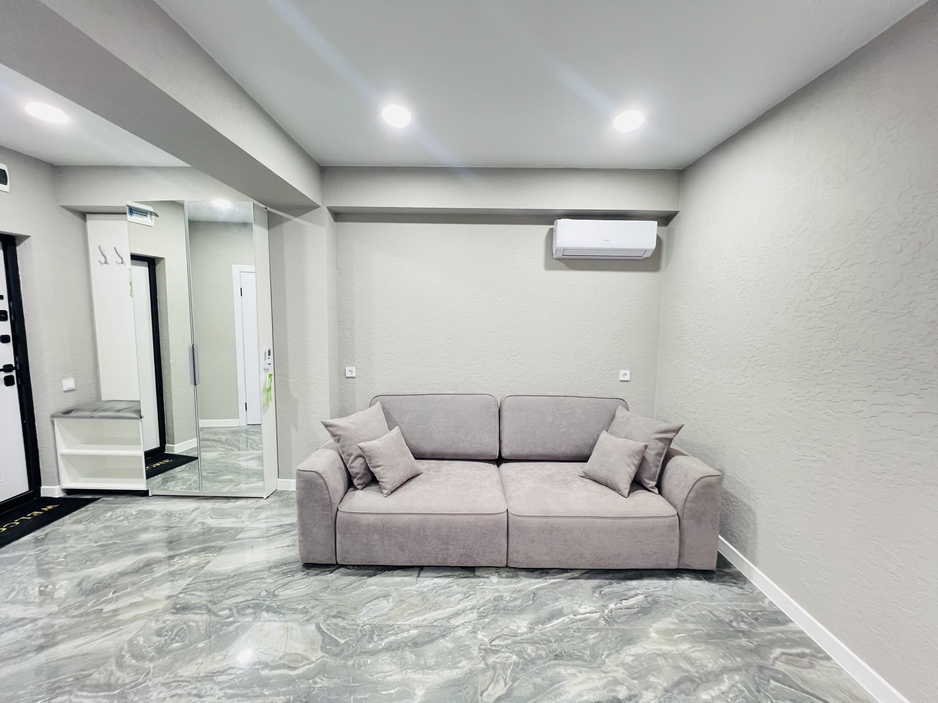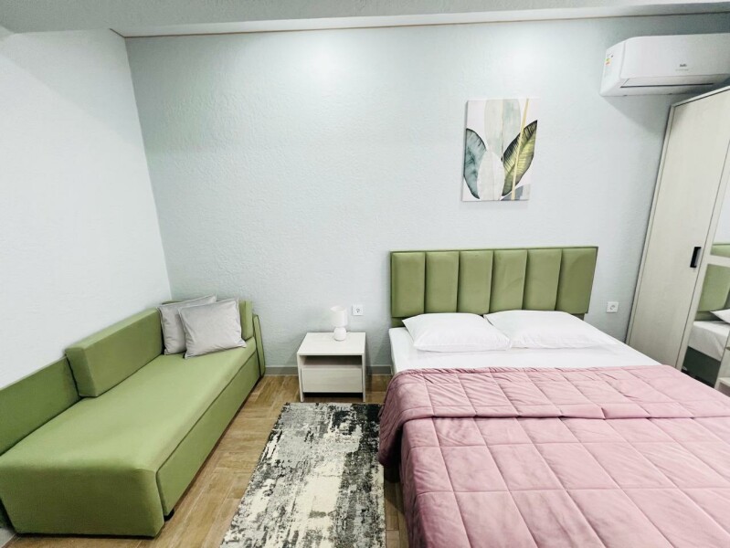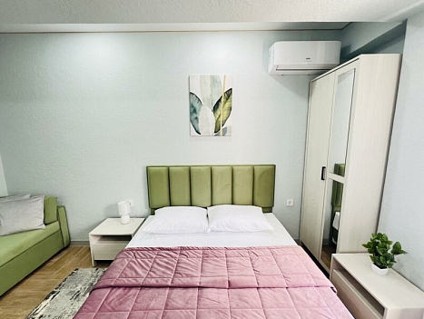 В номере: вешалка, диван раскладной, зеркало, кресло-кровать, кровать двуспальная, кухонная мебель, обувная полка, прикроватные тумбочки, стол обеденный, стулья, шкаф, гладильная доска, кондиционер, микроволновая печь, набор посуды, плита электрическая, стиральная машина, сушилка для белья, телевизор, утюг, холодильник, чайный набор посуды, электрочайник