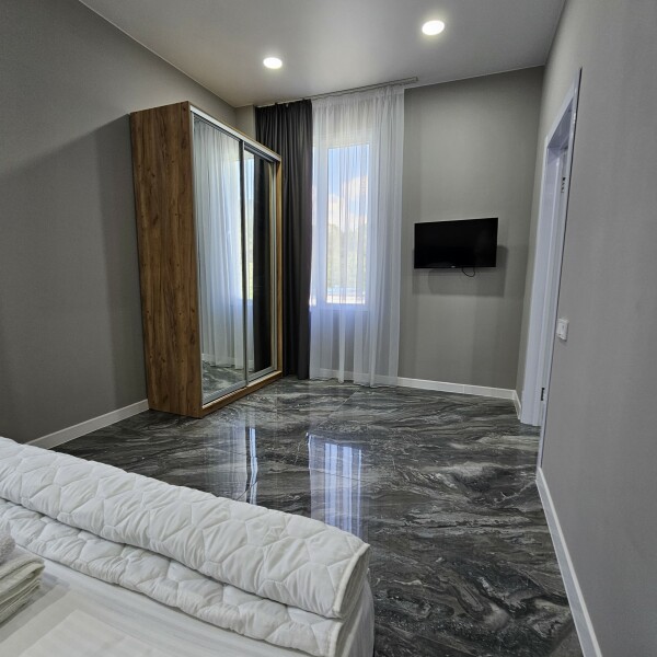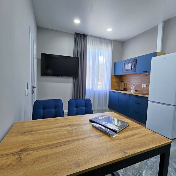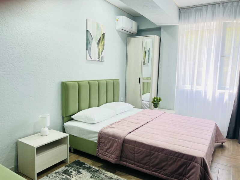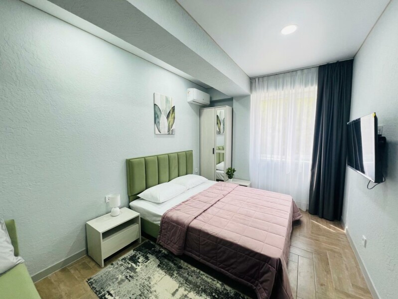 В номере: зеркало, кресло-кровать, кровать двуспальная, стол, стулья, шкаф, гладильная доска, микроволновая печь, набор посуды, плита электрическая, сплит-система, стиральная машина, сушилка для белья, телевизор, утюг, холодильник, электрочайник