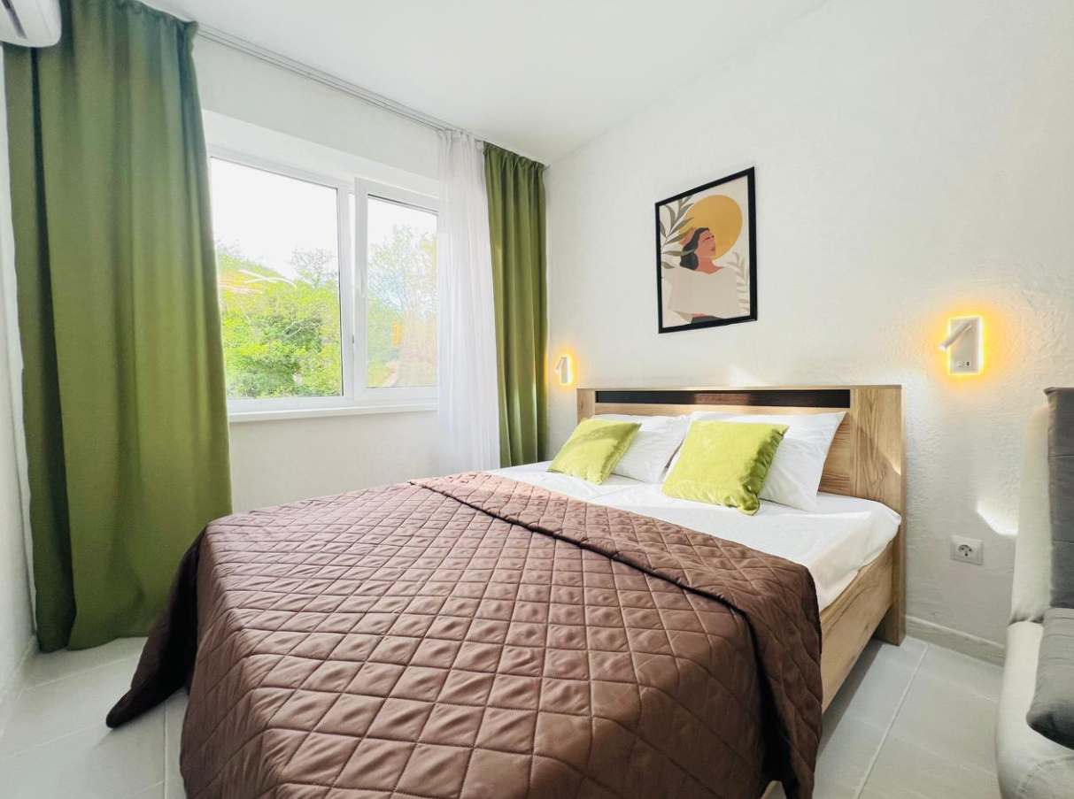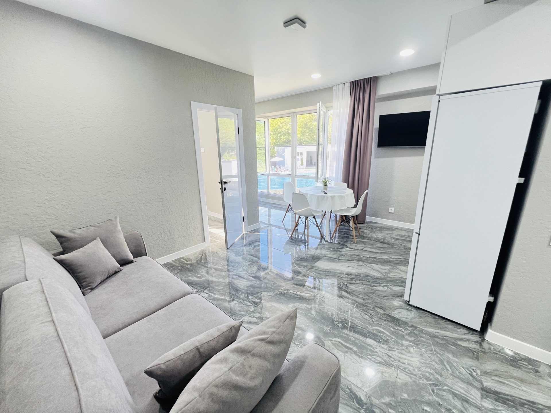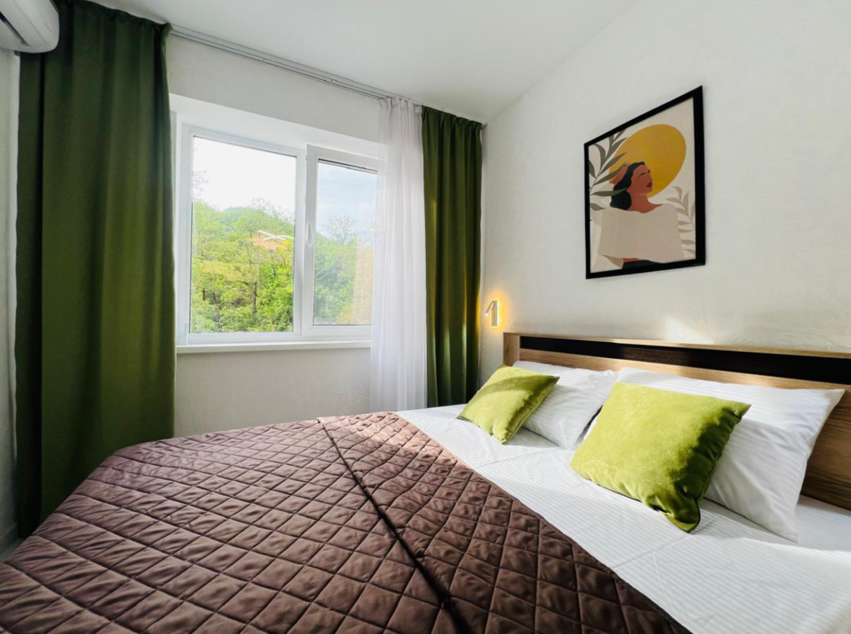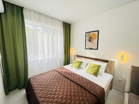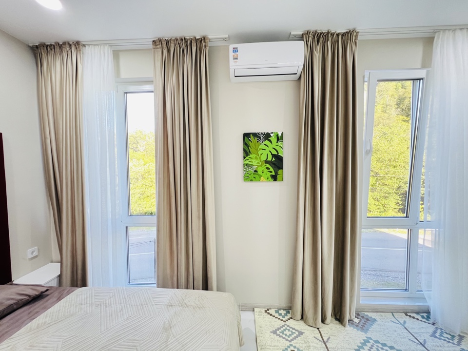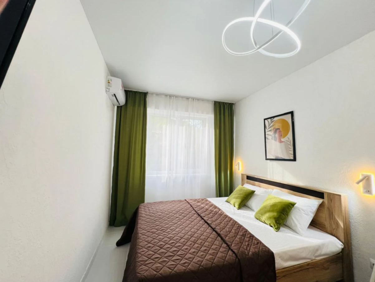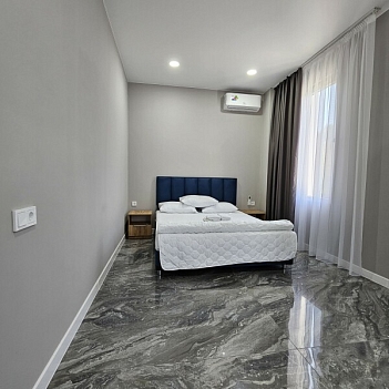 В номере: диван раскладной, кровать двуспальная, прикроватные тумбочки, стол, стулья, шкаф, микроволновая печь, набор посуды, плита электрическая, сплит-система, стиральная машина, сушилка для белья, телевизор, утюг, холодильник, электрочайник