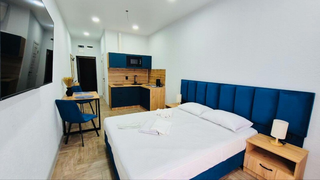 В номере: вешалка, зеркало, кровать двуспальная, прикроватные тумбочки, стол обеденный, стулья, шкаф, гладильная доска, микроволновая печь, набор посуды, плита электрическая, сплит-система, сушилка для белья, телевизор ЖК, утюг, холодильник, чайный набор посуды, электрочайник
