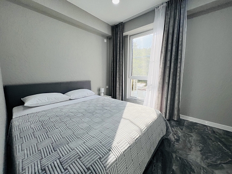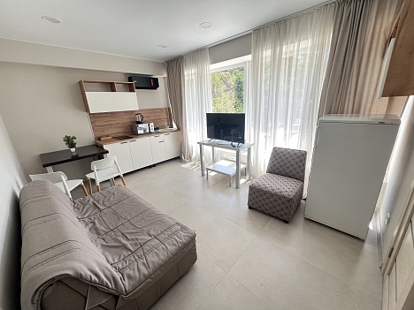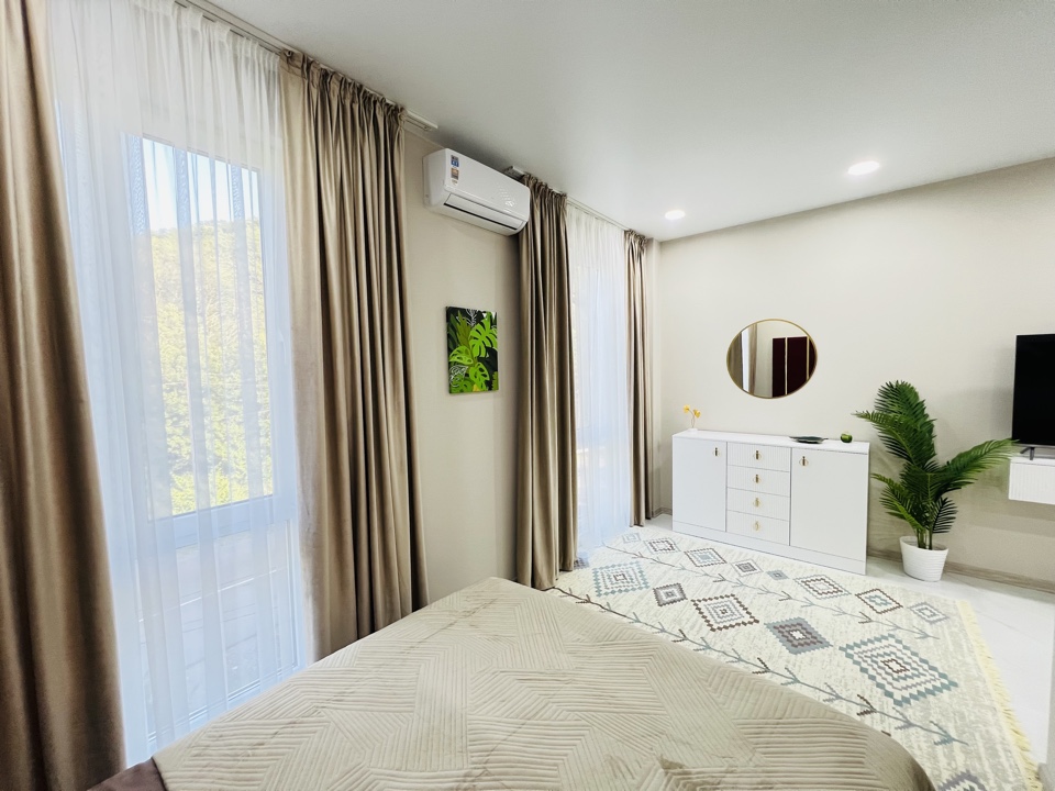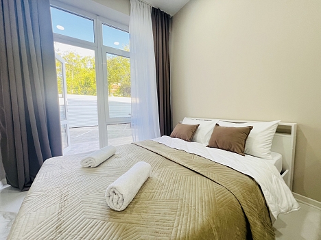 В номере: вешалка, диван раскладной, зеркало, кровать двуспальная, кухонная мебель, прикроватные тумбочки, стол обеденный, стулья, шкаф, гладильная доска, кондиционер, микроволновая печь, набор посуды, плита электрическая, стиральная машина, телевизор, утюг, холодильник, чайный набор посуды, электрочайник