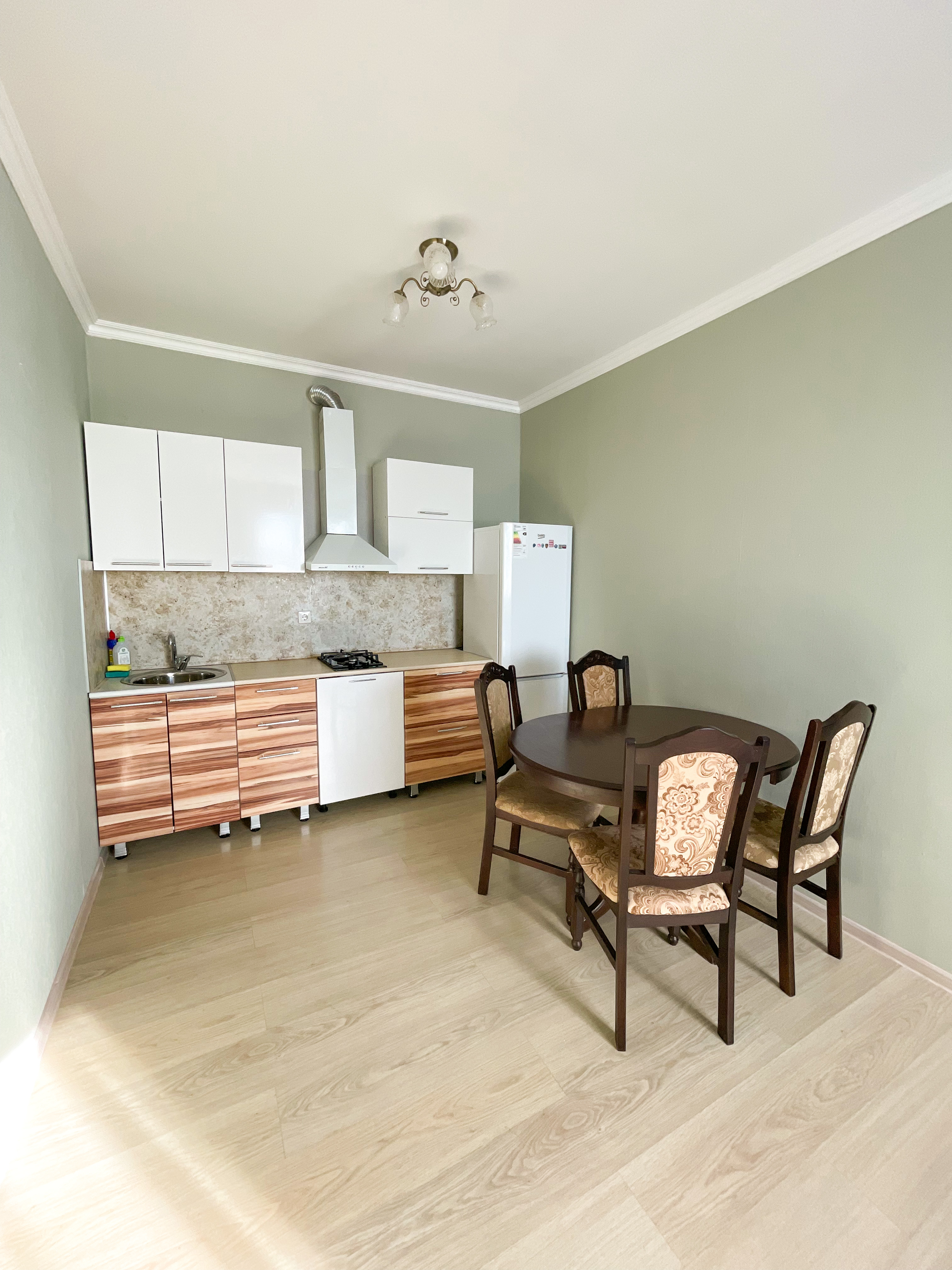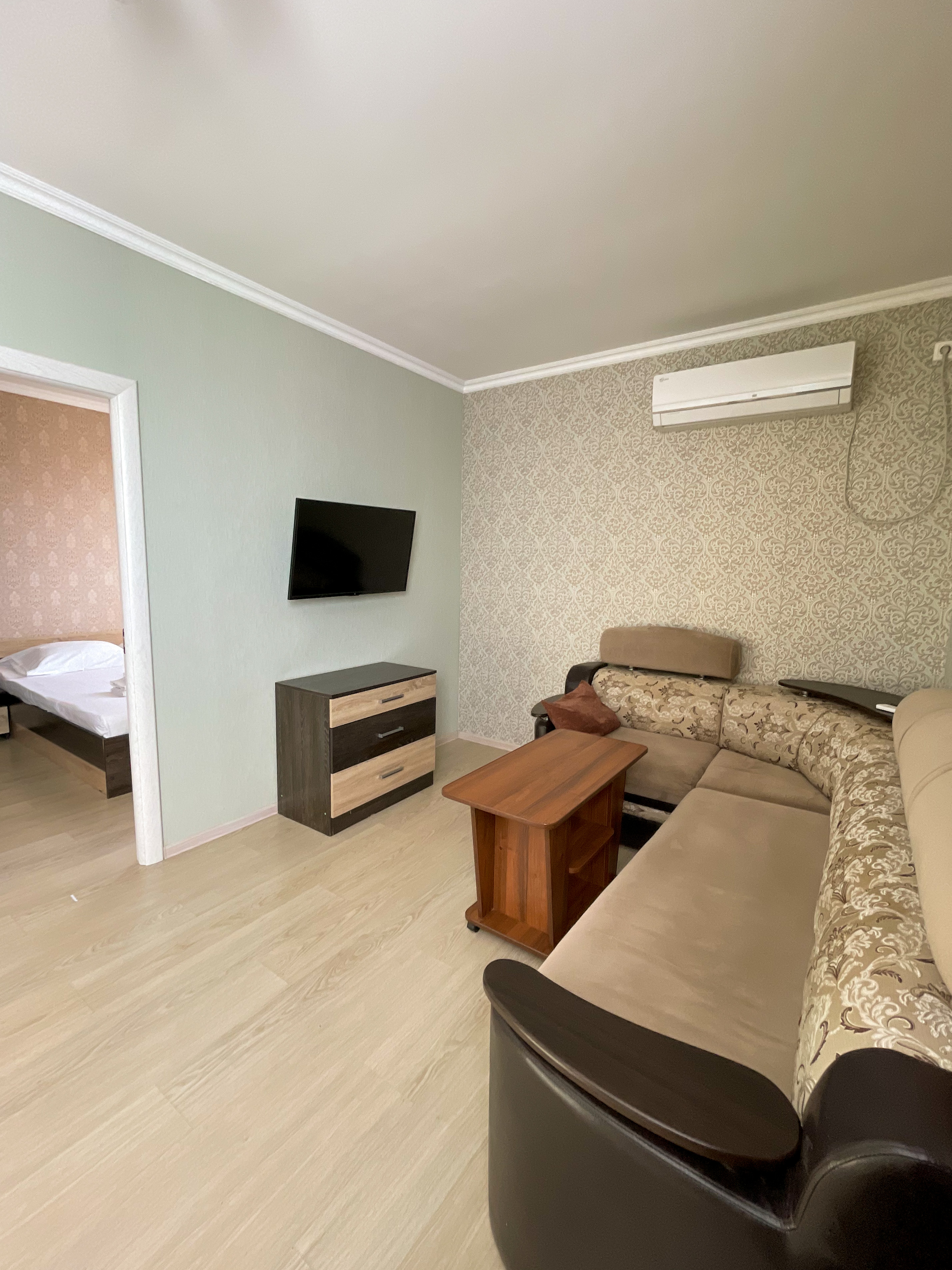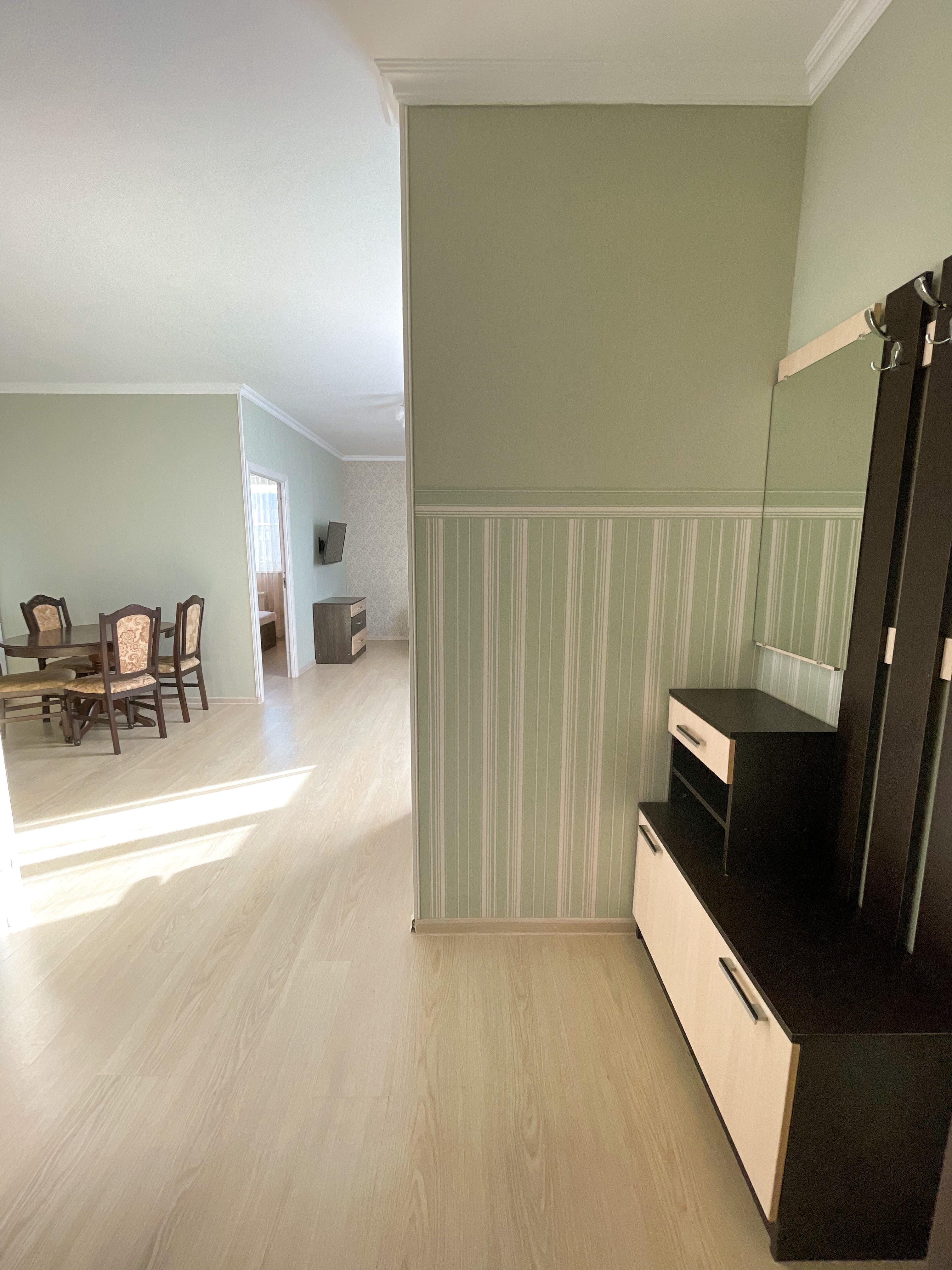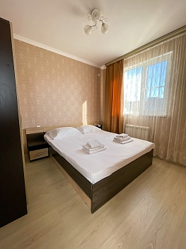 В номере: вешалка, диван, зеркало, кровать двуспальная, прикроватные тумбочки, стол, стулья, шкаф, кондиционер, микроволновая печь, набор посуды, плита газовая, стиральная машина, телевизор, холодильник, электрочайник