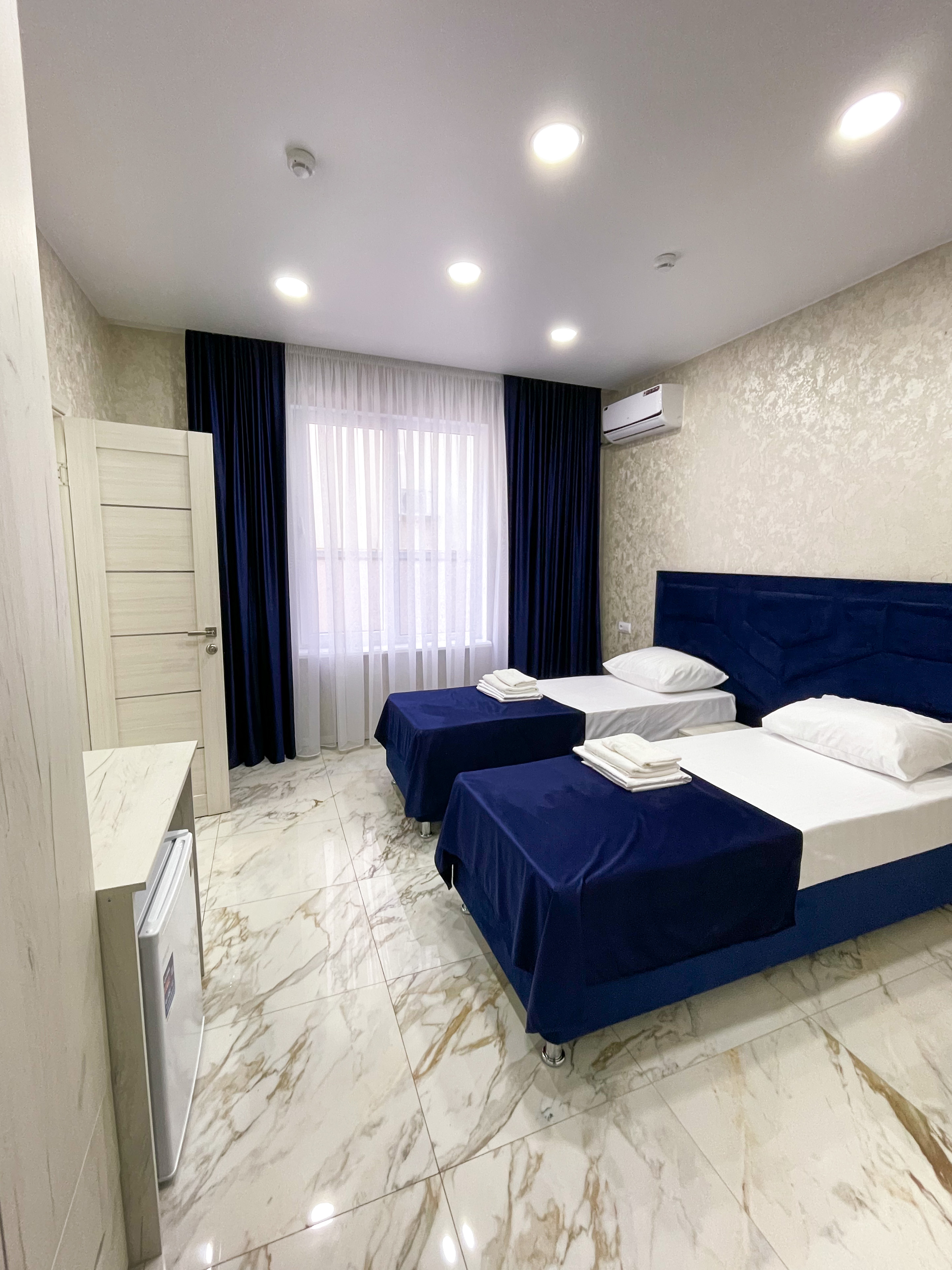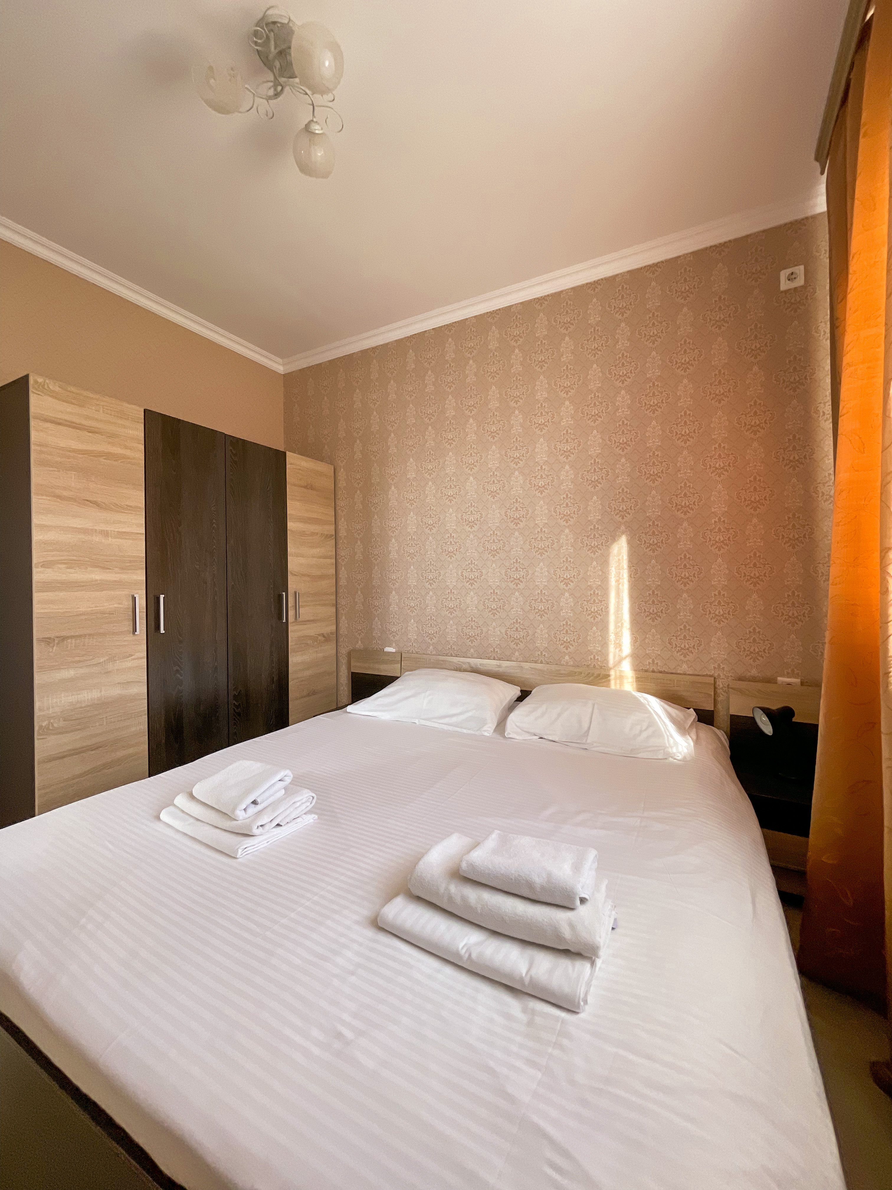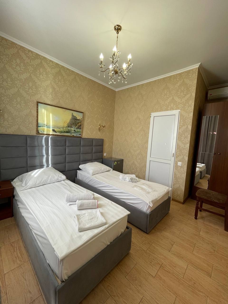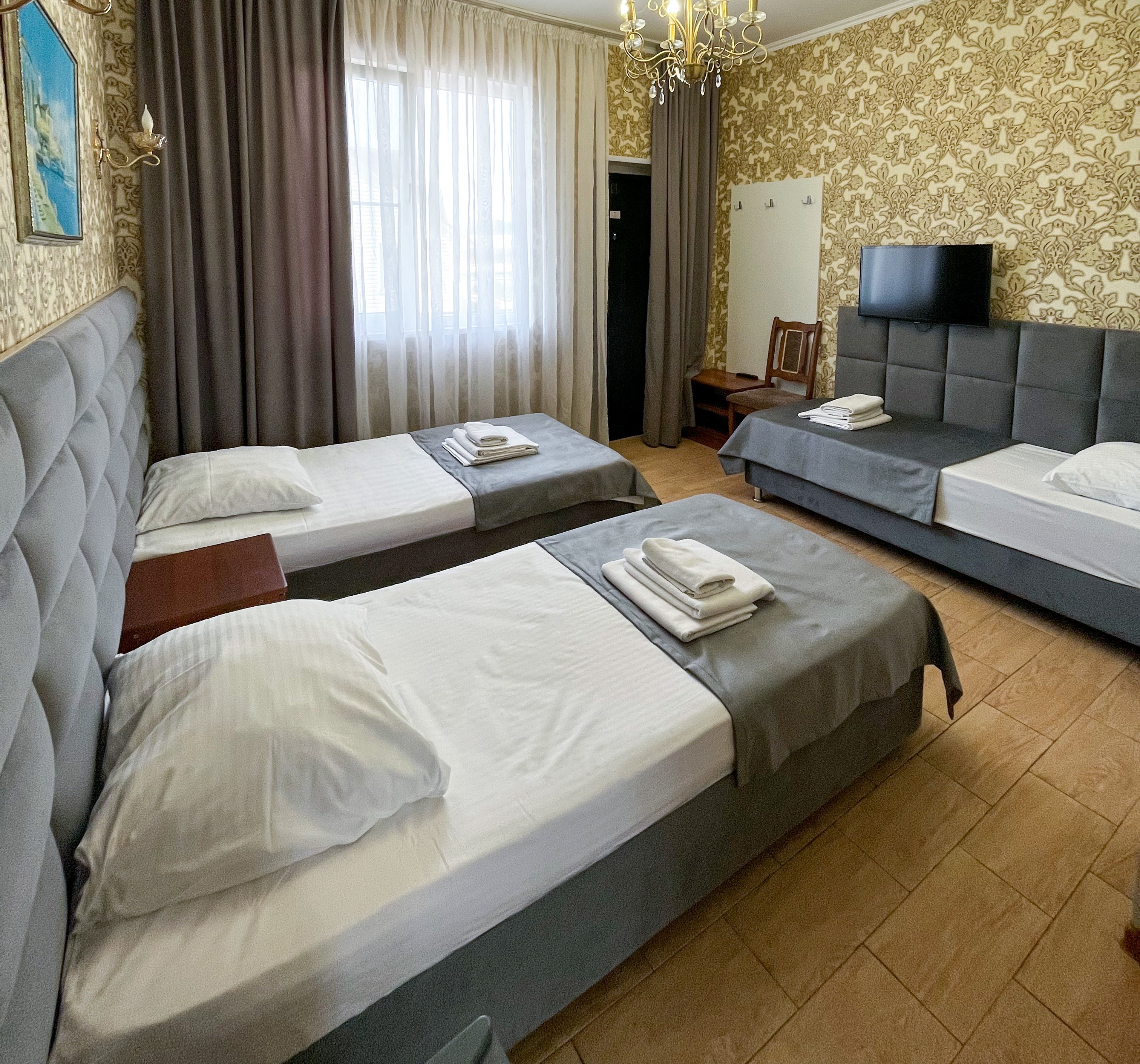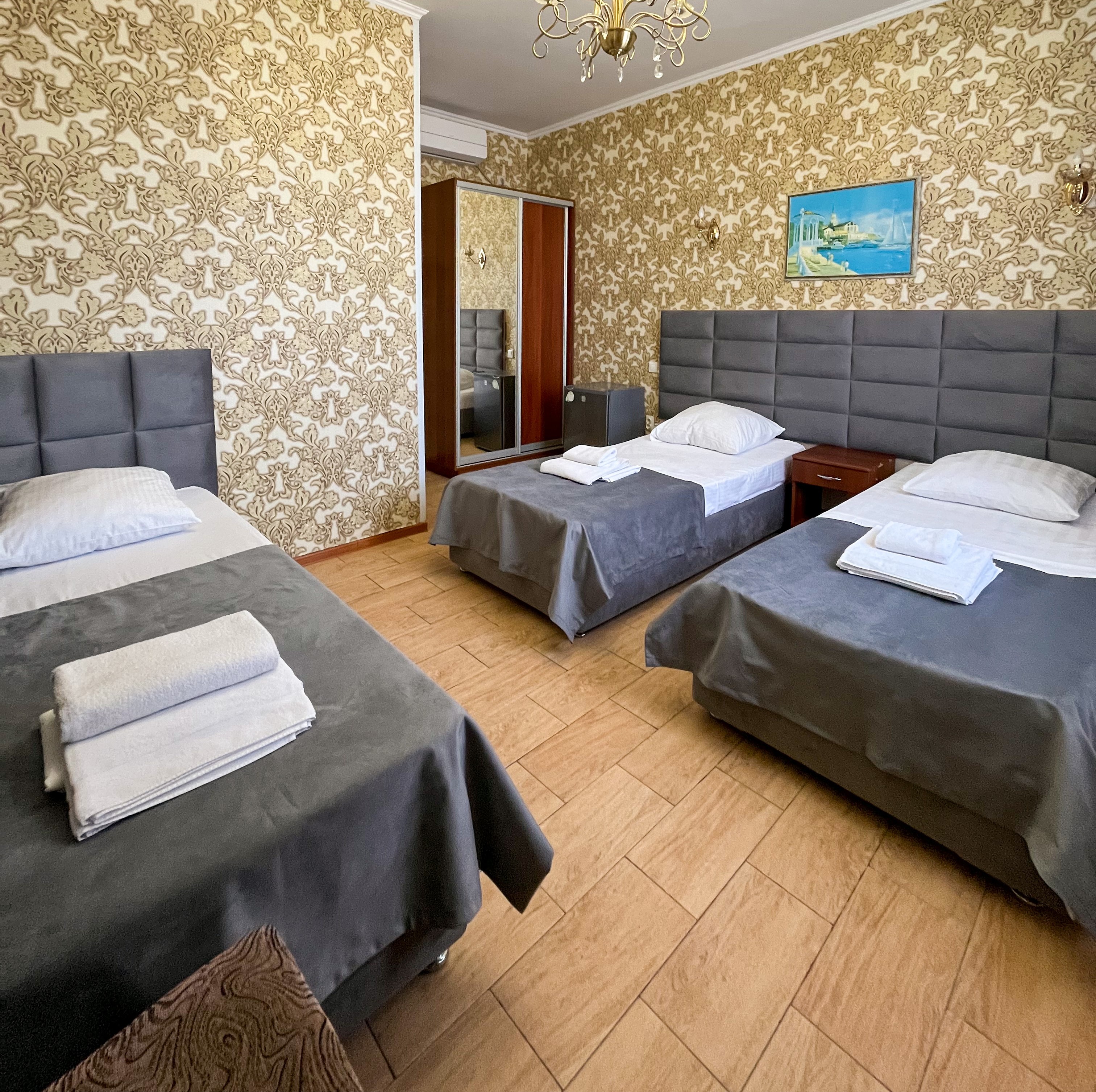 В распоряжении гостей двух-, трех- и четырехместные номера со светлым приятным интерьером. В комнатах есть собственный санузел, кондиционер, плазменный телевизор, фен.Во внутреннем дворике организована зона для отдыха, среди услуг – прачечная, интернет, багажная комната. Для малышей предоставляются кроватки-манежи. До городского пляжа – 15–20 минут ходьбы. Мелко-галечный хорошо оборудован, есть лежаки, навесы, шезлонги, работают душевые, открыты бары и кафе, много водных развлечений.