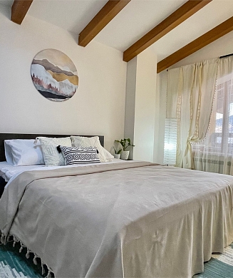 В номере: вешалка, зеркало, кровать двуспальная, прикроватные тумбочки, стол, стул, тумба, шкаф, кондиционер, мини-холодильник, набор посуды, телевизор ЖК, телефон, чайная станция