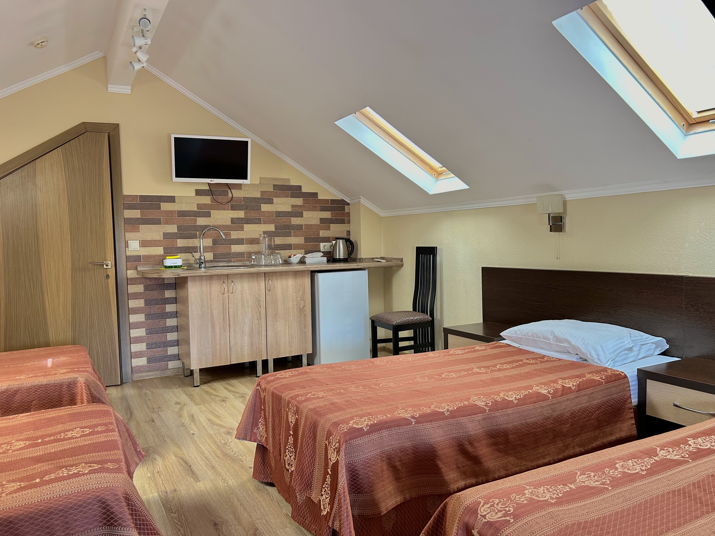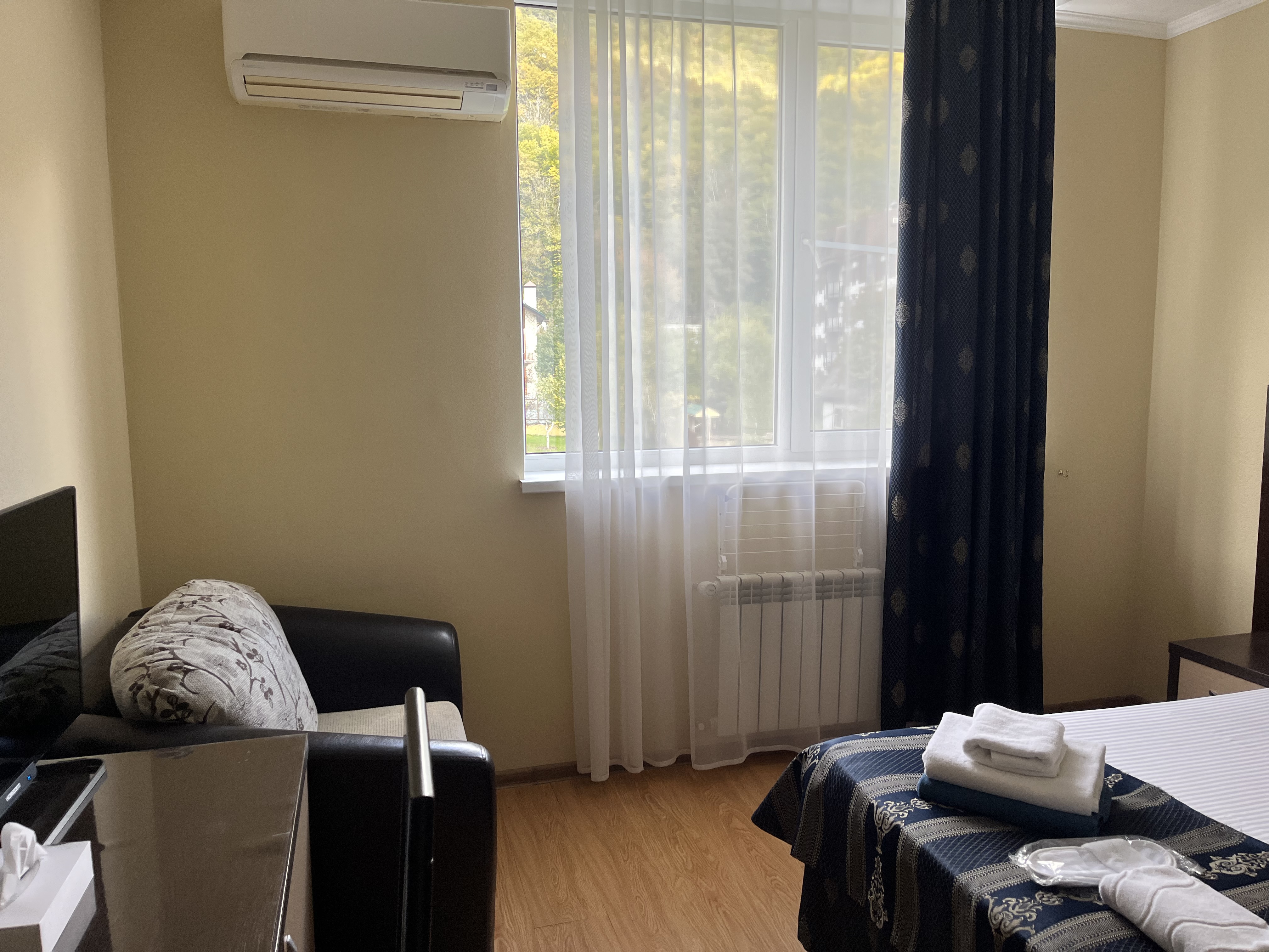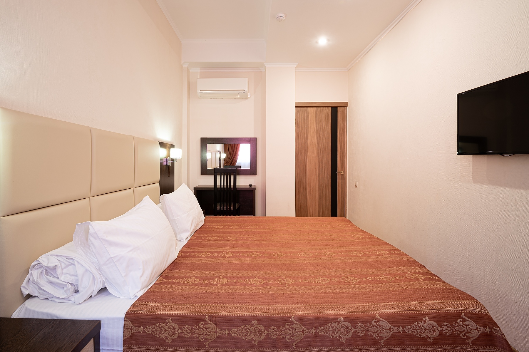 В номере: зеркало, кровати односпальные, прикроватные тумбочки, стол, стулья, шкаф, кондиционер, мини-холодильник, сейф, телевизор ЖК, чайный набор посуды, электрочайник