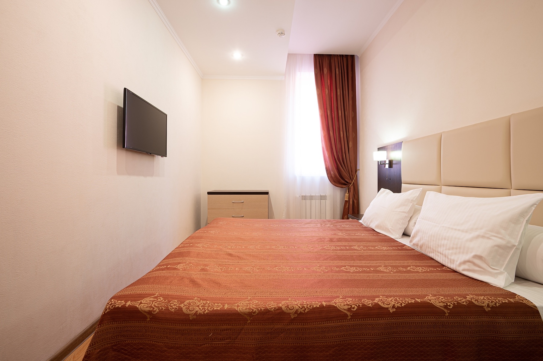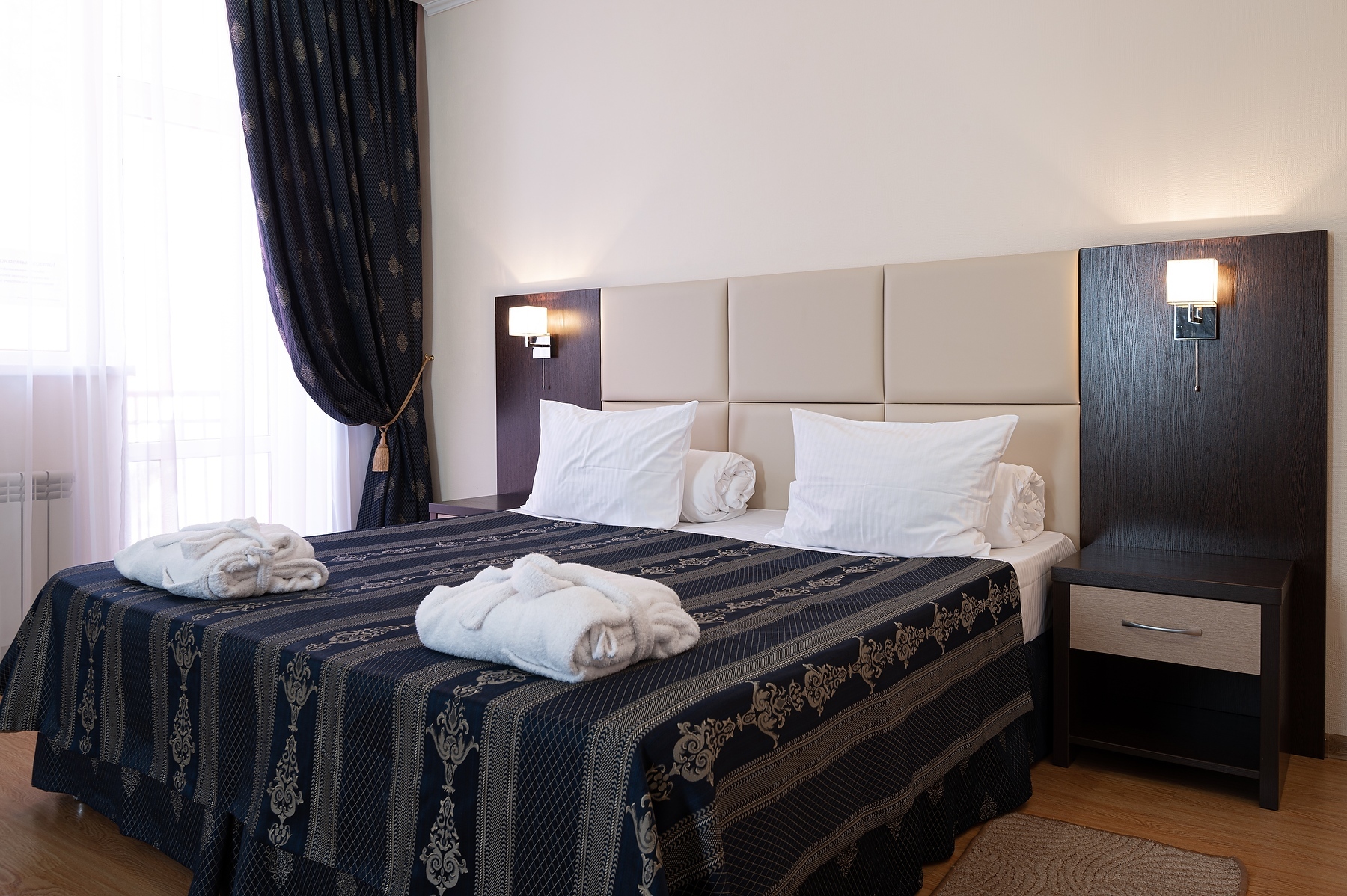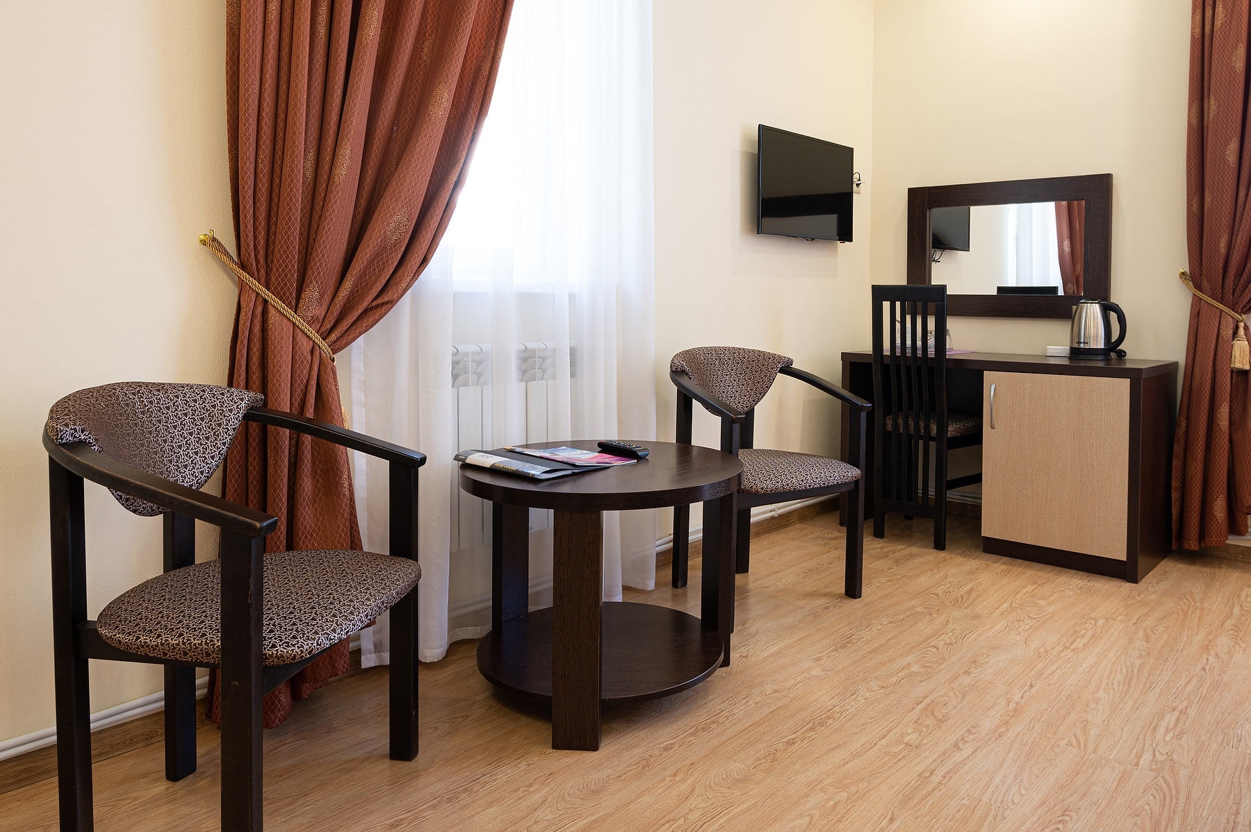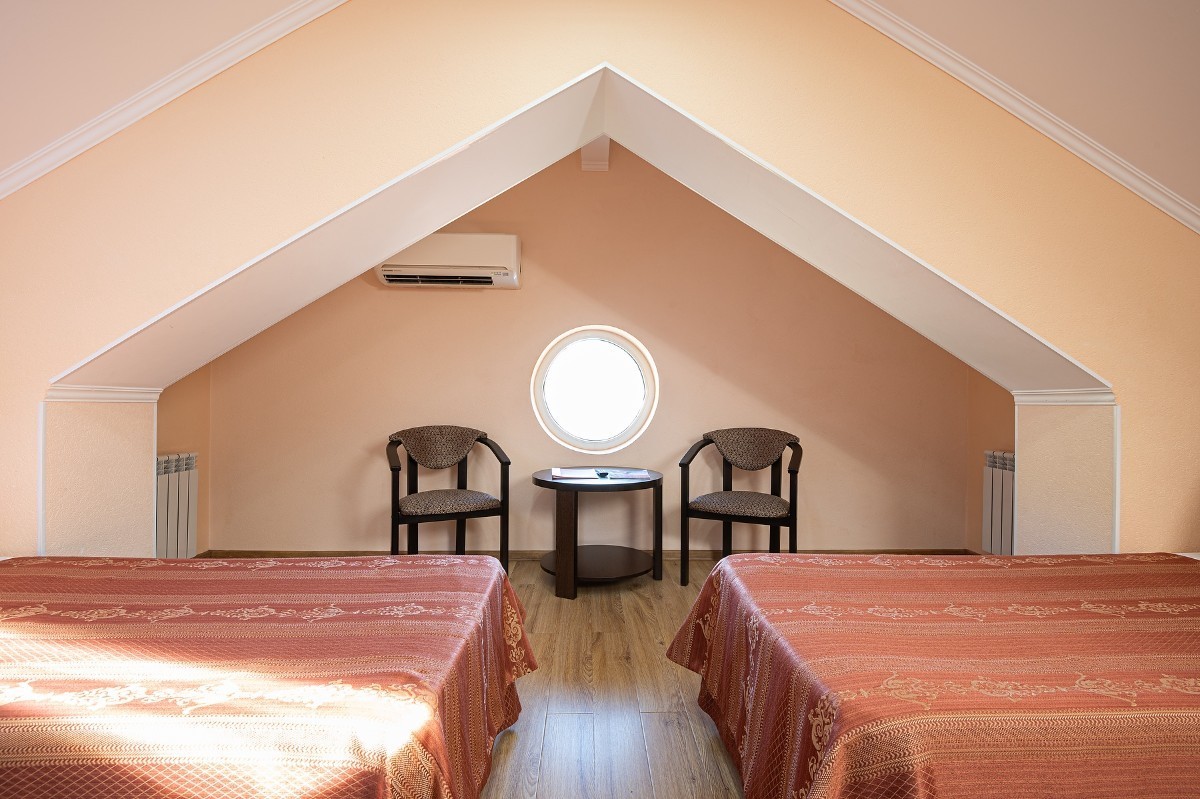 В номере: зеркало, кровати односпальные, прикроватные тумбочки, стол, стулья, шкаф, кондиционер, мини-холодильник, сейф, телевизор ЖК, чайный набор посуды, электрочайник