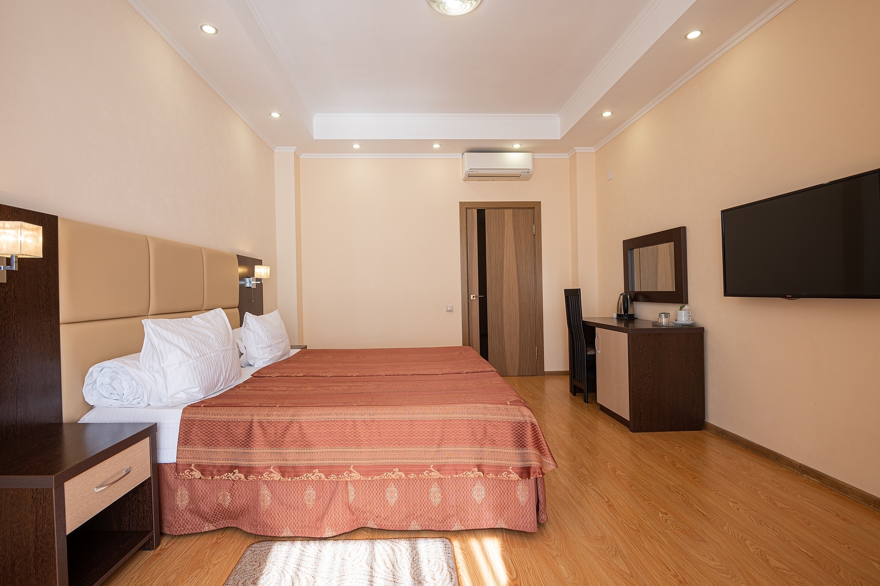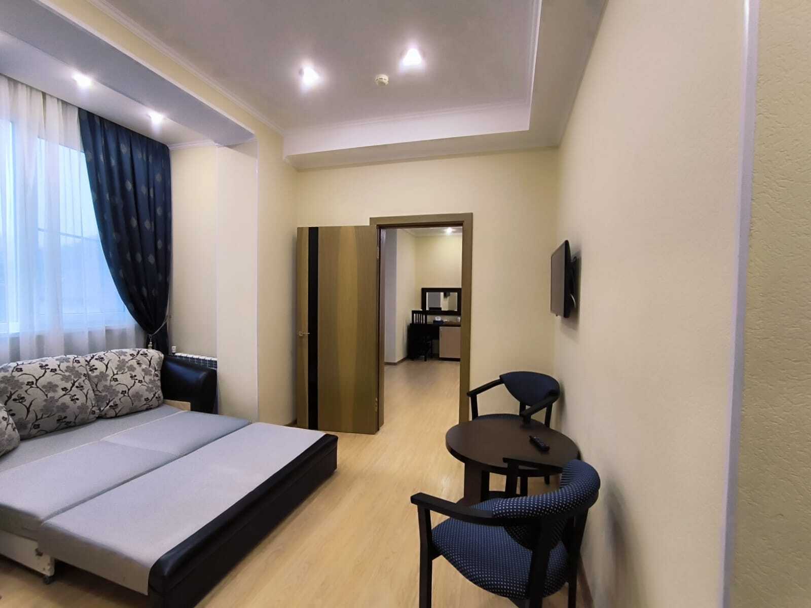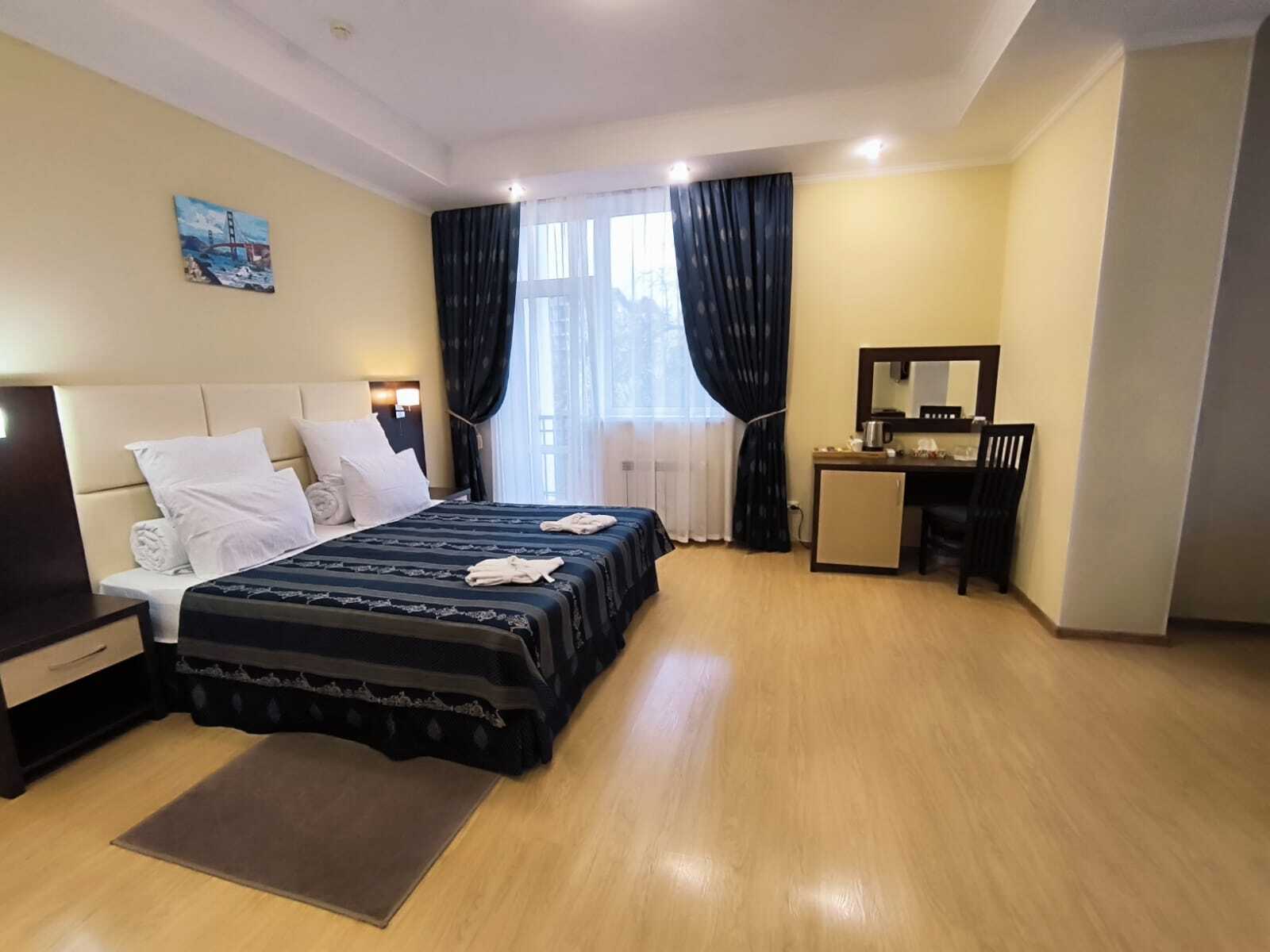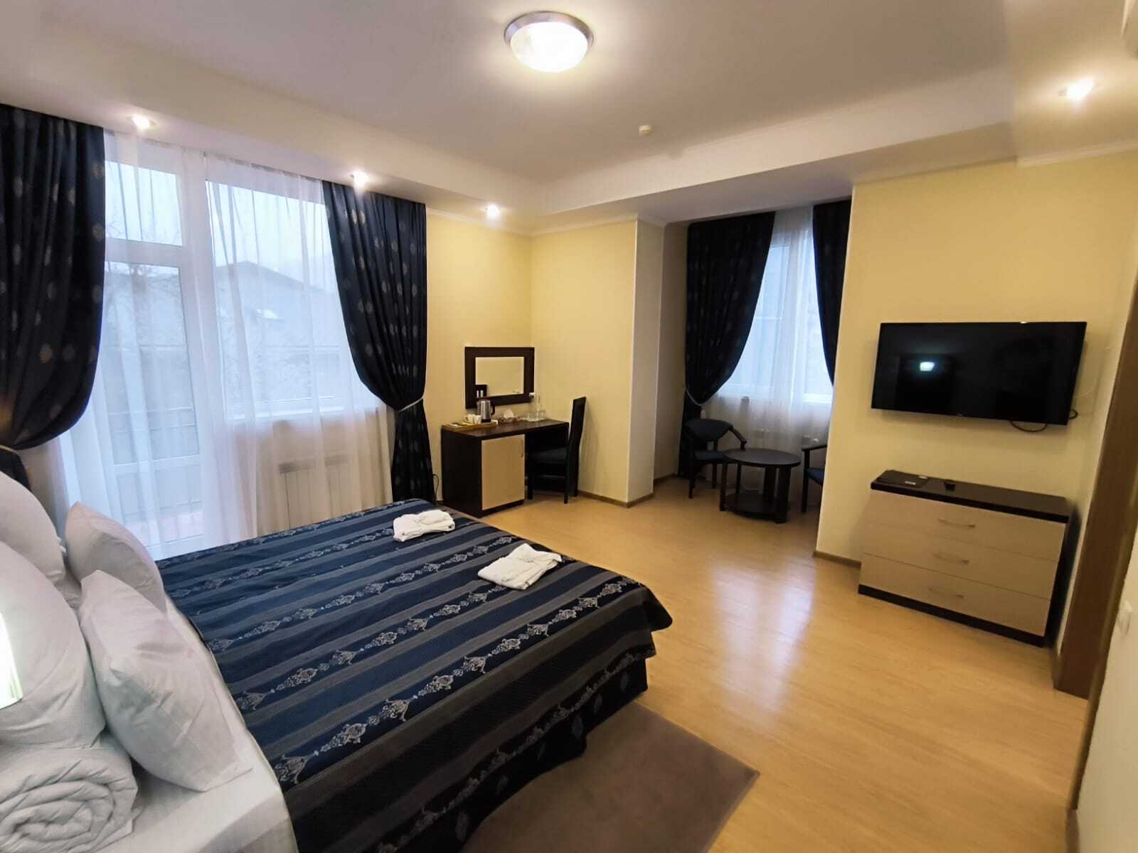 В номере: вешалка, диван раскладной, зеркало, комод, кровать двуспальная, прикроватные тумбочки, стол, столик кофейный, стулья, шкаф, гладильная доска, кондиционер, мини-холодильник, сейф, телевизор ЖК, утюг, чайная станция