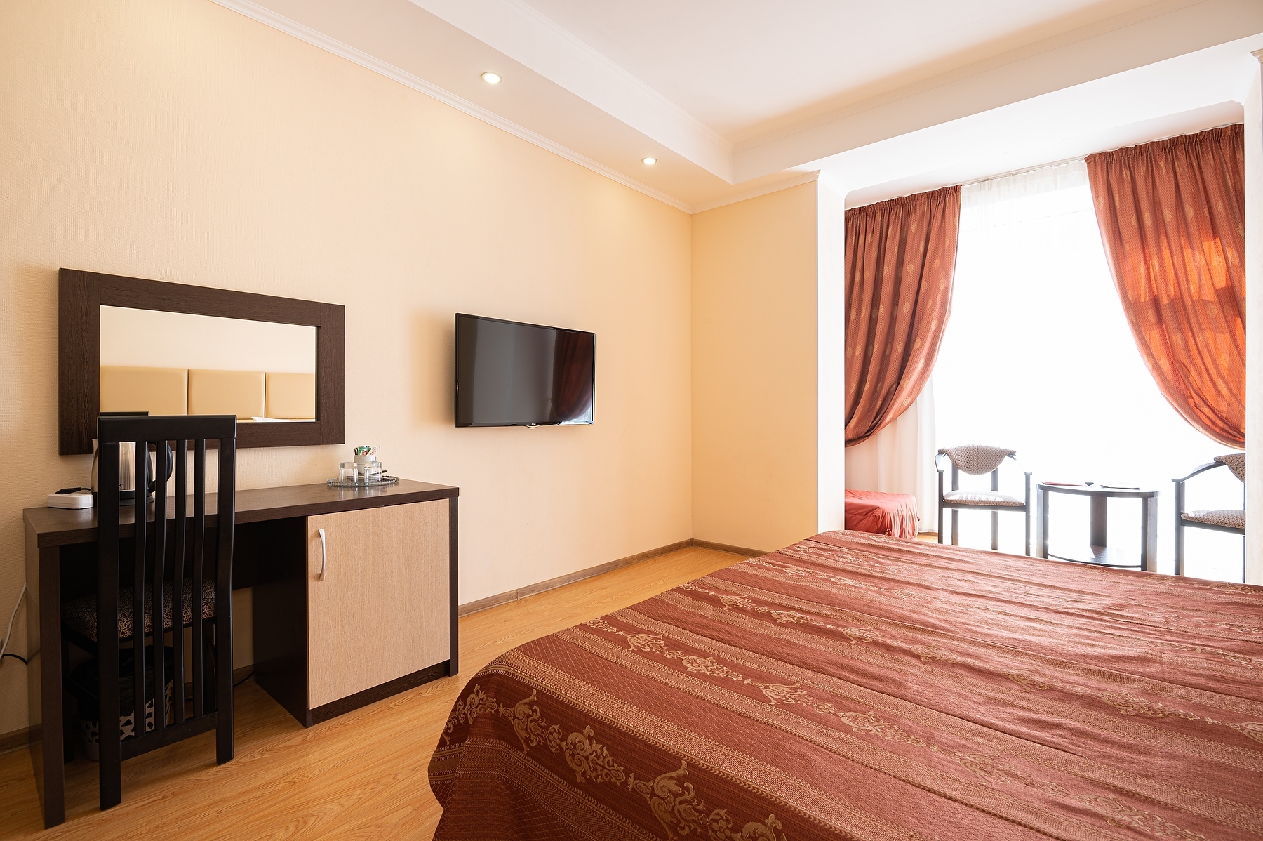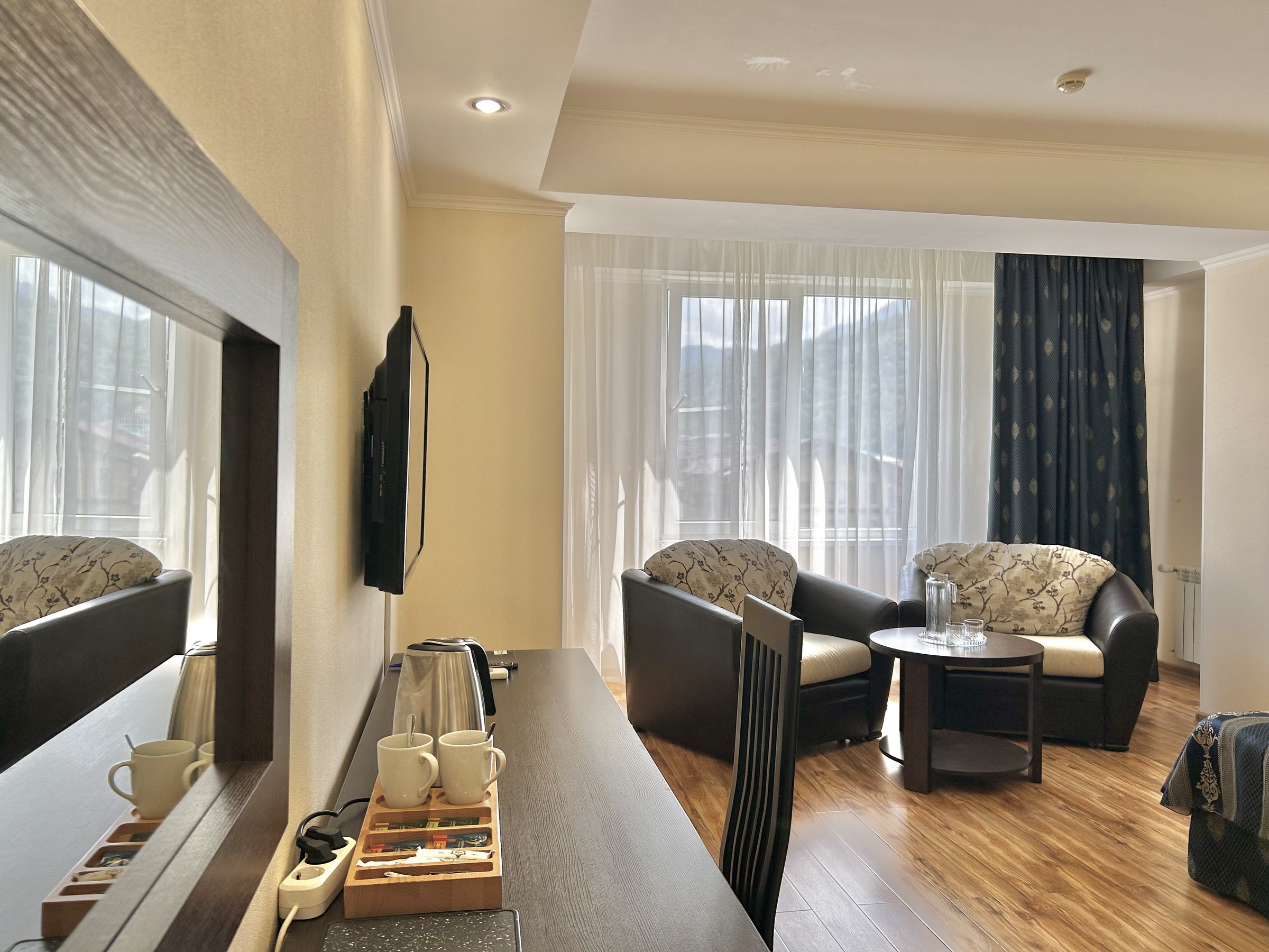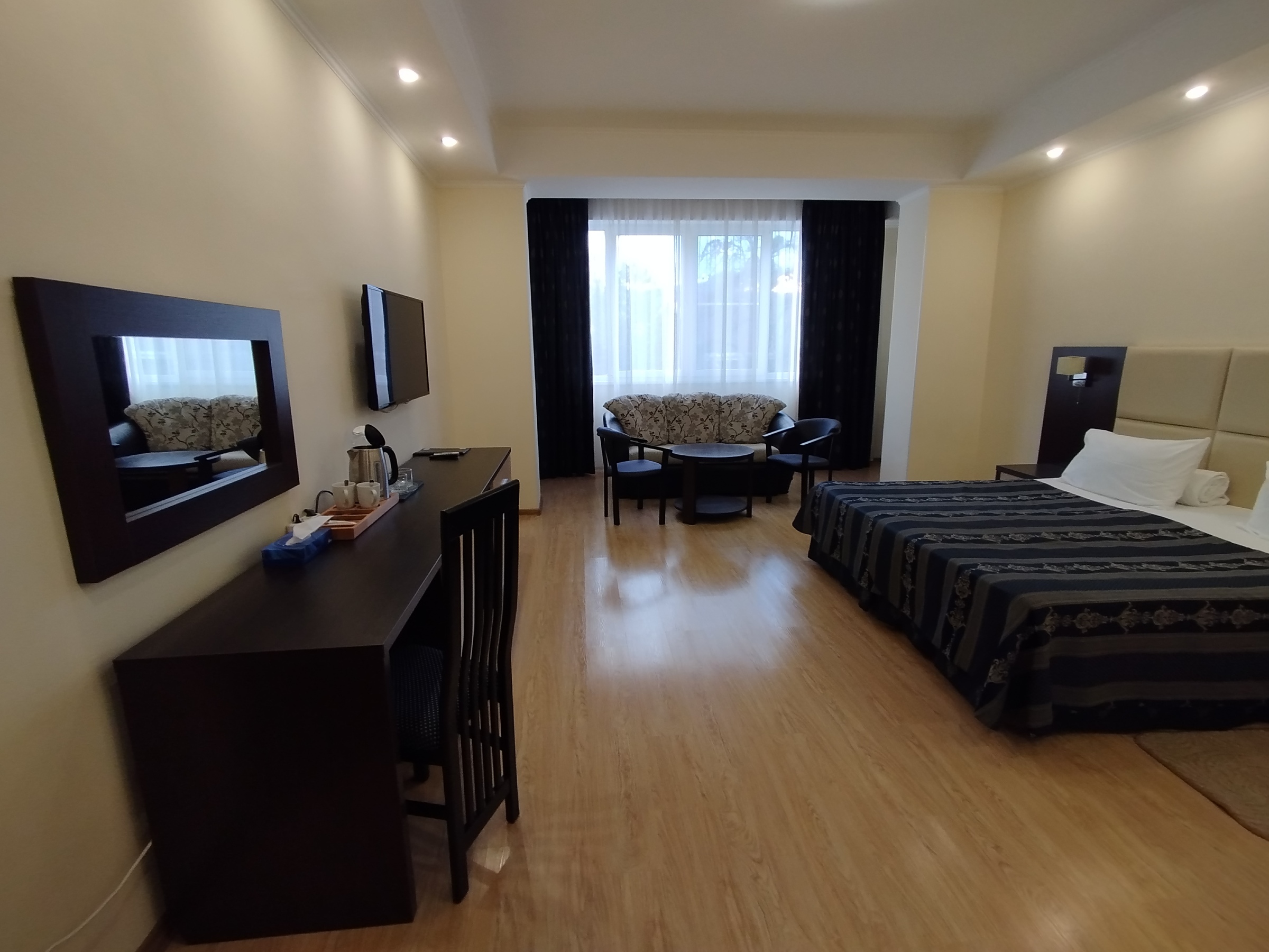 В номере: вешалка, диван раскладной, зеркало, комод, кровать двуспальная, прикроватные тумбочки, стол, столик кофейный, стулья, шкаф, гладильная доска, кондиционер, мини-холодильник, сейф, телевизор ЖК, утюг, чайная станция