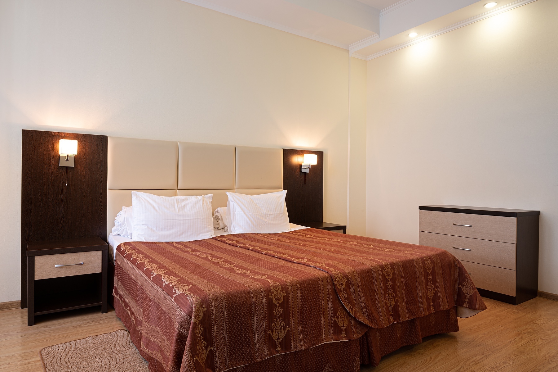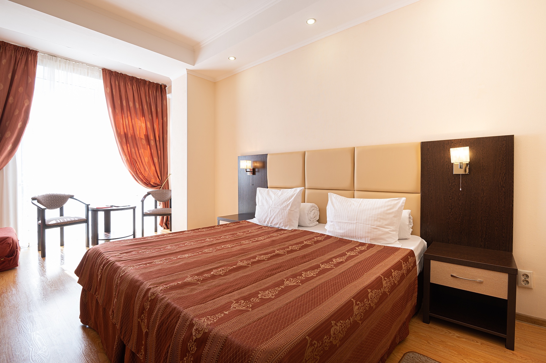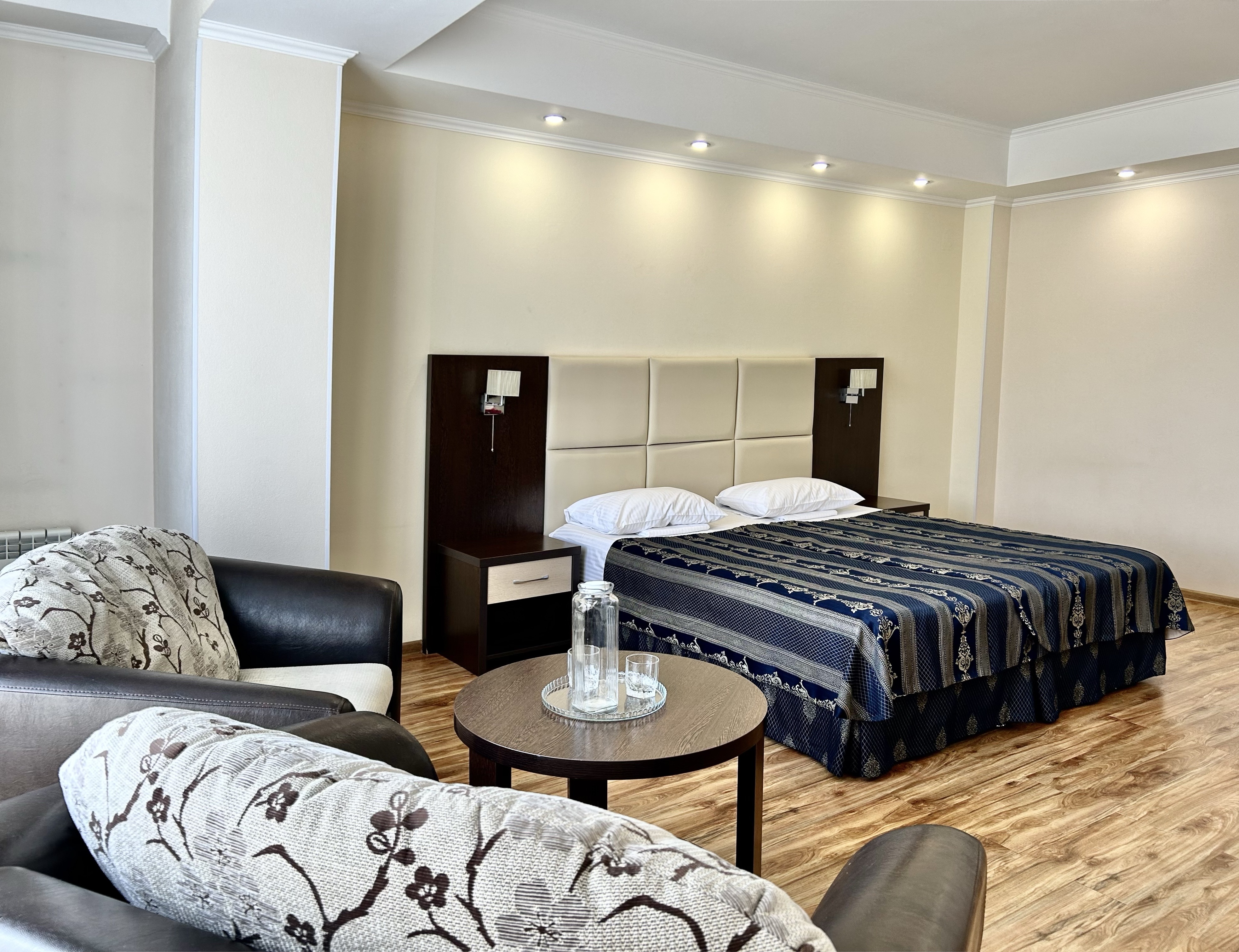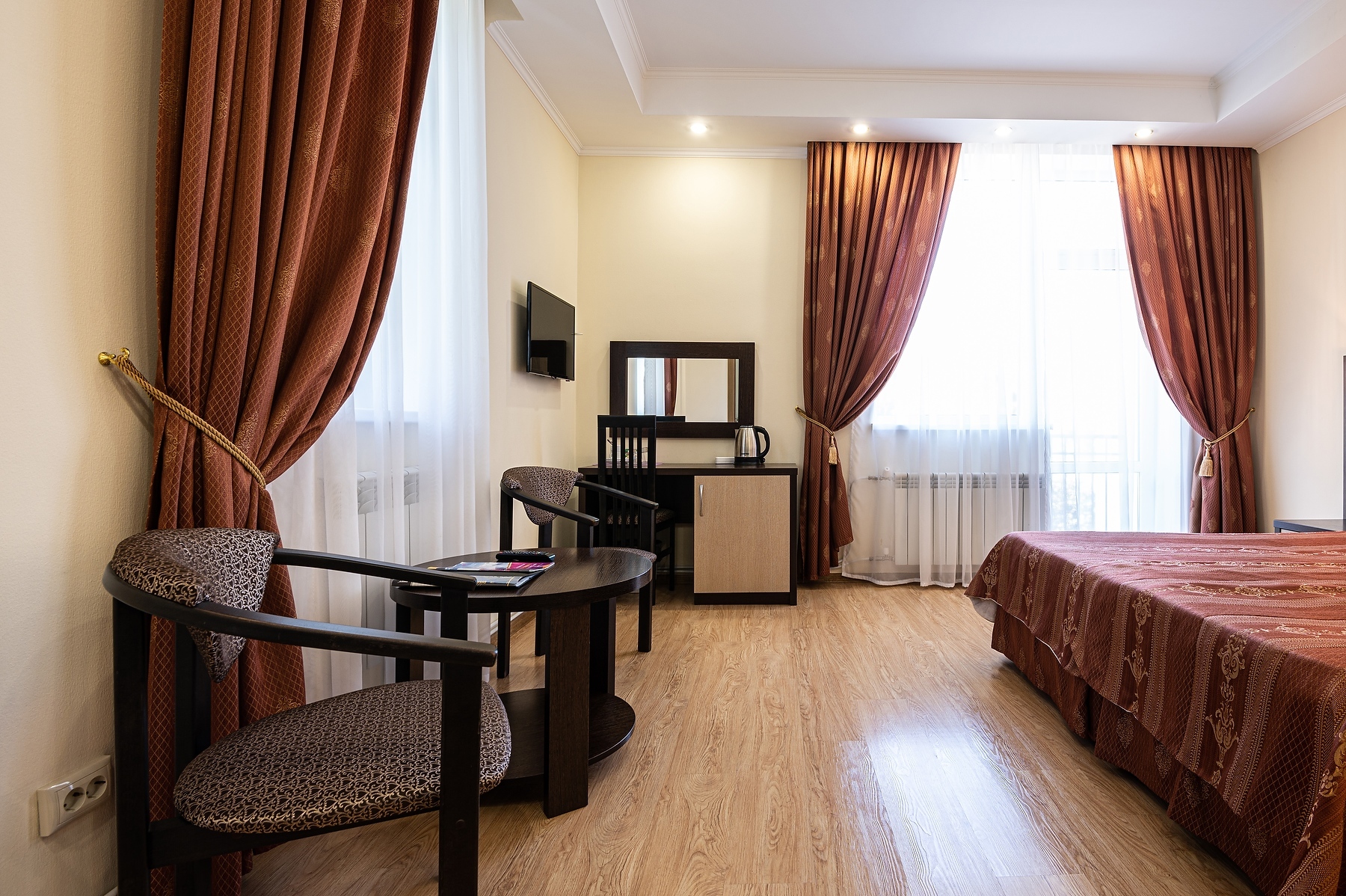 В номере: вешалка, диван раскладной, зеркало, комод, кровать двуспальная, прикроватные тумбочки, стол, столик кофейный, стулья, шкаф, гладильная доска, кондиционер, мини-холодильник, сейф, телевизор ЖК, утюг, чайная станция