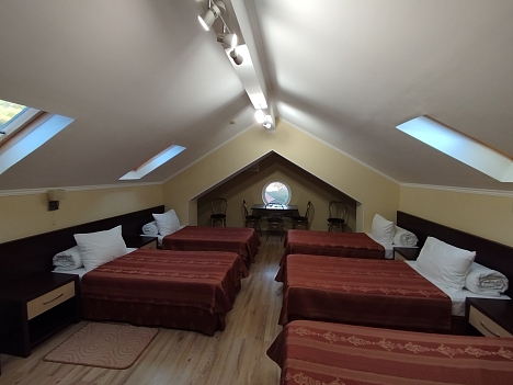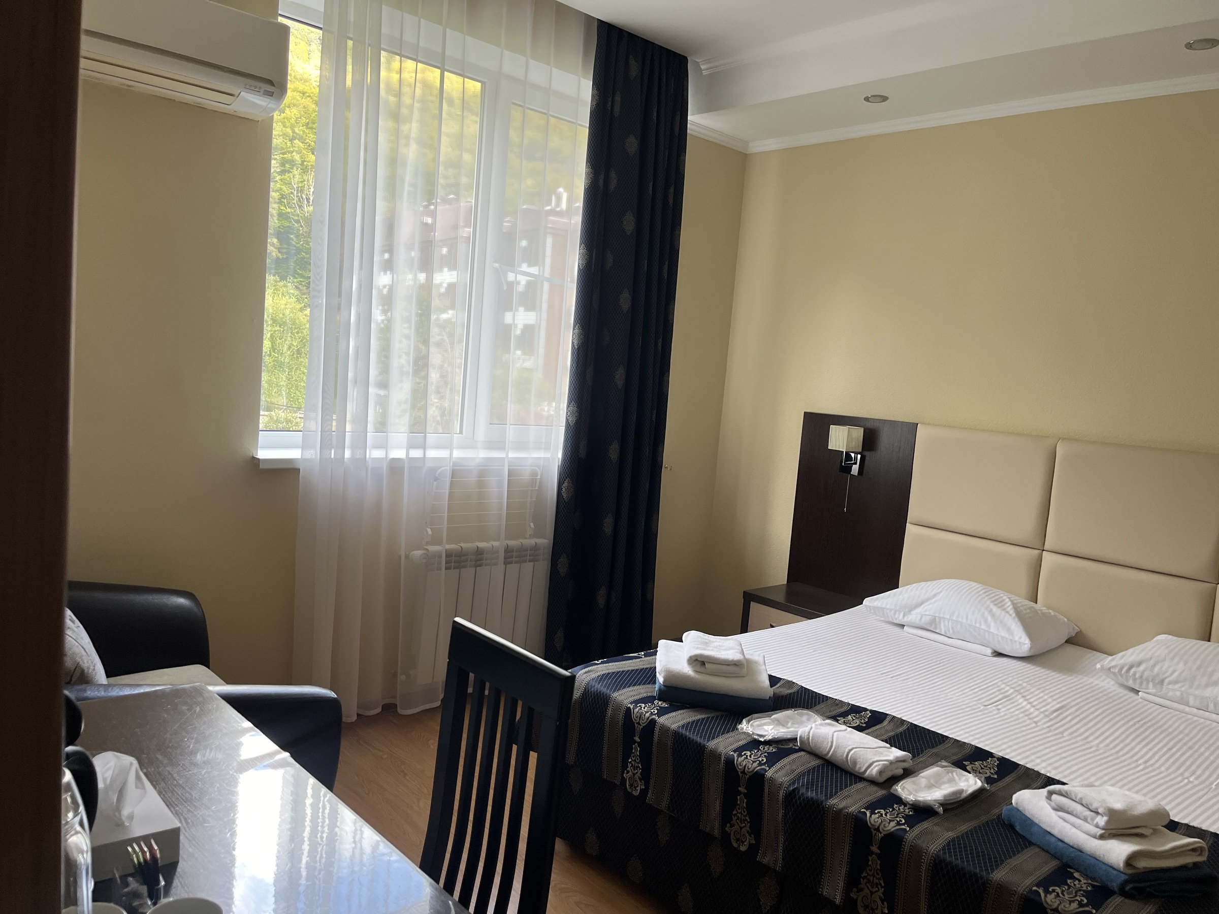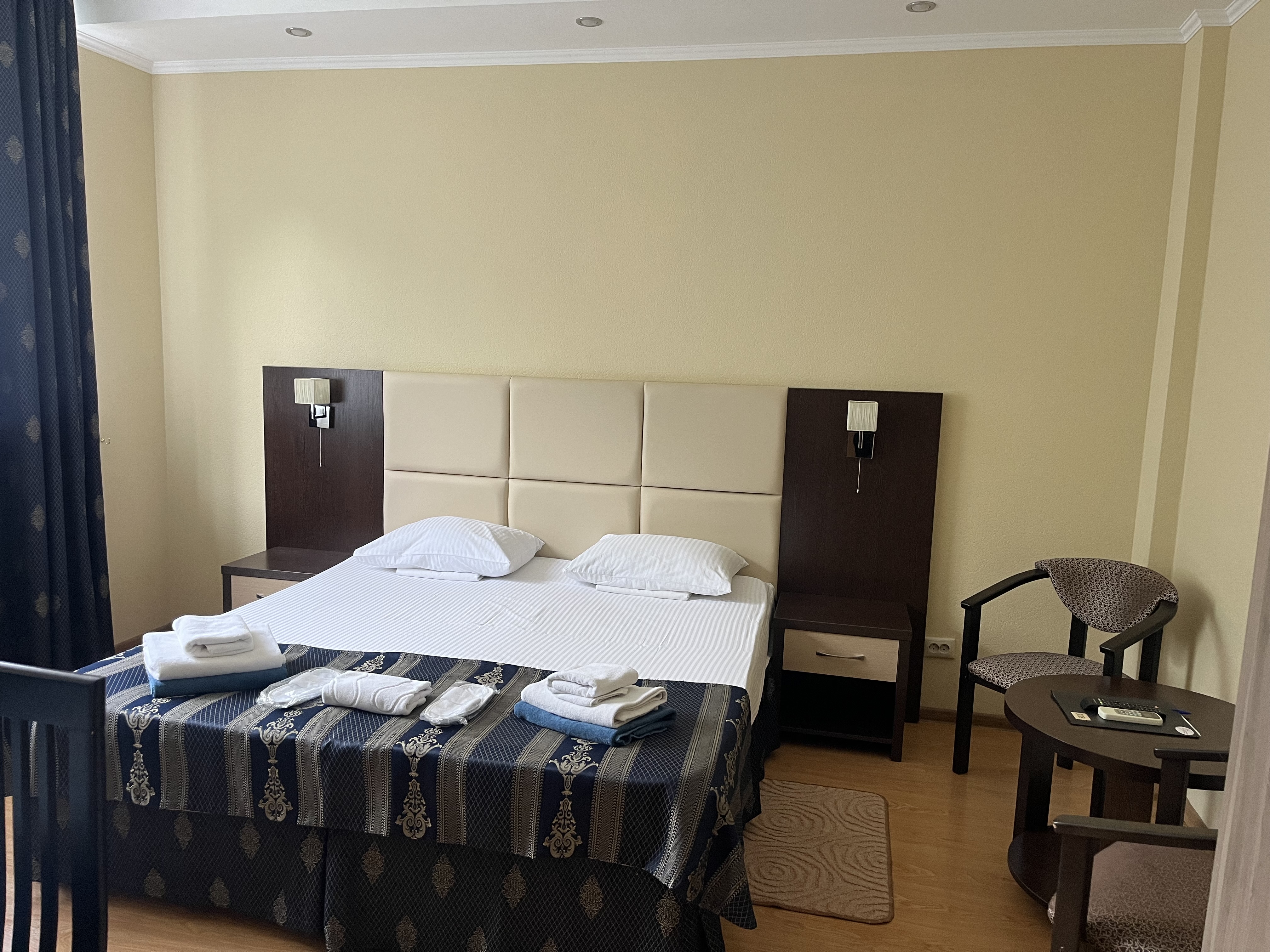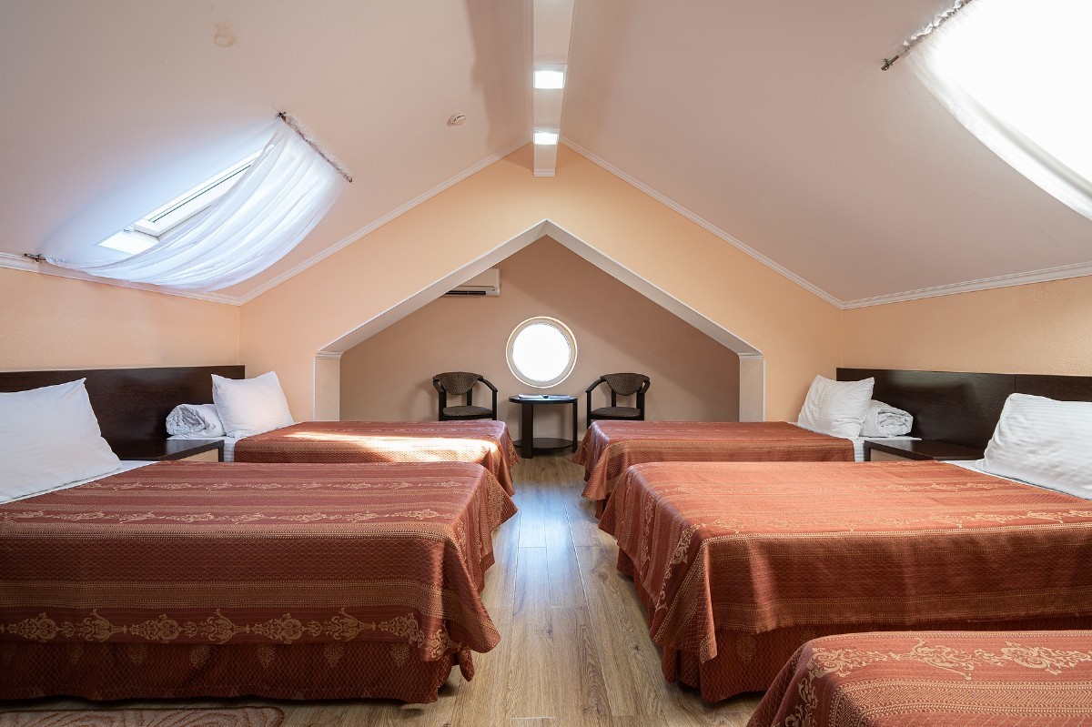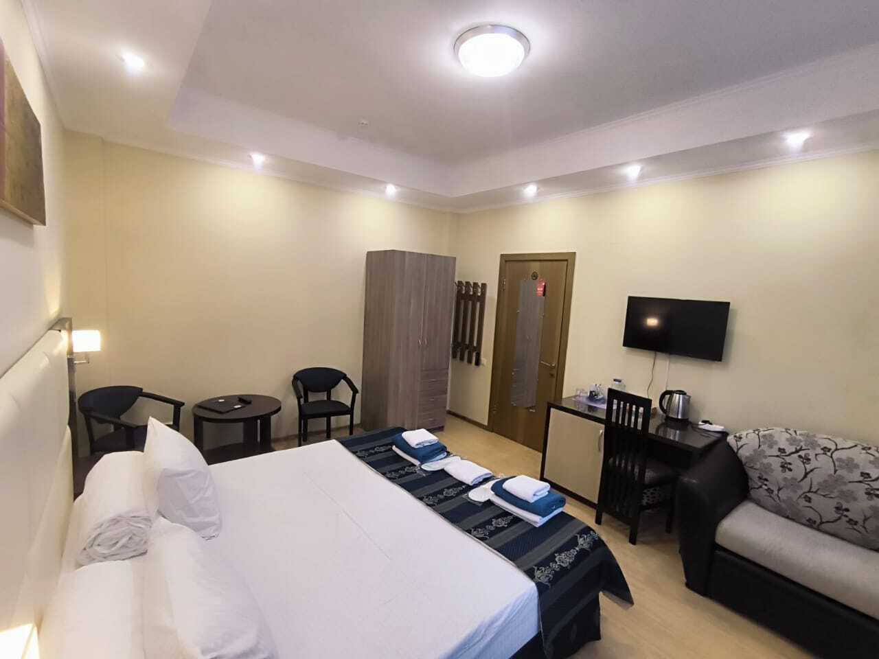 В номере: зеркало, кровати односпальные /одна двуспальная кровать, прикроватные тумбочки, раскладушка, стол, стулья, шкаф, кондиционер, мини-холодильник, сейф, телевизор ЖК, чайный набор посуды, электрочайник