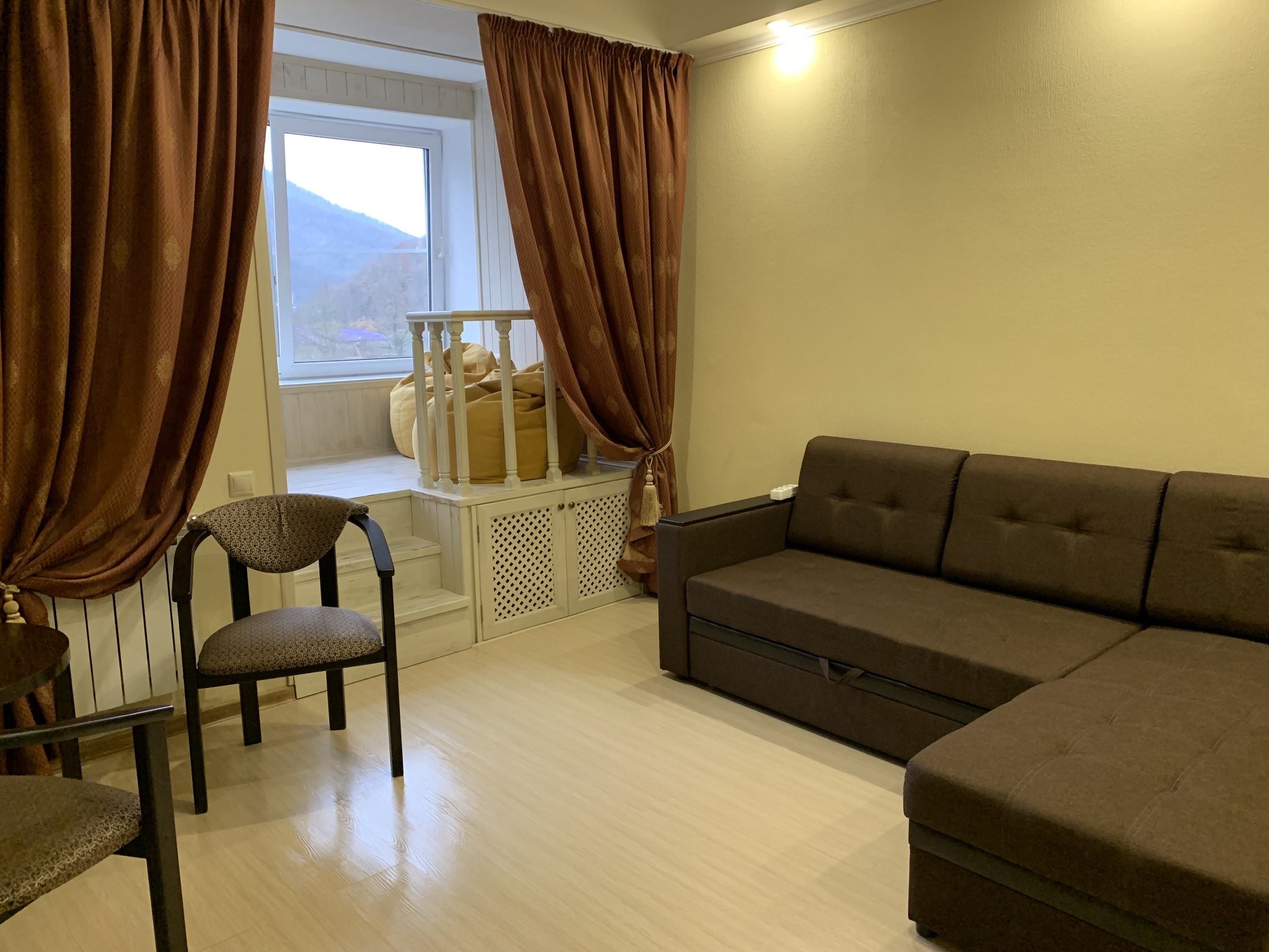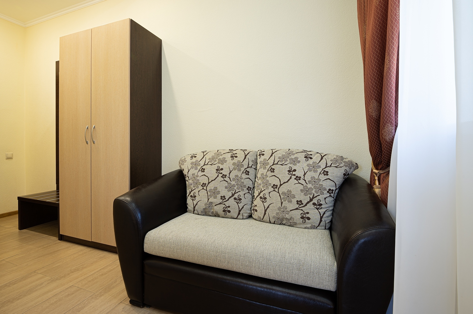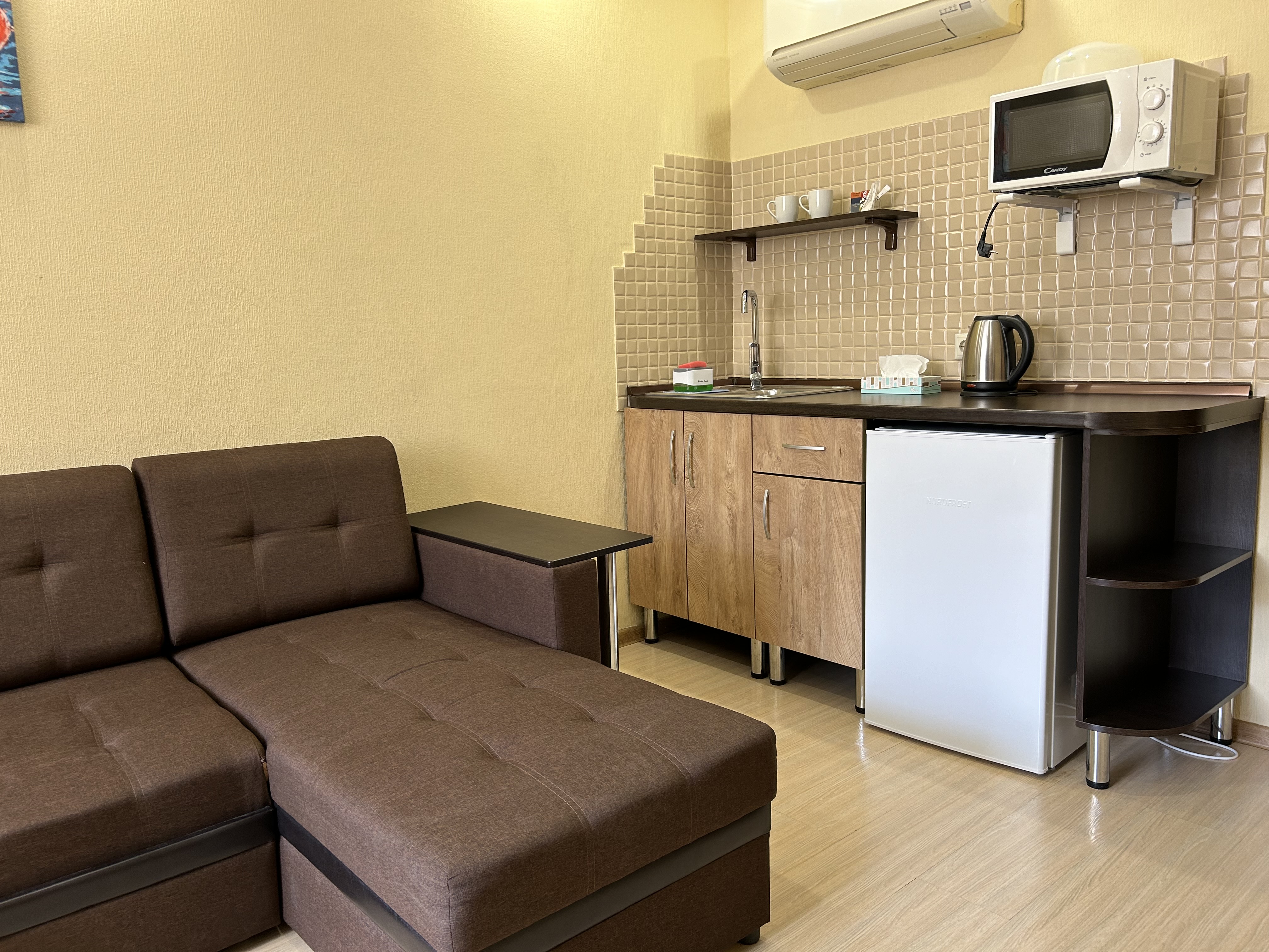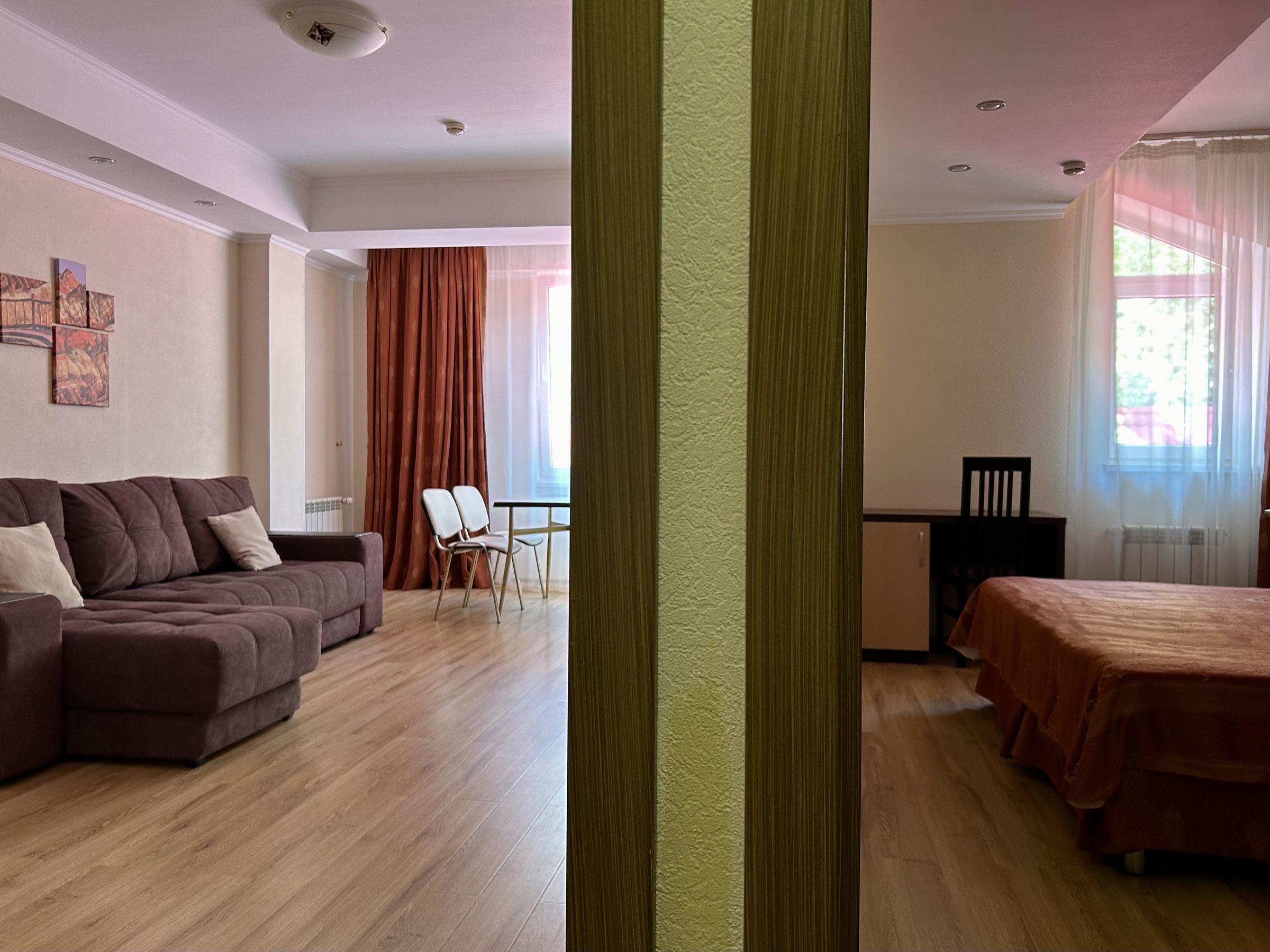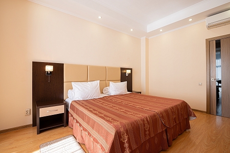 В номере: вешалка, диван раскладной, зеркало, кровать двуспальная, прикроватные тумбочки, стол, стол обеденный, стулья, шкаф, кондиционер, микроволновая печь, мини-холодильник, сейф, телевизор ЖК, чайный набор посуды, электрочайник