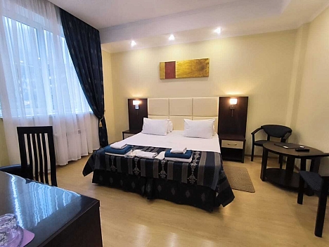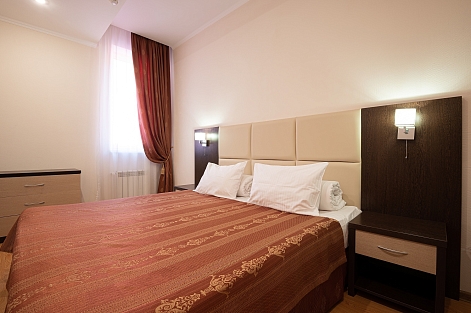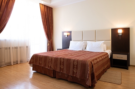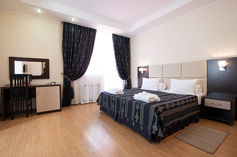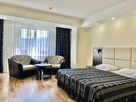 В номере: диван раскладной, зеркало, кровать двуспальная/ две полутороспальные кровати, прикроватные тумбочки, стол, стулья, шкаф, кондиционер, мини-холодильник, сейф, телевизор ЖК, чайный набор посуды, электрочайник