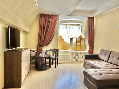 В номере: вешалка, зеркало, кресла, кресло-кровать, кровати односпальные /одна двуспальная кровать, прикроватные тумбочки, стол, столик кофейный, стул, шкаф, кондиционер, мини-холодильник, сейф, телевизор ЖК, чайный набор посуды, электрочайник