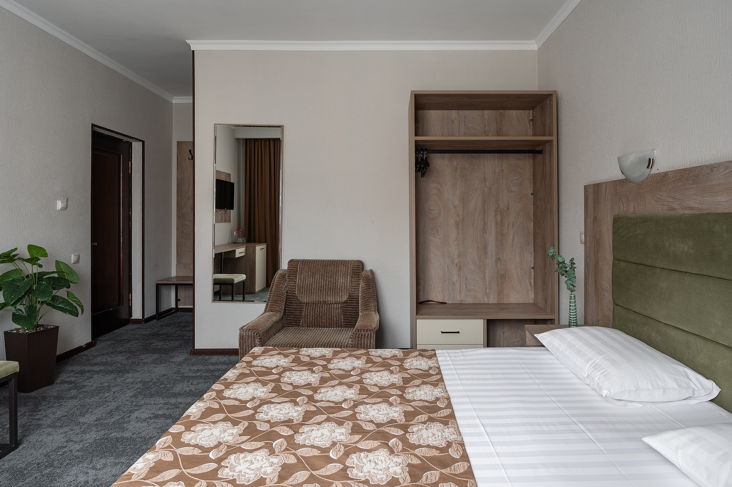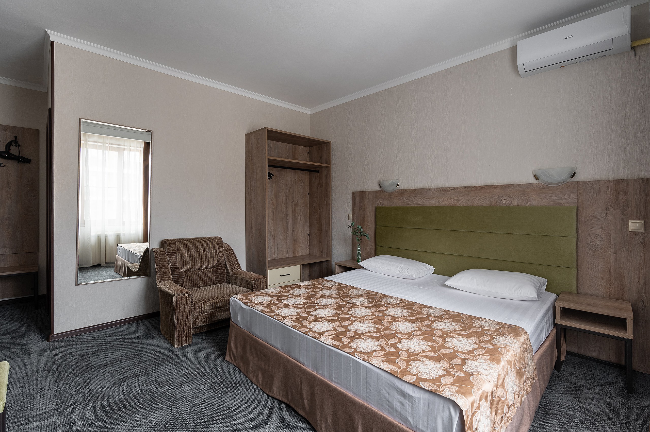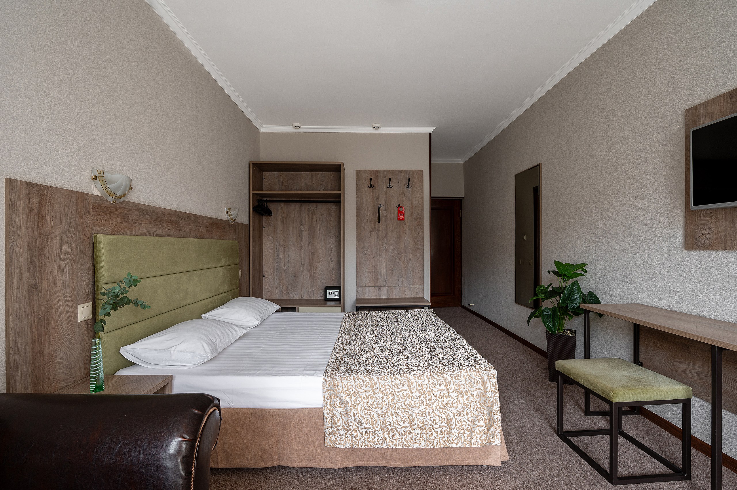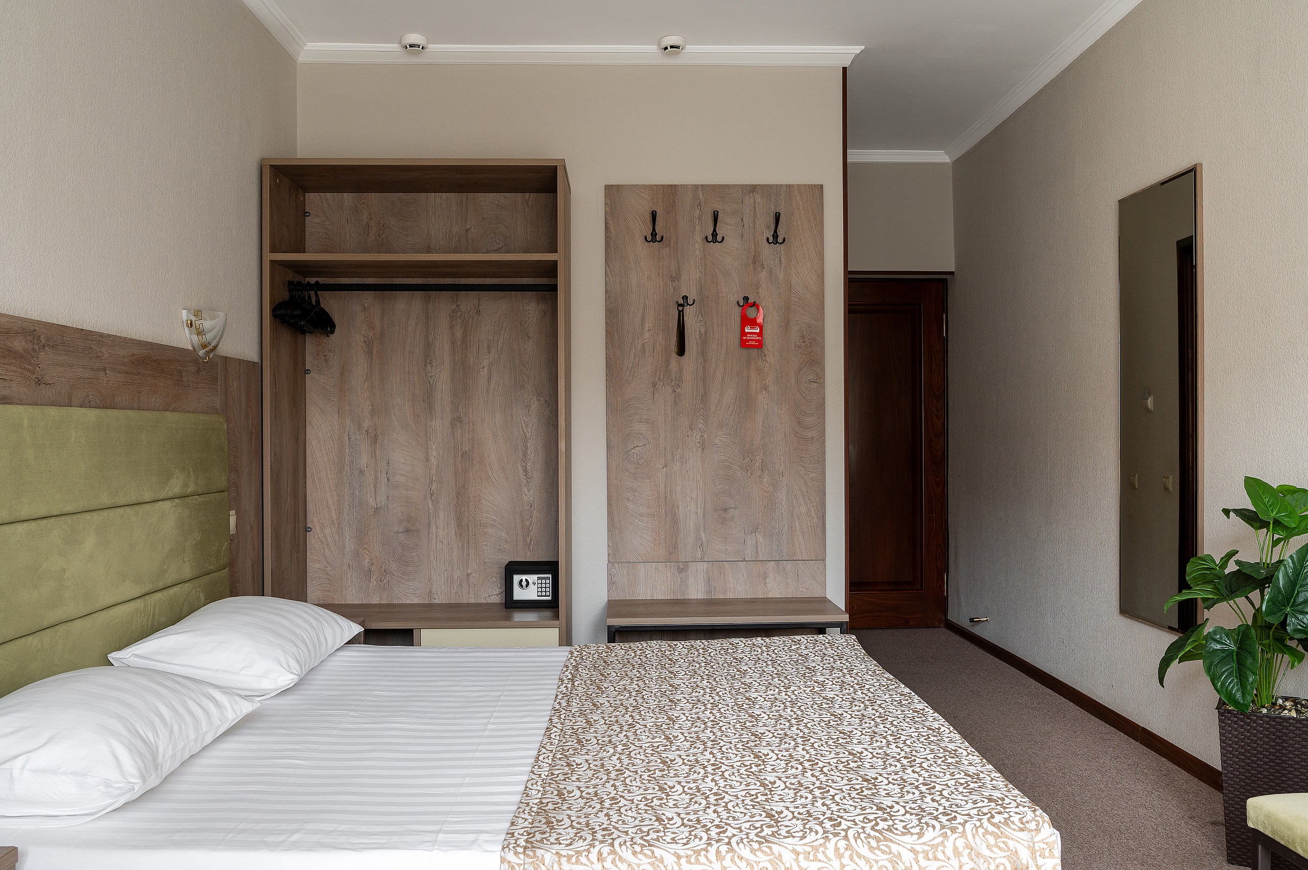 В номере: вешалка, зеркало, кровать двуспальная, прикроватные тумбочки, стол, стулья, шкаф, сплит-система, телевизор, холодильник