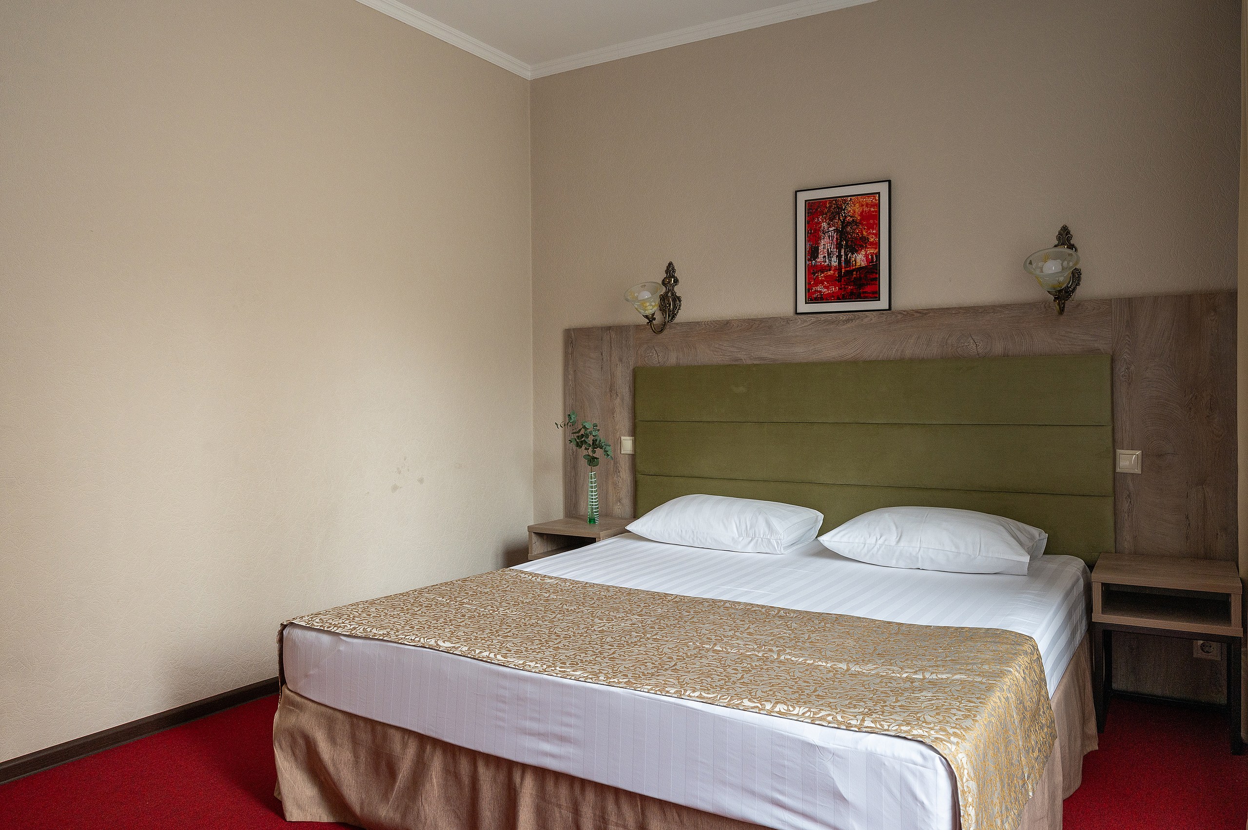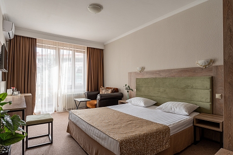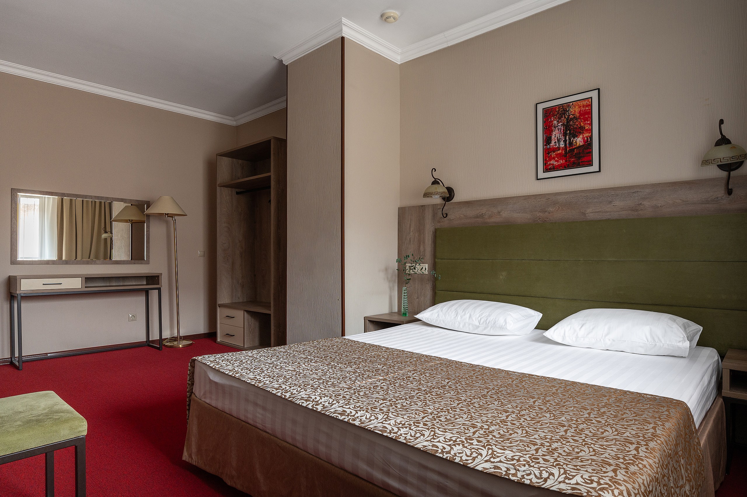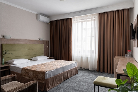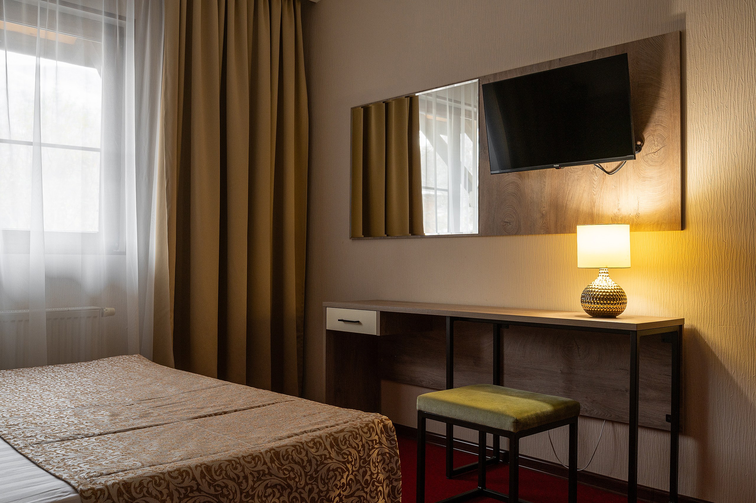 В номере: вешалка, зеркало, кровать двуспальная, прикроватные тумбочки, стол, стулья, шкаф, сплит-система, телевизор, холодильник