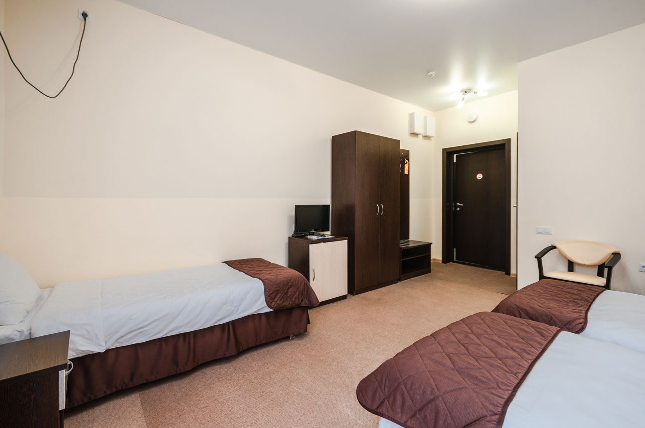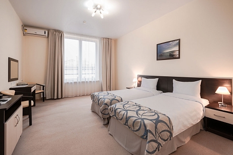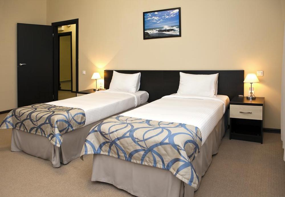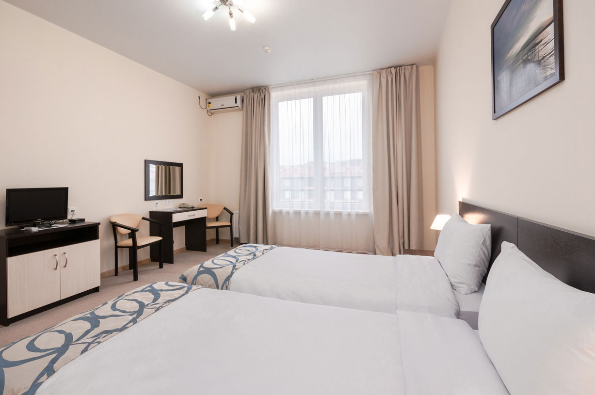 В номере: вешалка, зеркало, кровати односпальные, прикроватные тумбочки, стол, стулья, шкаф, кондиционер, мини-холодильник, телевизор