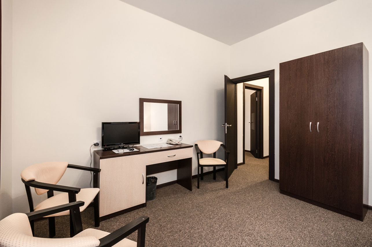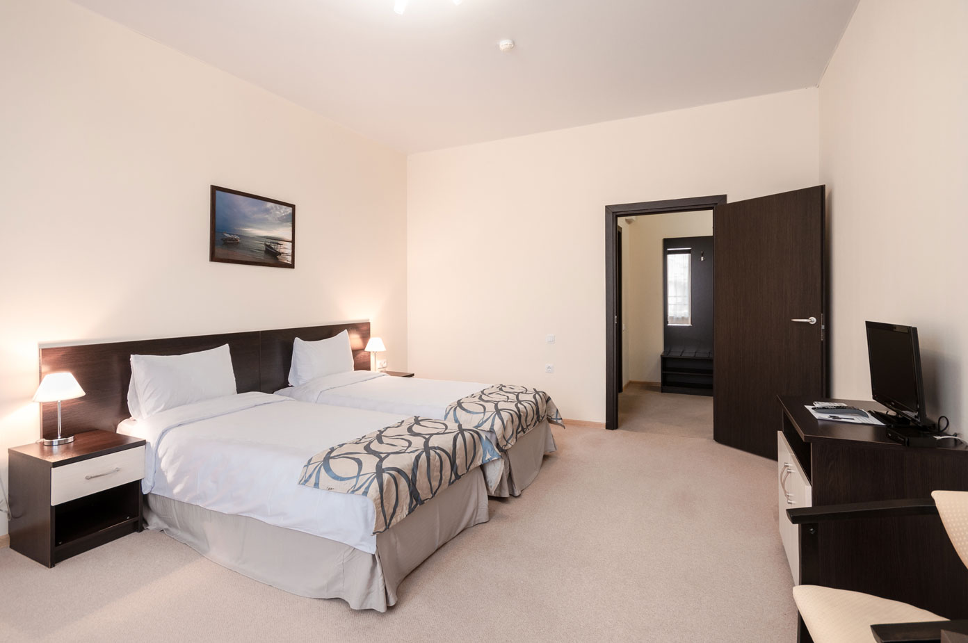 В номере: вешалка, диван раскладной, зеркало, кресло-кровать, кровати односпальные, прикроватные тумбочки, стол, стулья, шкаф, кондиционер, мини-холодильник, телевизор