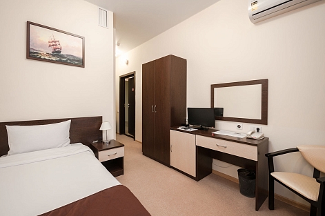 В номере: вешалка, зеркало, кровать односпальная, прикроватная тумбочка, стол, стул, шкаф, кондиционер, мини-холодильник, телевизор