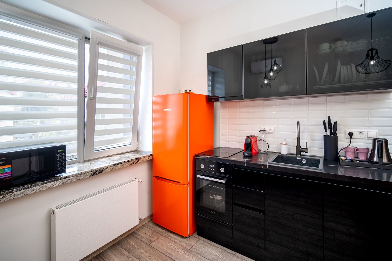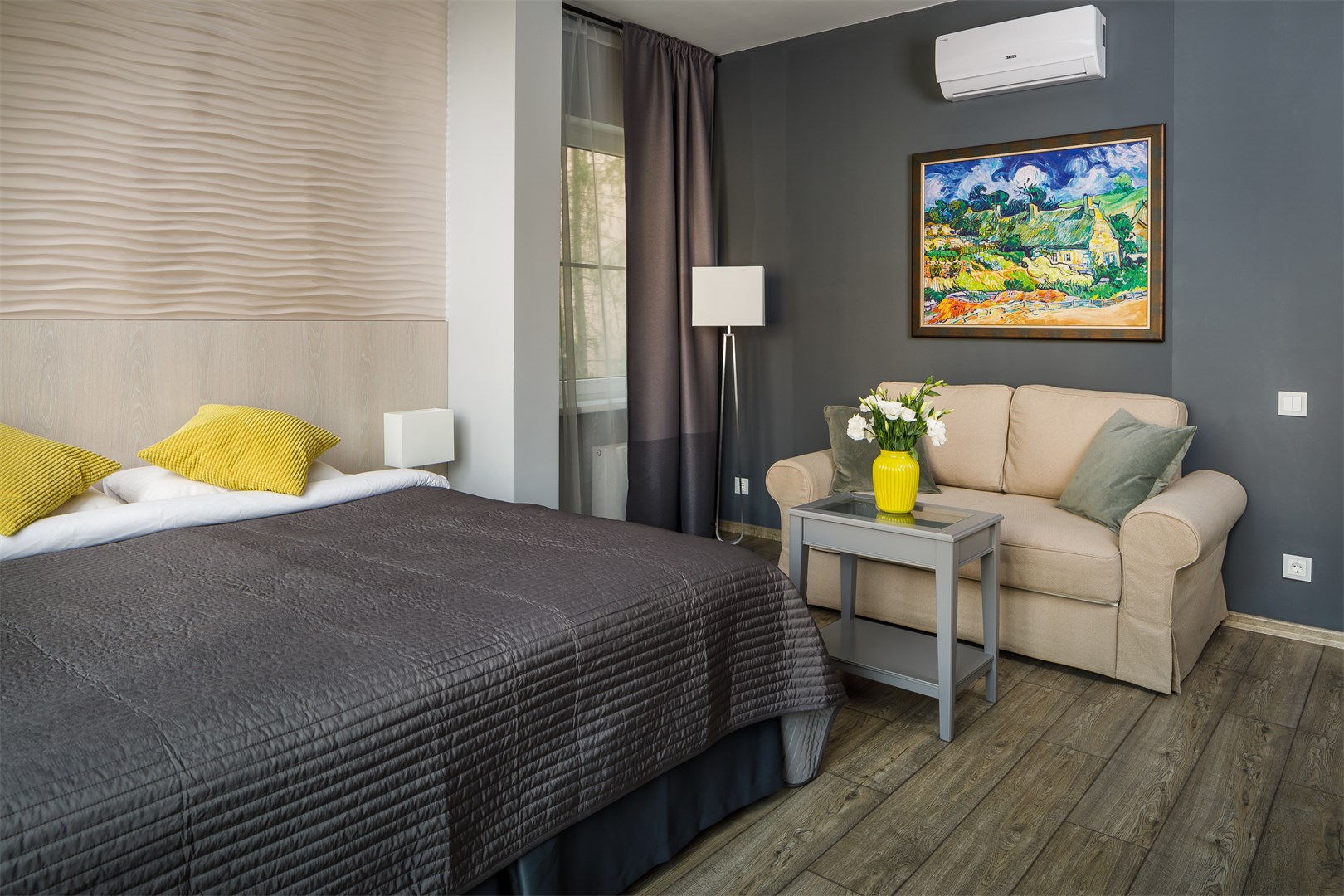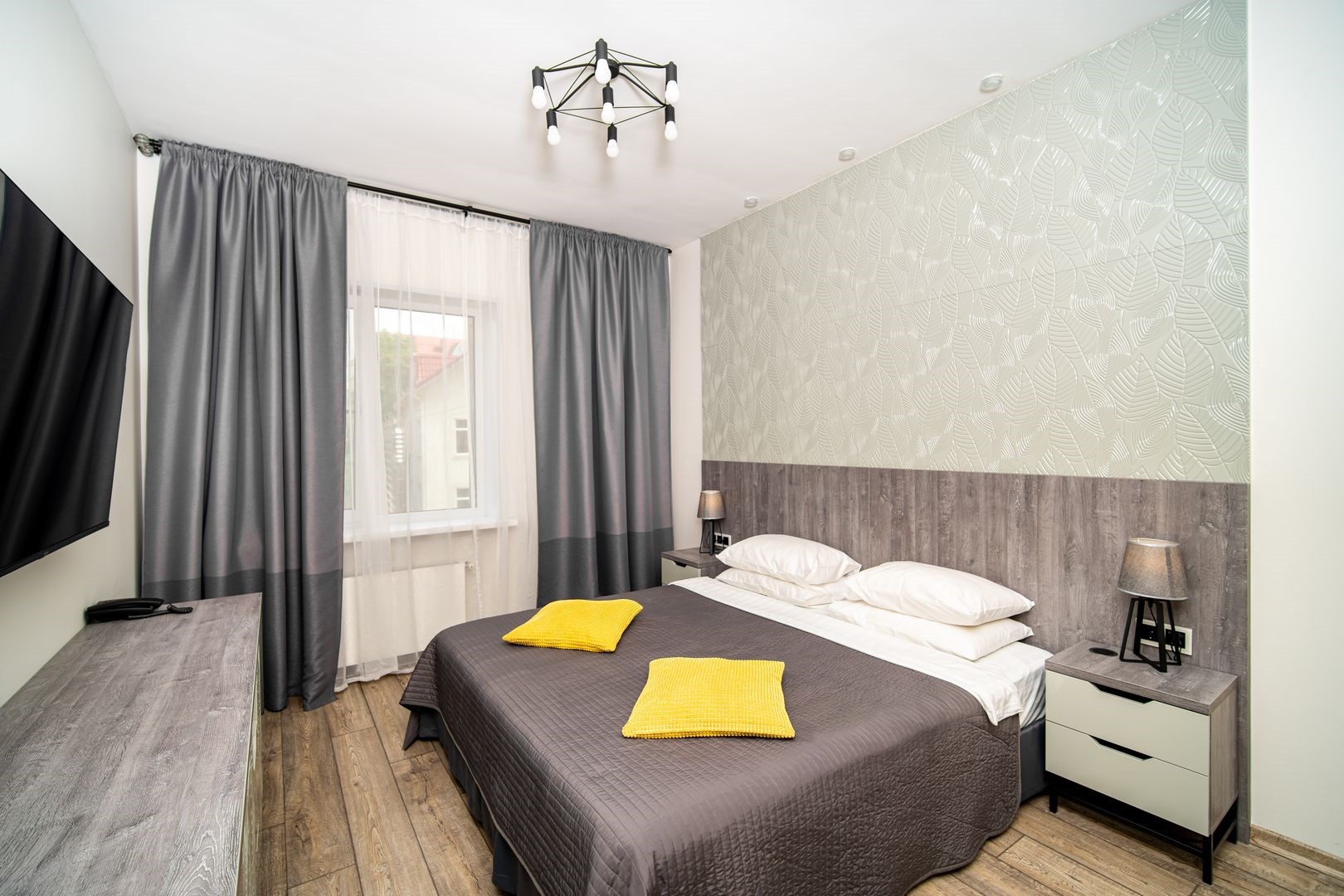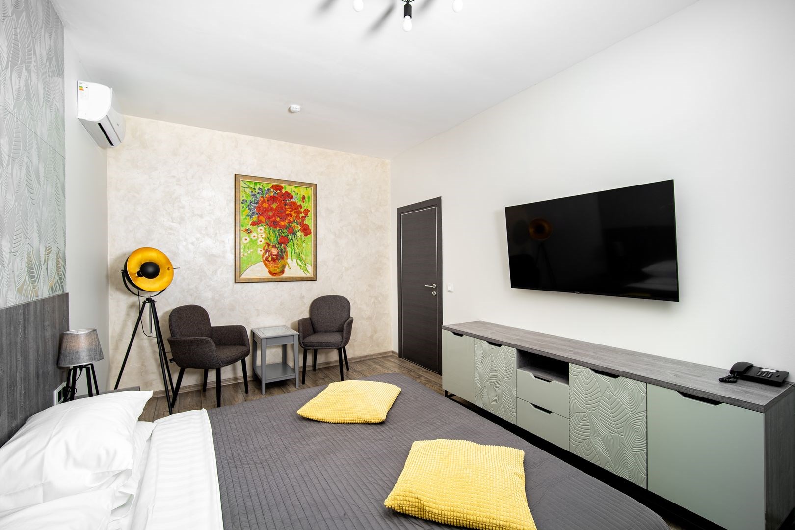 В номере: вешалка, зеркало, кровать двуспальная, прикроватные тумбочки, стол, стулья, мини-холодильник, набор посуды, плита электрическая, сейф, сплит-система, телевизор ЖК, телефон, чайный набор посуды, электрочайник