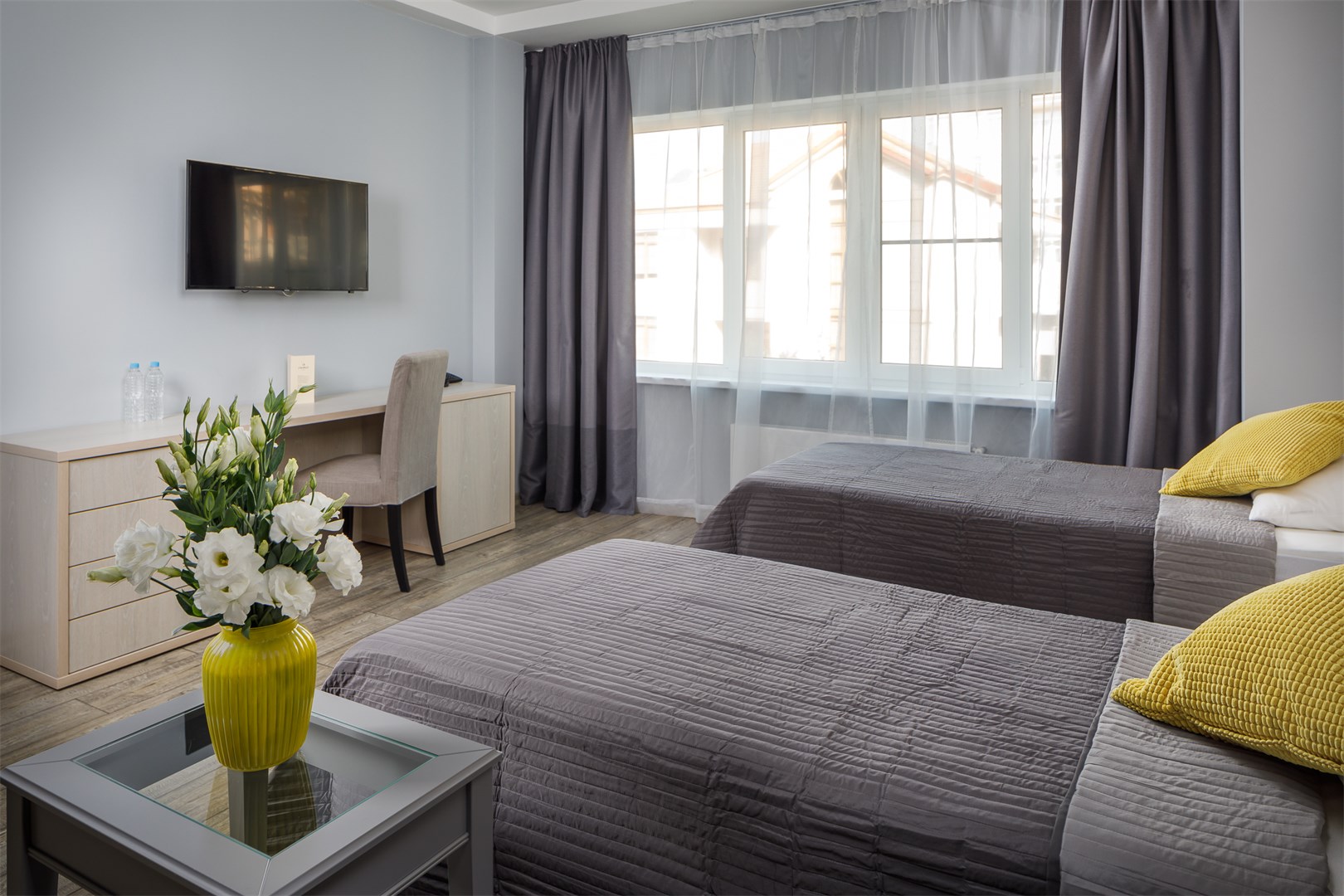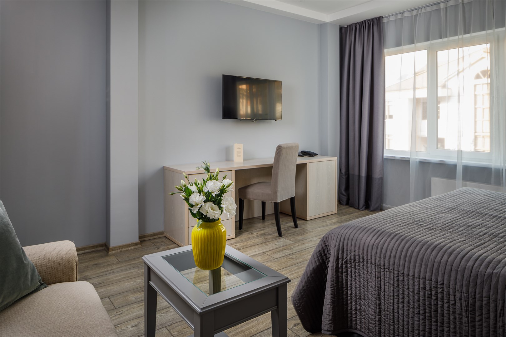 В номере: вешалка, зеркало, кровать двуспальная, прикроватные тумбочки, стол, стулья, шкаф, мини-холодильник, сейф, сплит-система, телевизор ЖК, телефон, чайный набор посуды