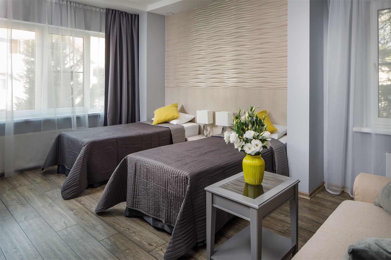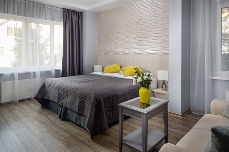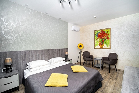 На расстоянии 3 километров разместился железнодорожный вокзал, дорога до международного аэропорта займет около получаса. Современный пятиэтажный корпус отеля (без лифта) занимает небольшую благоустроенную территорию площадью 6000 кв.м. Небольшой жилой фонд предлагает гостям двухместные номера Стандарт и Люкс. Везде стильный лаконичный интерьер, выдержанный в спокойной гамме бело-серых оттенков с добавлением акцентного желтого. Все комнаты оснащены душем, кондиционером и техникой. При отеле работает ресторан, где гости могу заказать завтраки обеды и ужины. В распоряжении отдыхающих сауна, беспроводной интернет. Для автовладельцев возле корпуса организована охраняемая парковка. В 5 минутах езды от отеля расположился городской галечный пляж. На Черноморском побережье хорошо развита пляжная инфраструктура - установлены раздевалки, есть навесы, лежаки работает прокат шезлонгов, отдыхающим доступны водные развлечения.