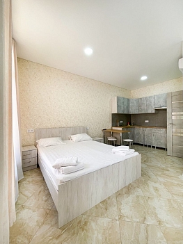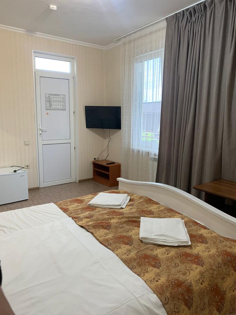 В номере: зеркало, кровать двуспальная, стол, стул, шкаф, кондиционер, набор посуды, телевизор, холодильник, чайный набор посуды, электрочайник