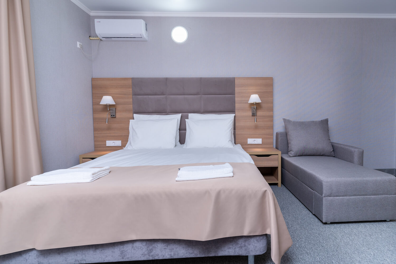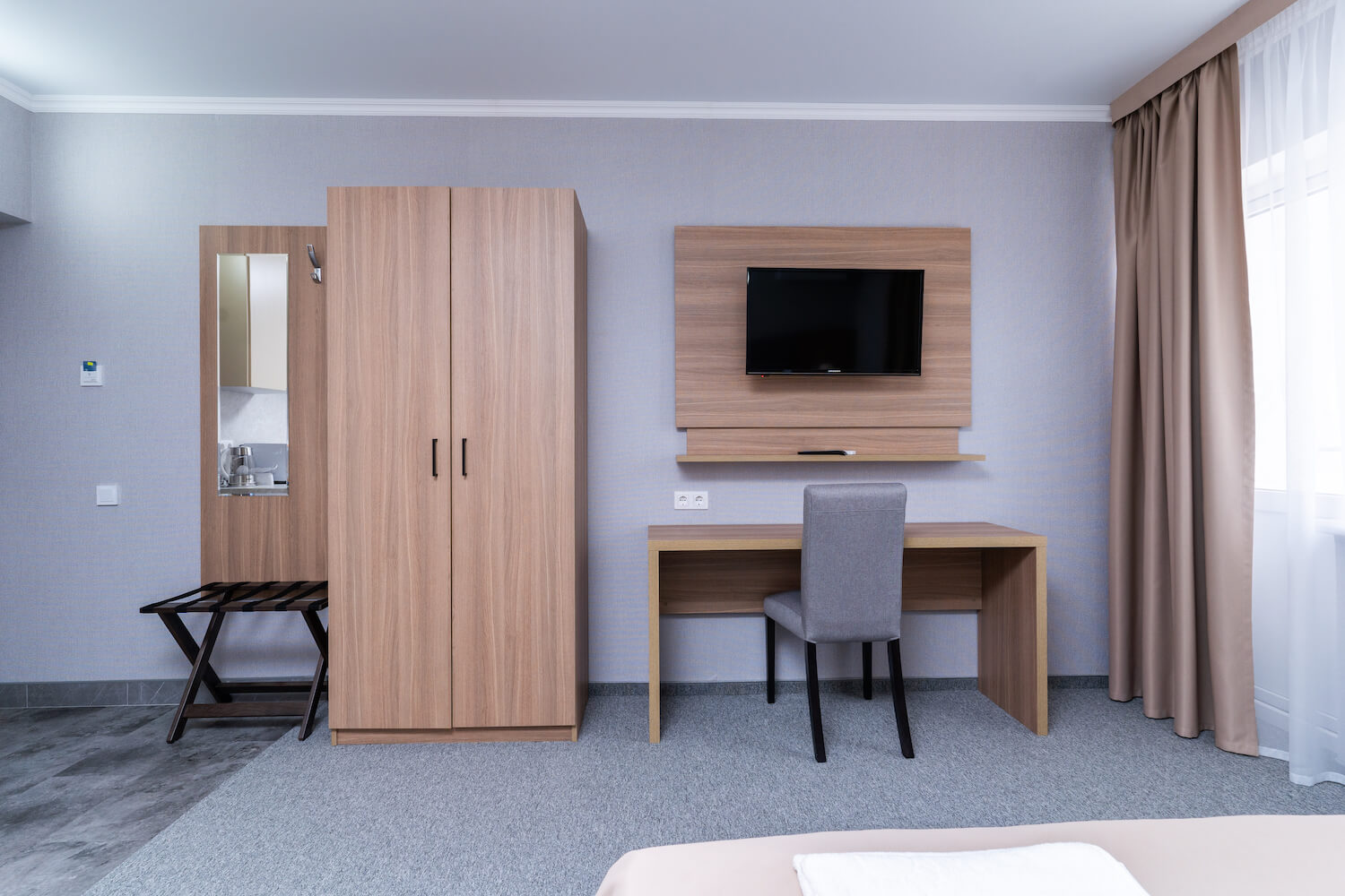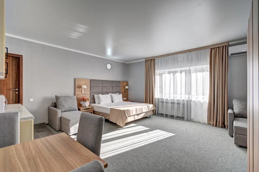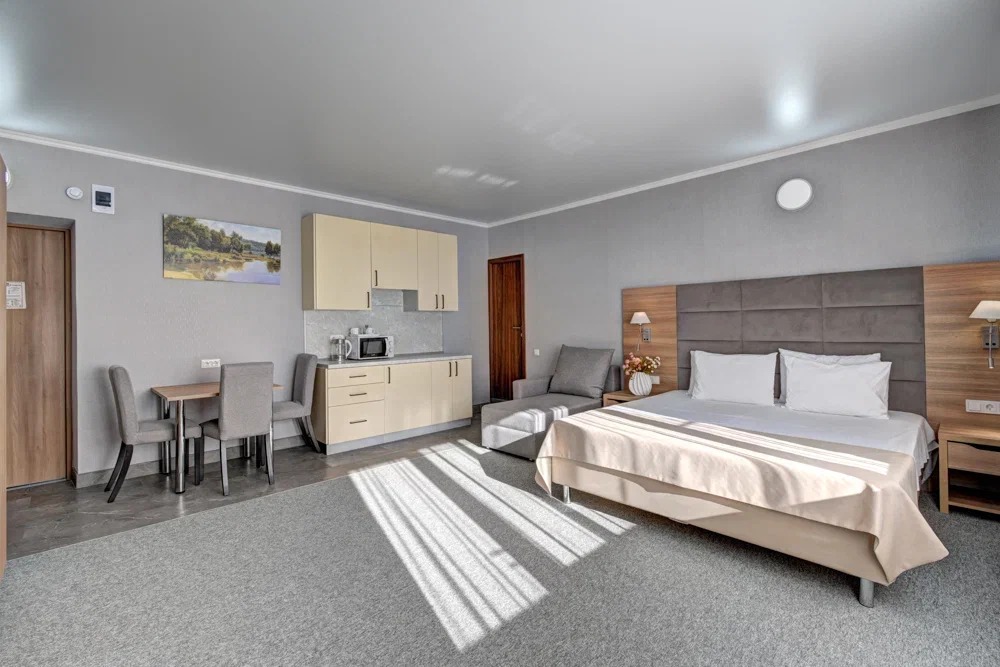 В номере: вешалка, зеркало, кресло-кровать, кровати односпальные /одна двуспальная кровать, кухонная мебель, прикроватные тумбочки, стол, стул, шкаф, кондиционер, микроволновая печь, сейф, телевизор, холодильник, чайный набор посуды, электрочайник
