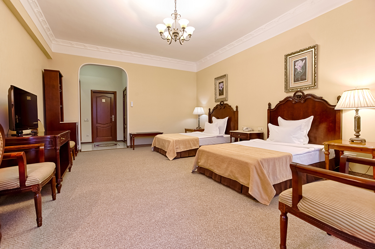В номере: вешалка, зеркало, кровати односпальные, прикроватные тумбочки, стол, стулья, шкаф, кондиционер, сейф, телевизор ЖК, телефон
