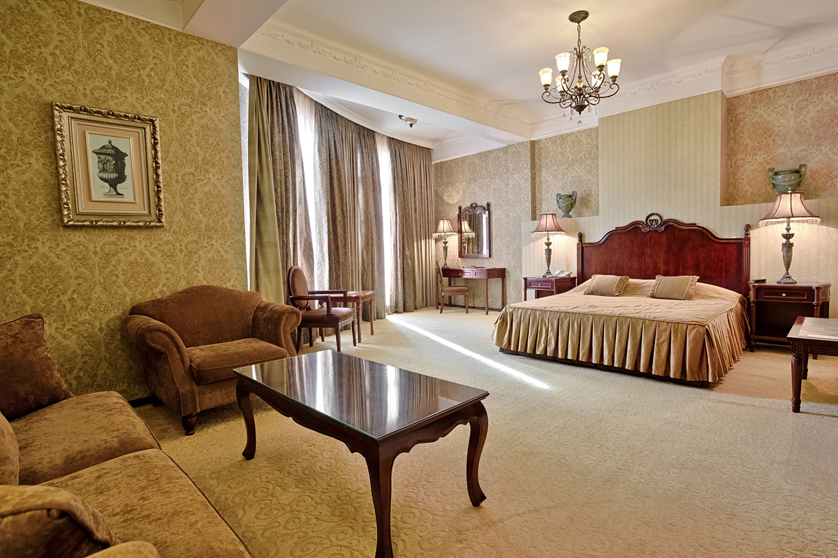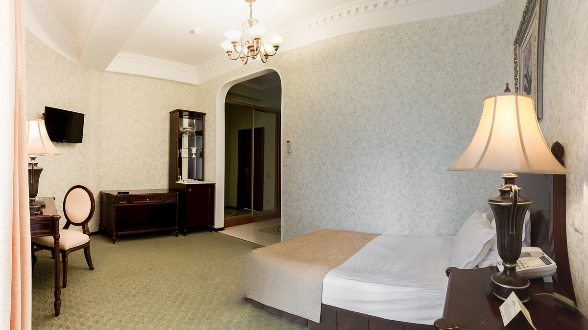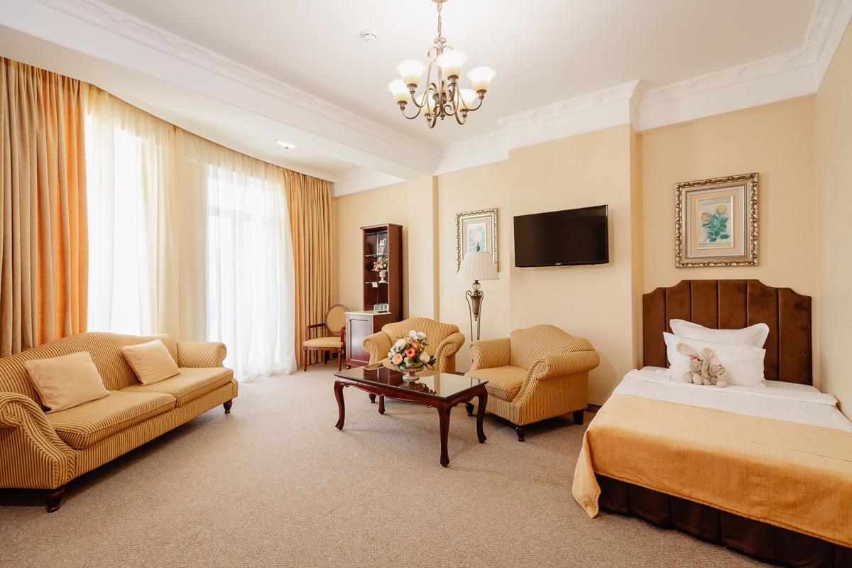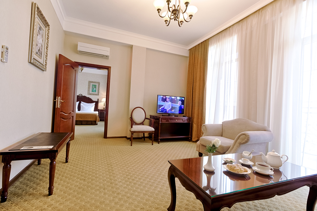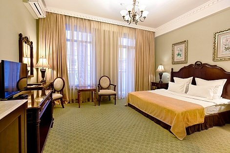В номере: вешалка, зеркало, кровать двуспальная, набор мягкой мебели, прикроватные тумбочки, стол, стулья, шкаф, кондиционер, сейф, телевизор ЖК, телефон