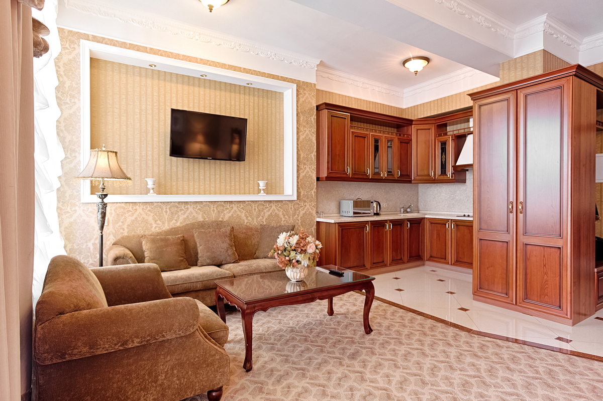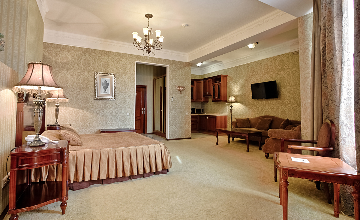 В номере: вешалка, зеркало, кровать двуспальная, кухонная мебель, набор мягкой мебели, прикроватные тумбочки, стол, стулья, шкаф, кондиционер, сейф, телевизор ЖК, телефон