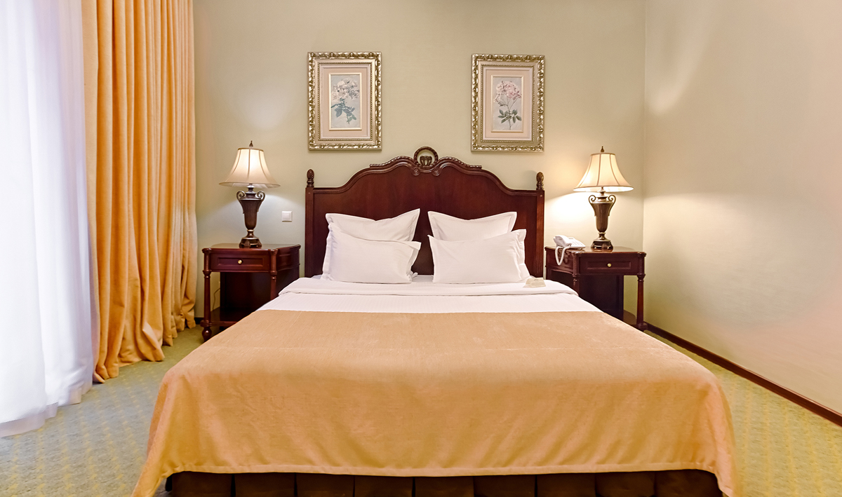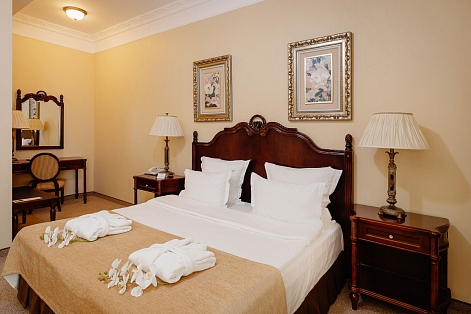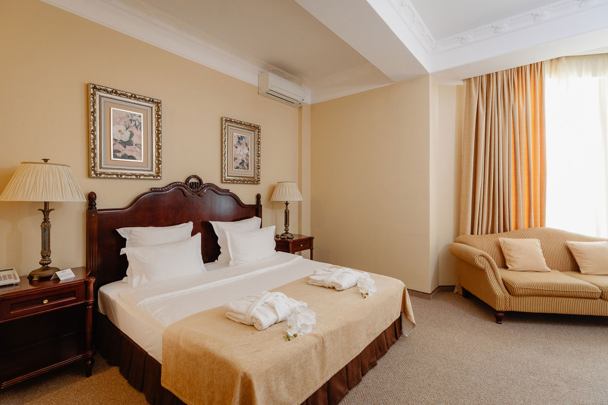 В номере: вешалка, зеркало, кровать двуспальная, набор мягкой мебели, прикроватные тумбочки, стол, стул, шкаф, кондиционер, сейф, телевизор ЖК, телефон
