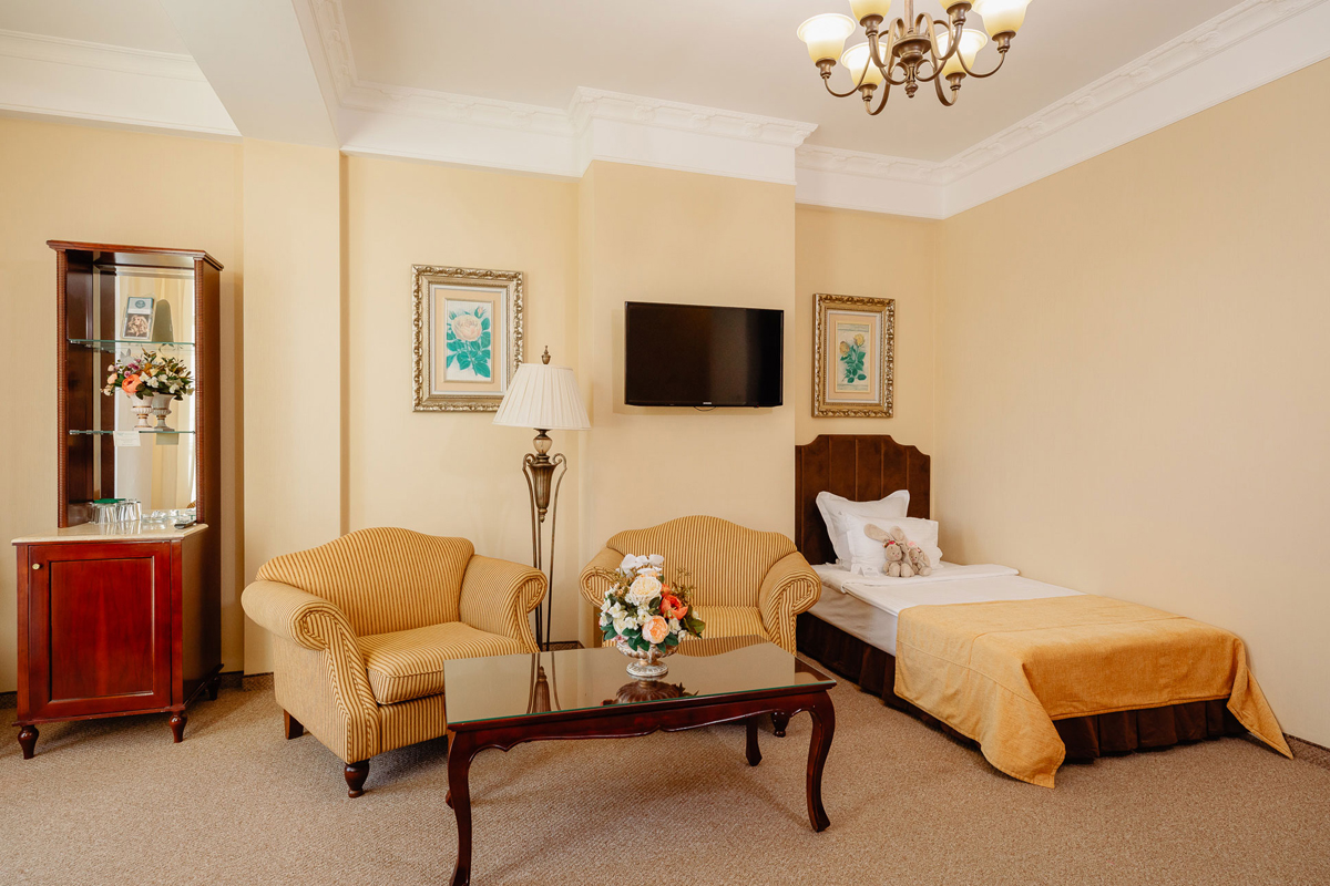 В номере: вешалка, зеркало, кровать односпальная, прикроватная тумбочка, стол, стул, шкаф, кондиционер, сейф, телевизор ЖК, телефон