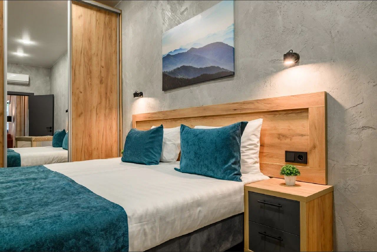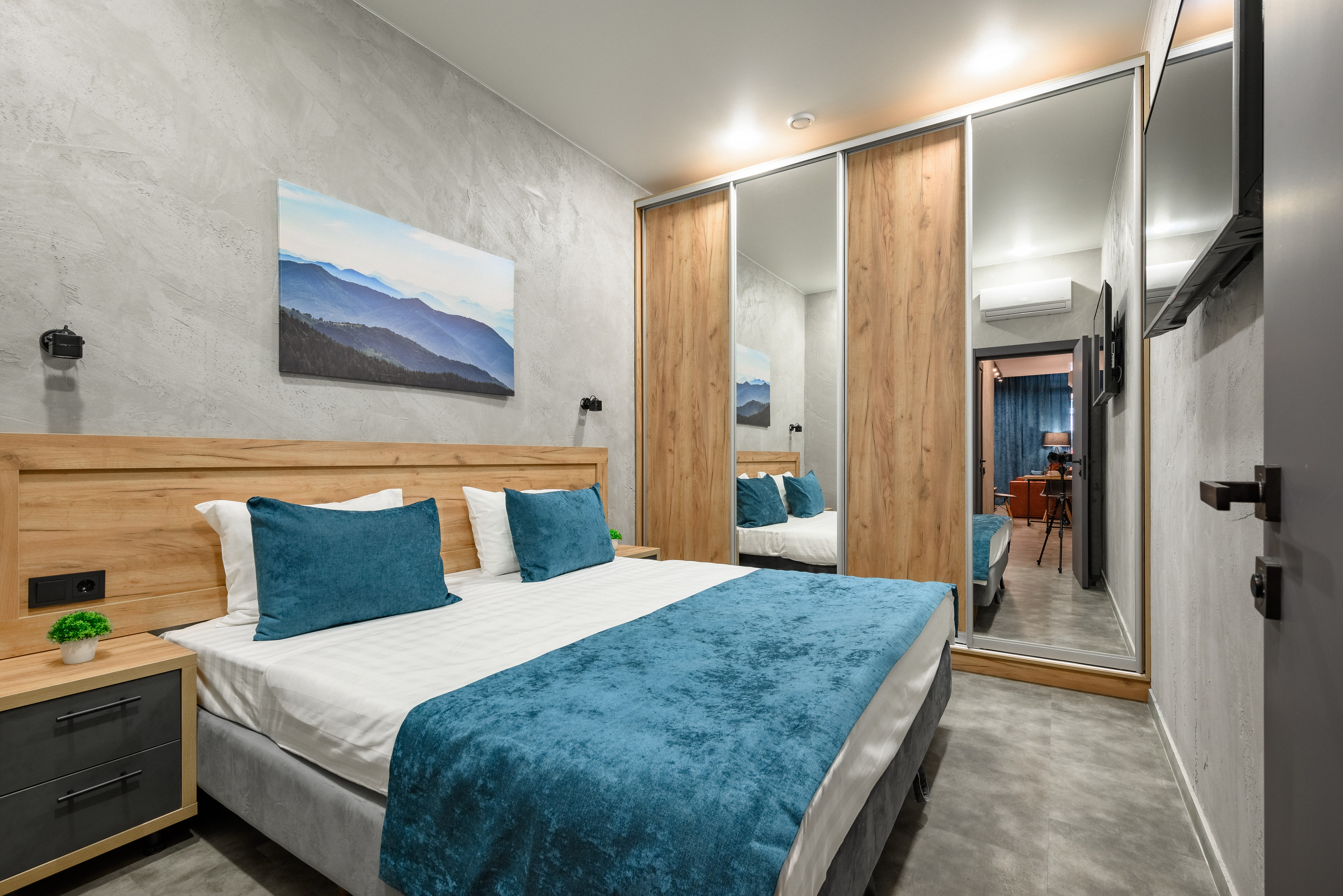 В номере: диван раскладной, кровать двуспальная, прикроватные тумбочки, стол, стулья, шкаф, гладильная доска, кондиционер, микроволновая печь, сейф, телевизор, утюг, холодильник