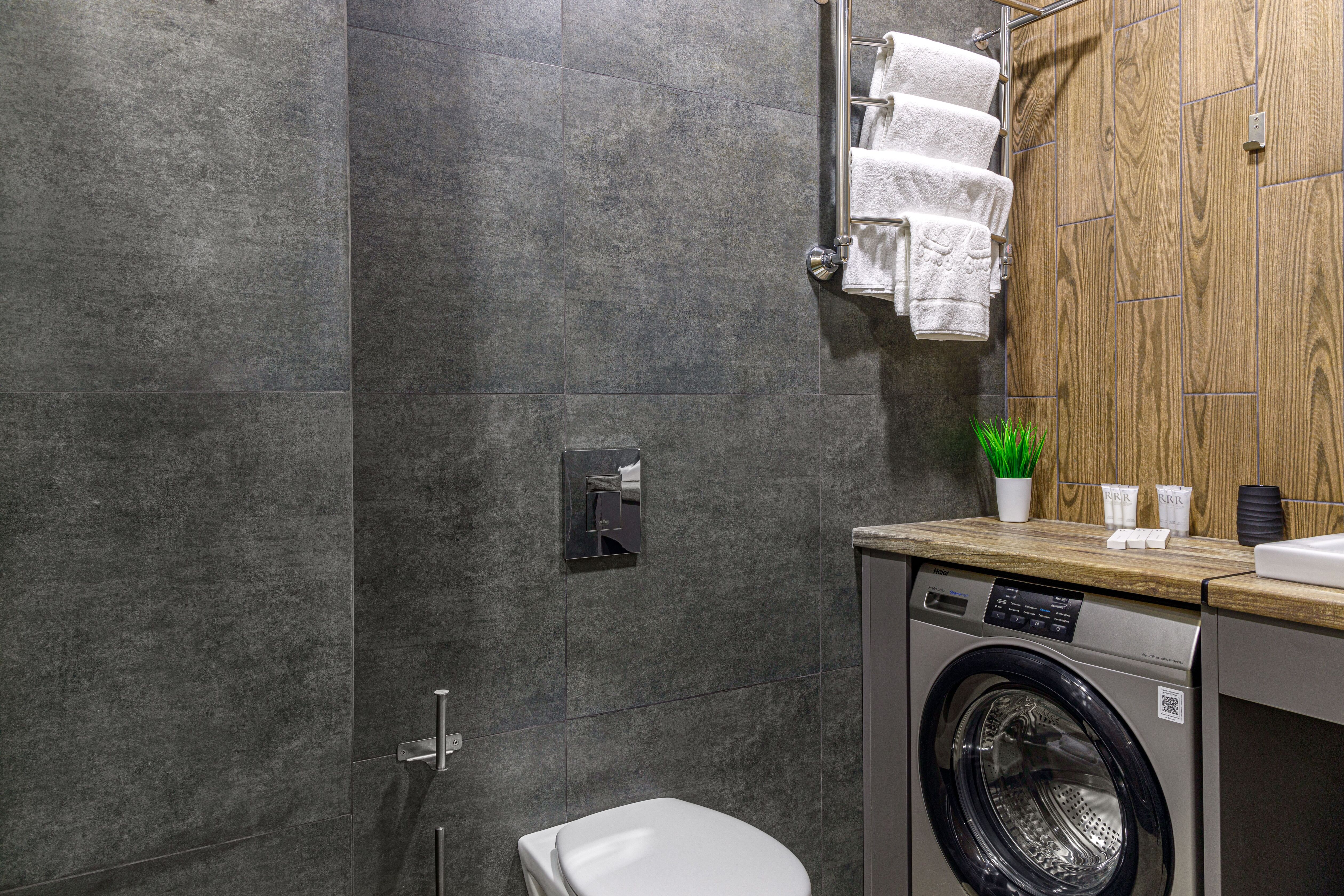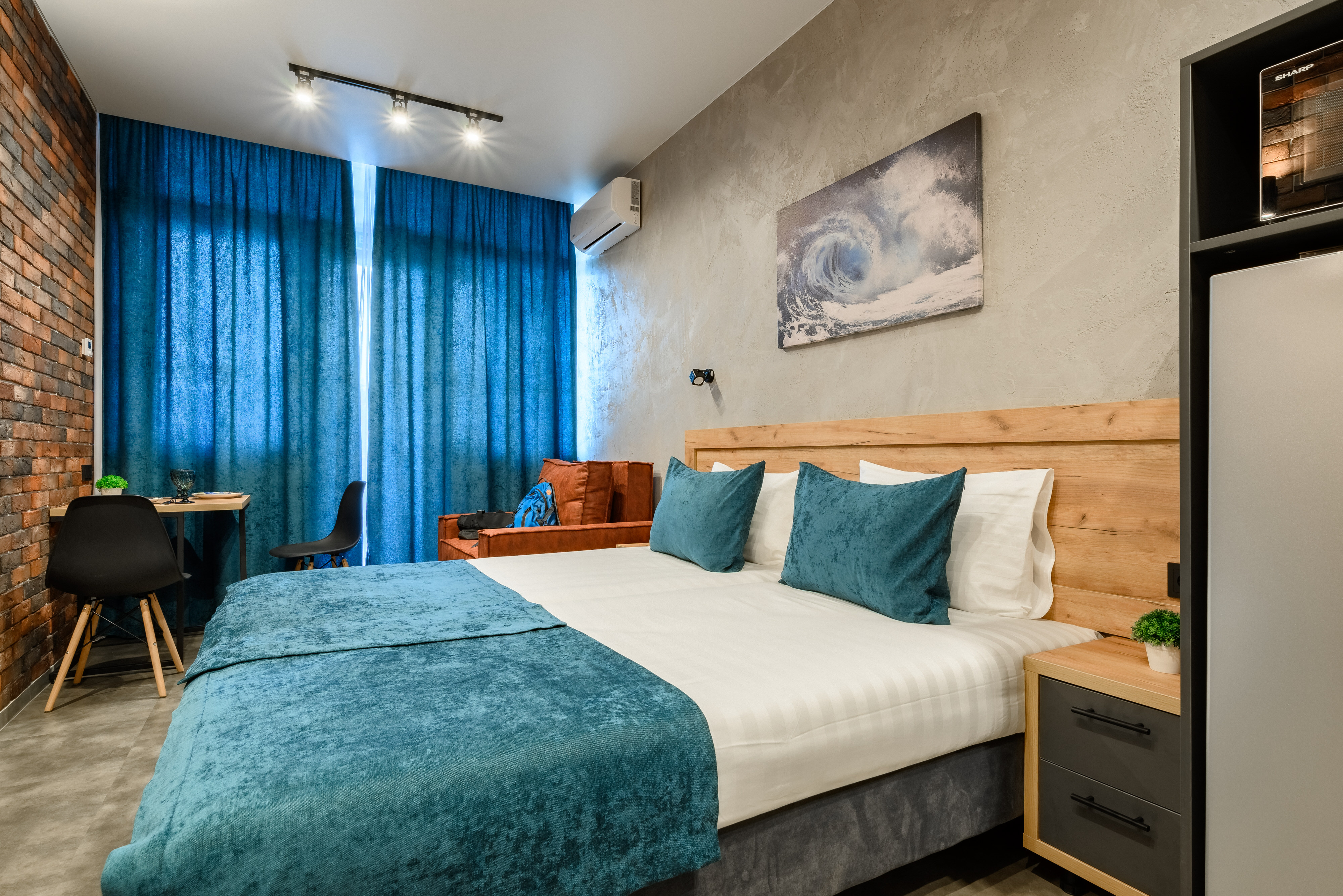 В номере: кровать двуспальная, прикроватные тумбочки, стол, стулья, шкаф, гладильная доска, кондиционер, микроволновая печь, сейф, стиральная машина, телевизор, утюг, холодильник