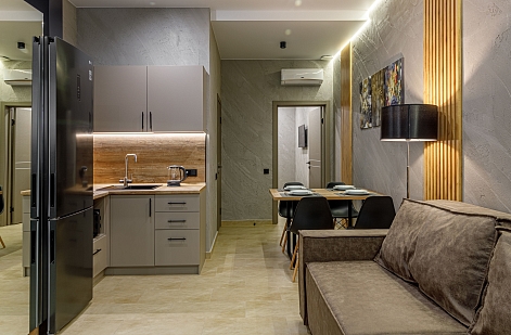 В номере: кресло-кровать, кровать двуспальная, прикроватные тумбочки, стол, стулья, шкаф, гладильная доска, кондиционер, микроволновая печь, сейф, стиральная машина, телевизор, утюг, холодильник