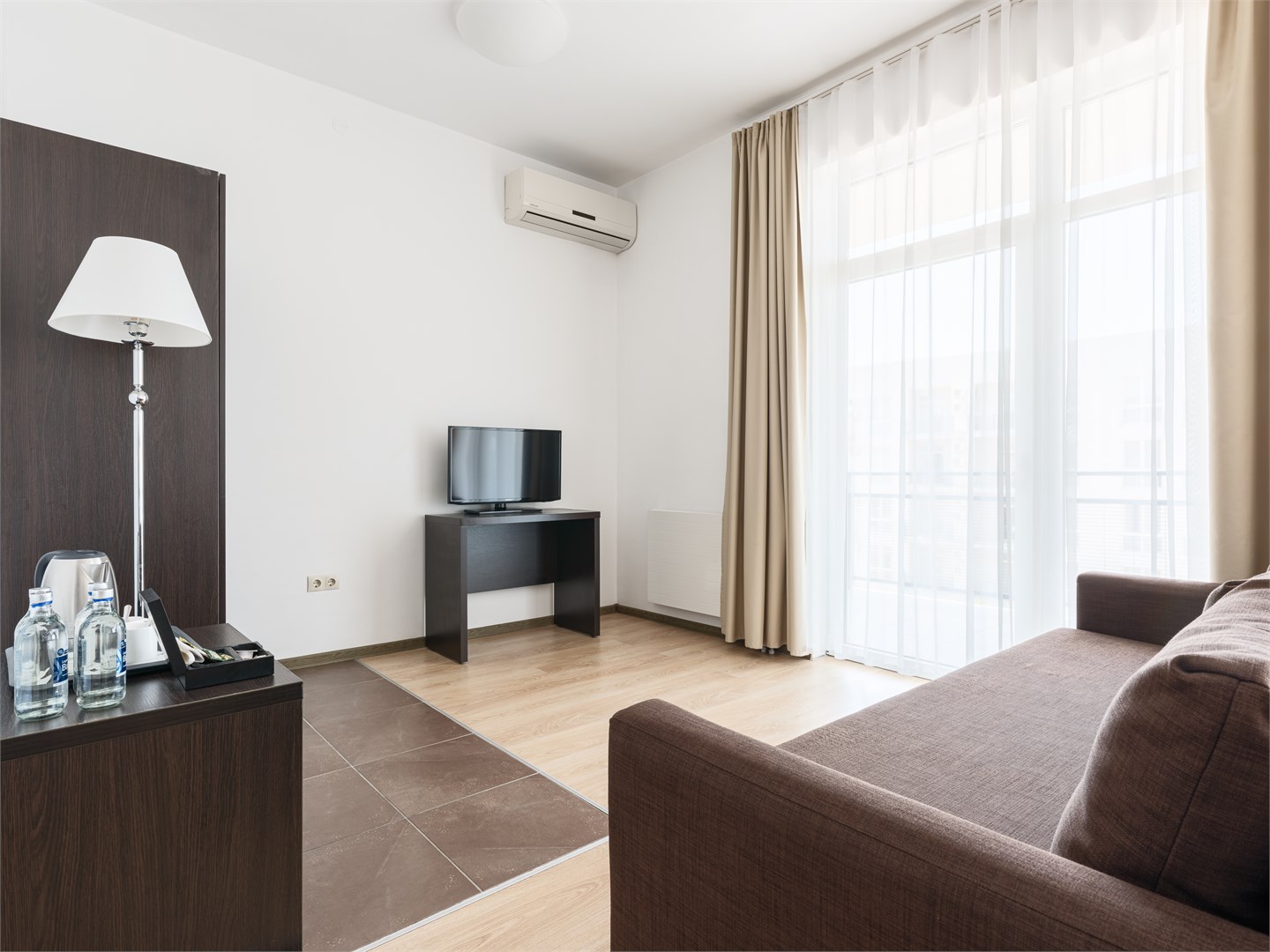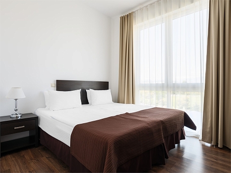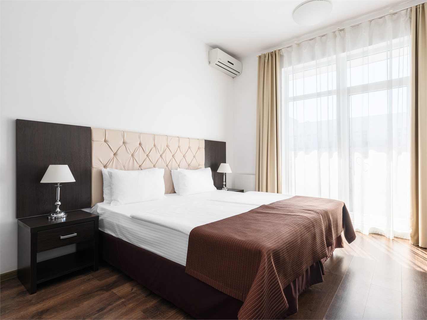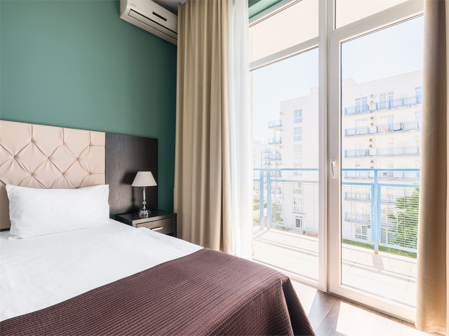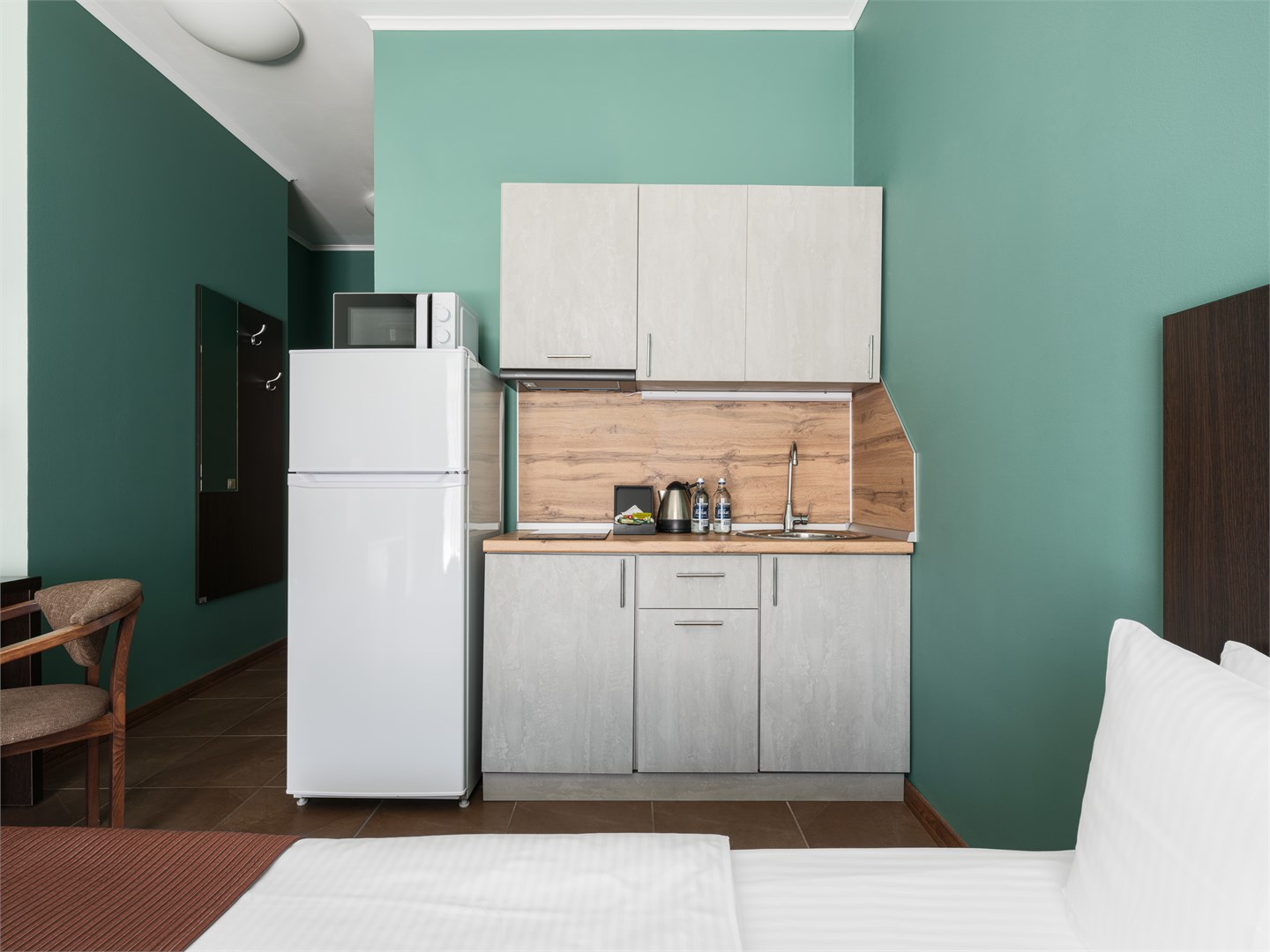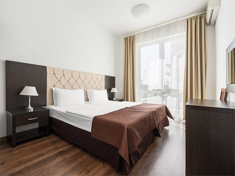 В номере: вешалка, диван раскладной, зеркало, кровать двуспальная, стол, стулья, шкаф, кондиционер, микроволновая печь, мини-холодильник, телевизор, телефон